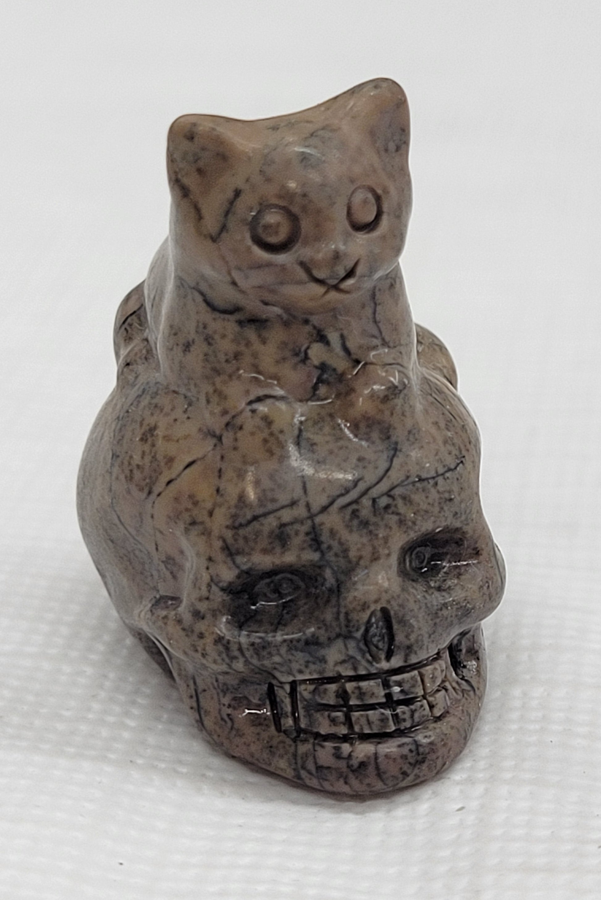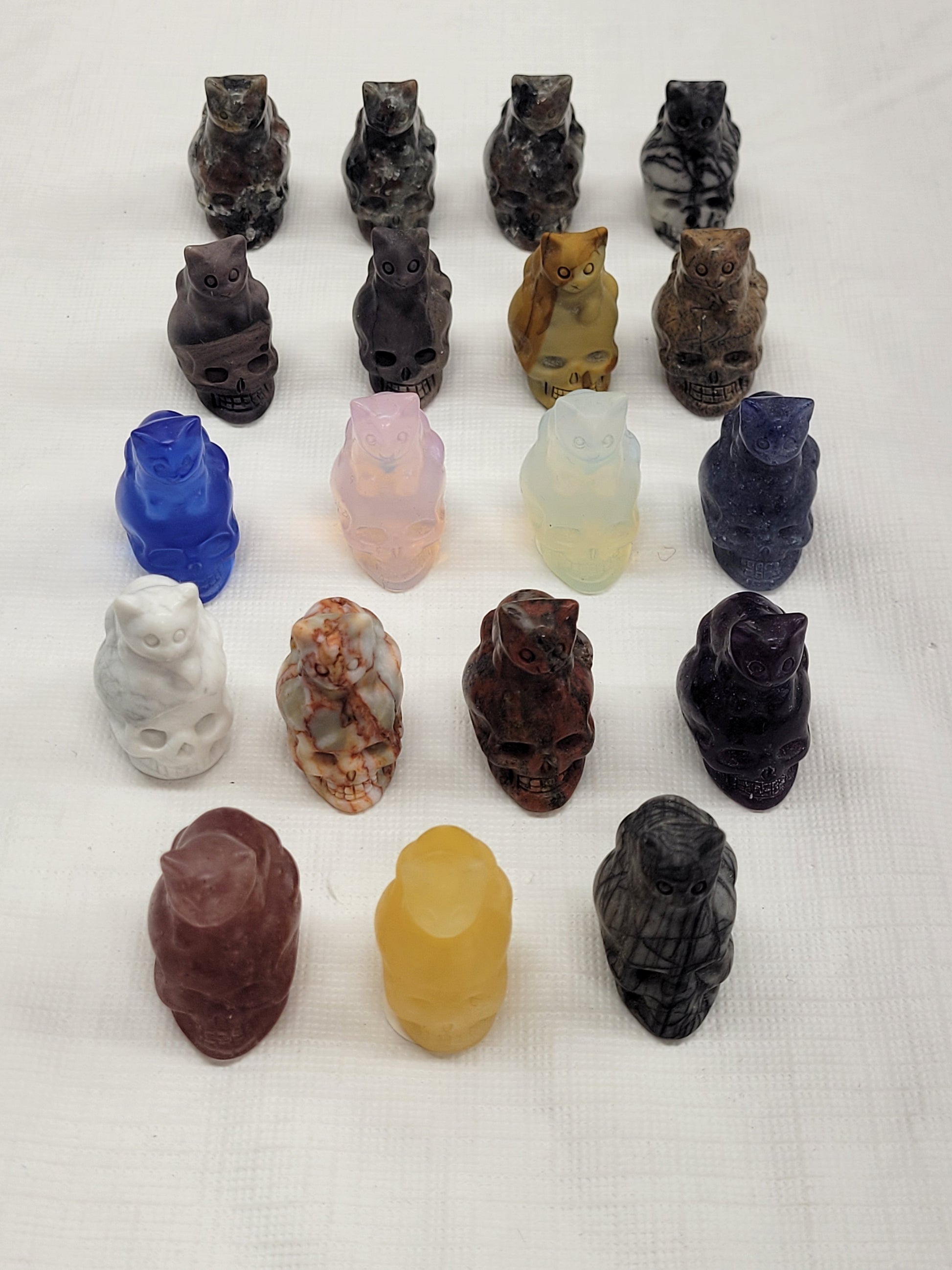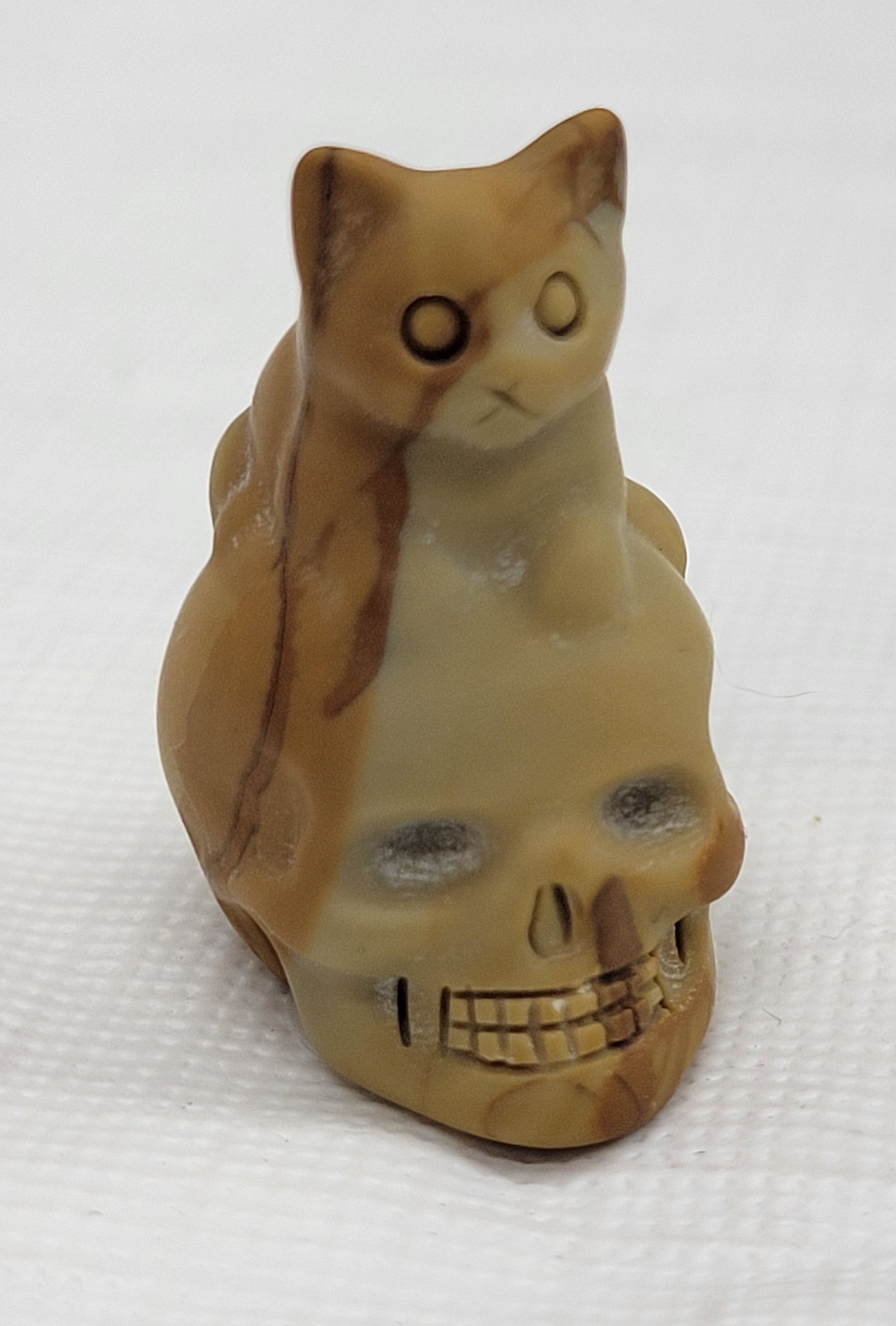Cute mini skulls with a cat sitting on top. A variety of materials is available. Each skull measures just over 1" tall.