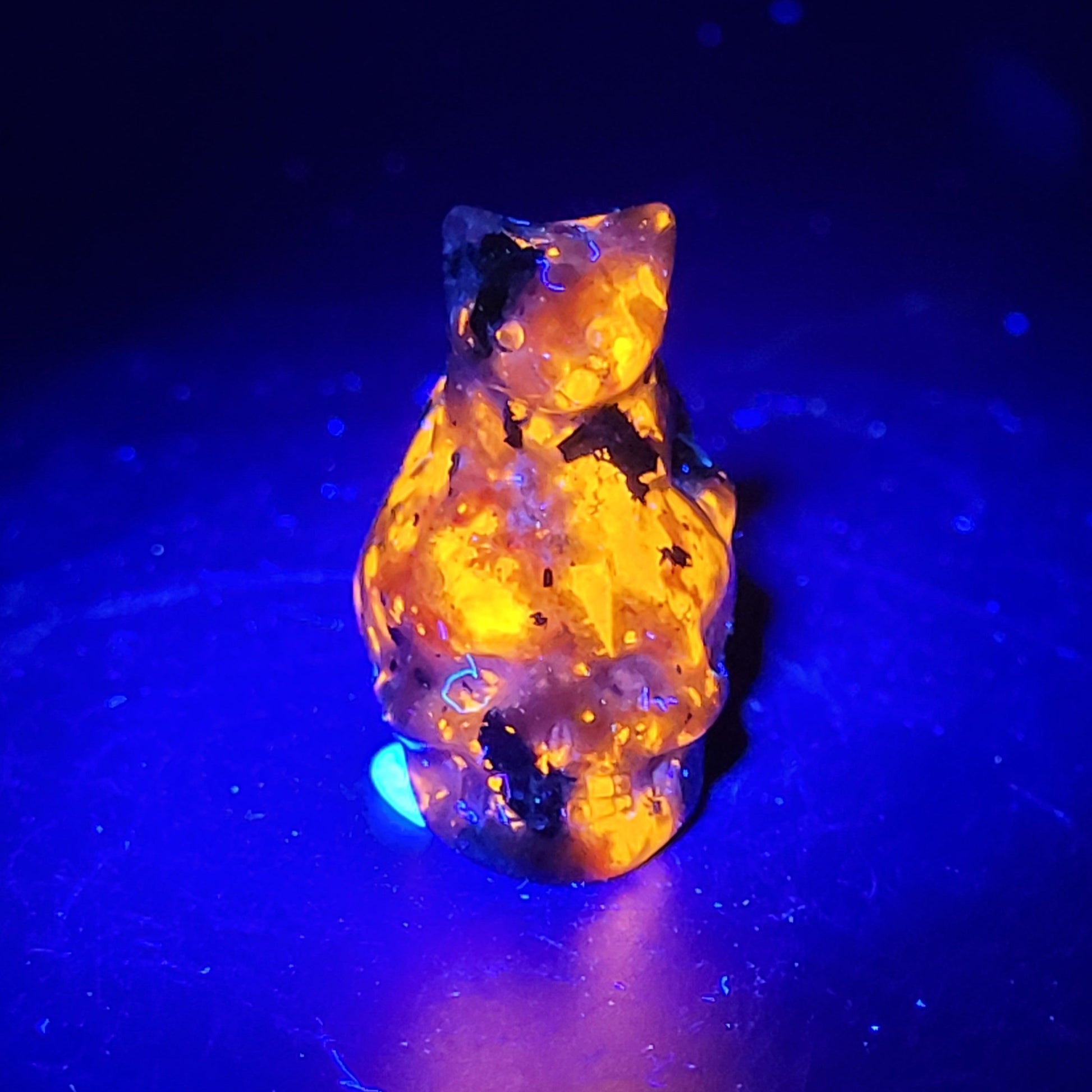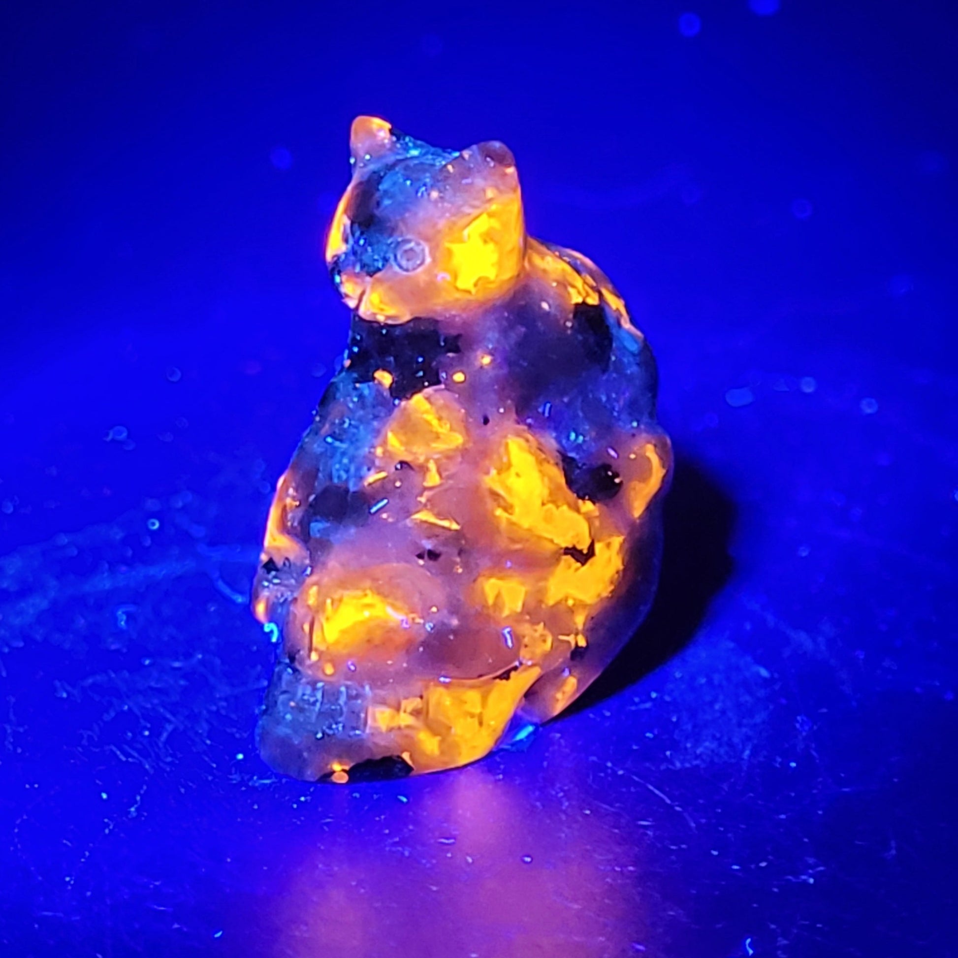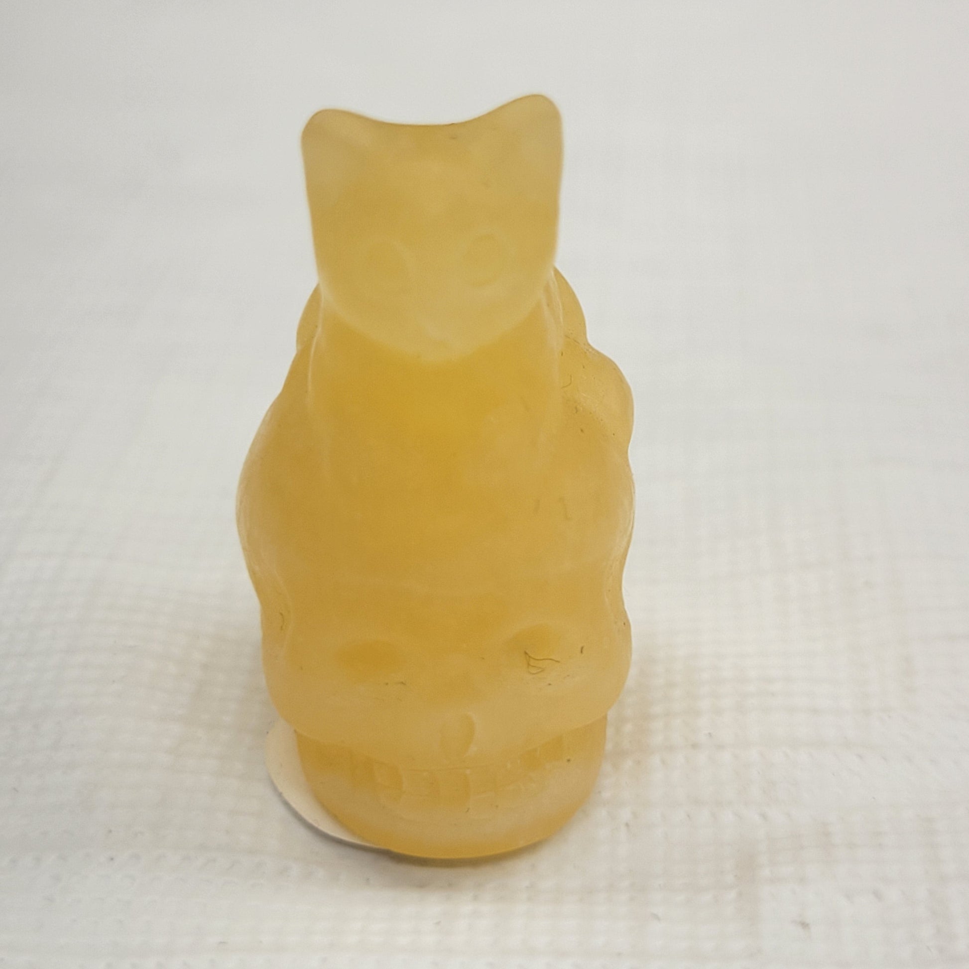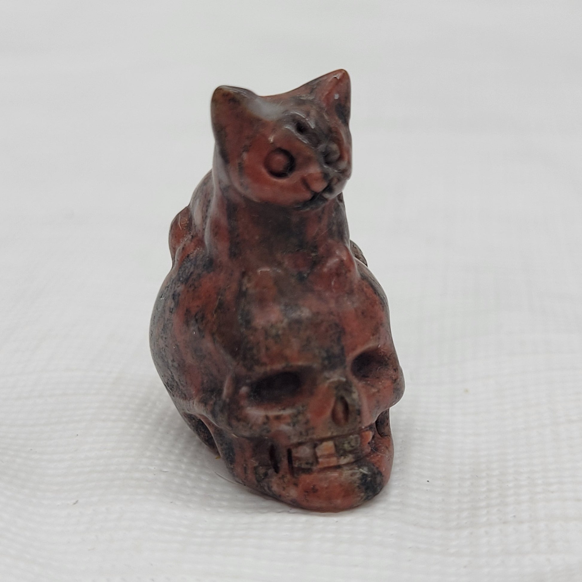 Cute mini skulls with a cat sitting on top. A variety of materials is available. Each skull measures just over 1" tall.