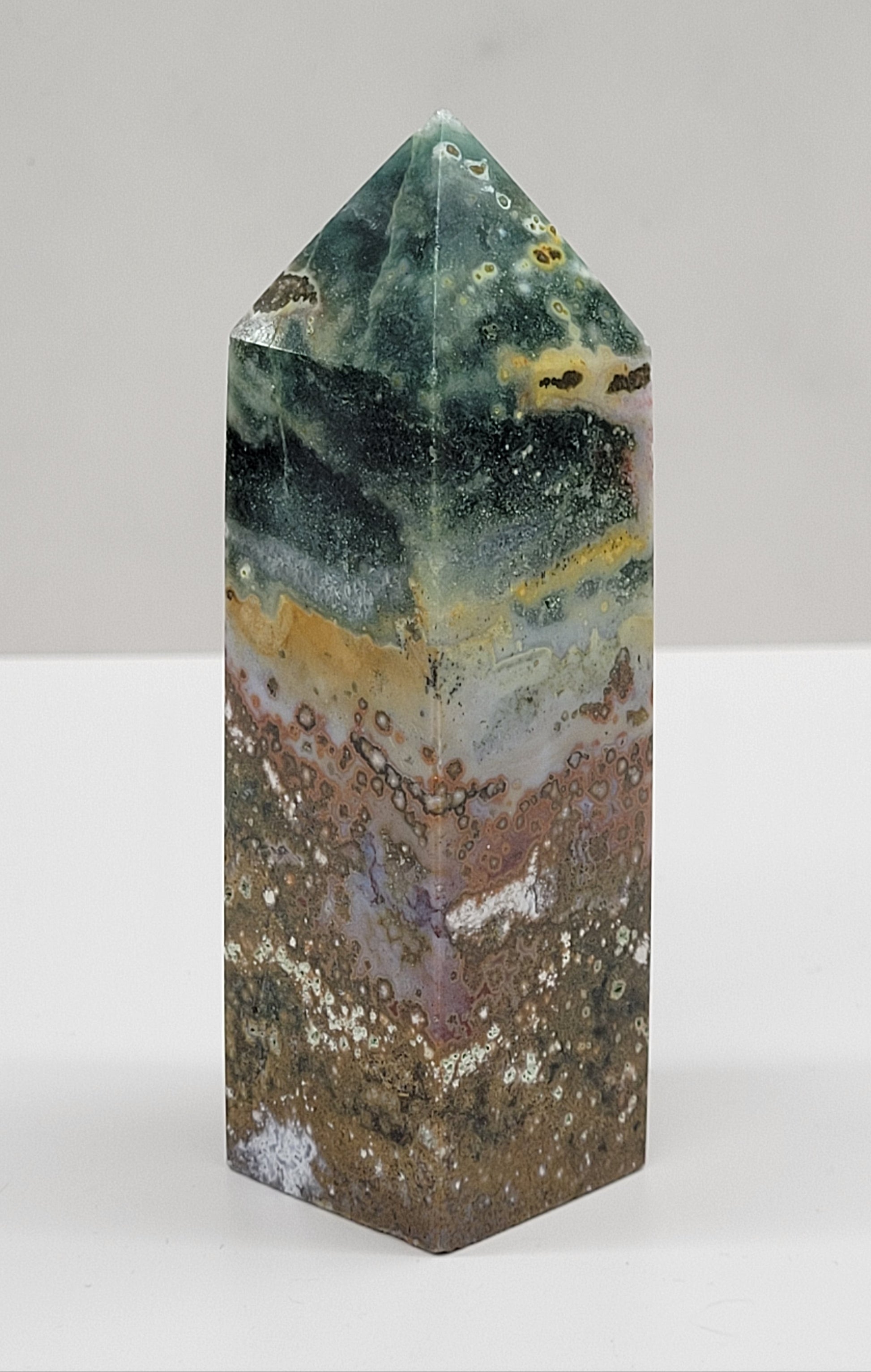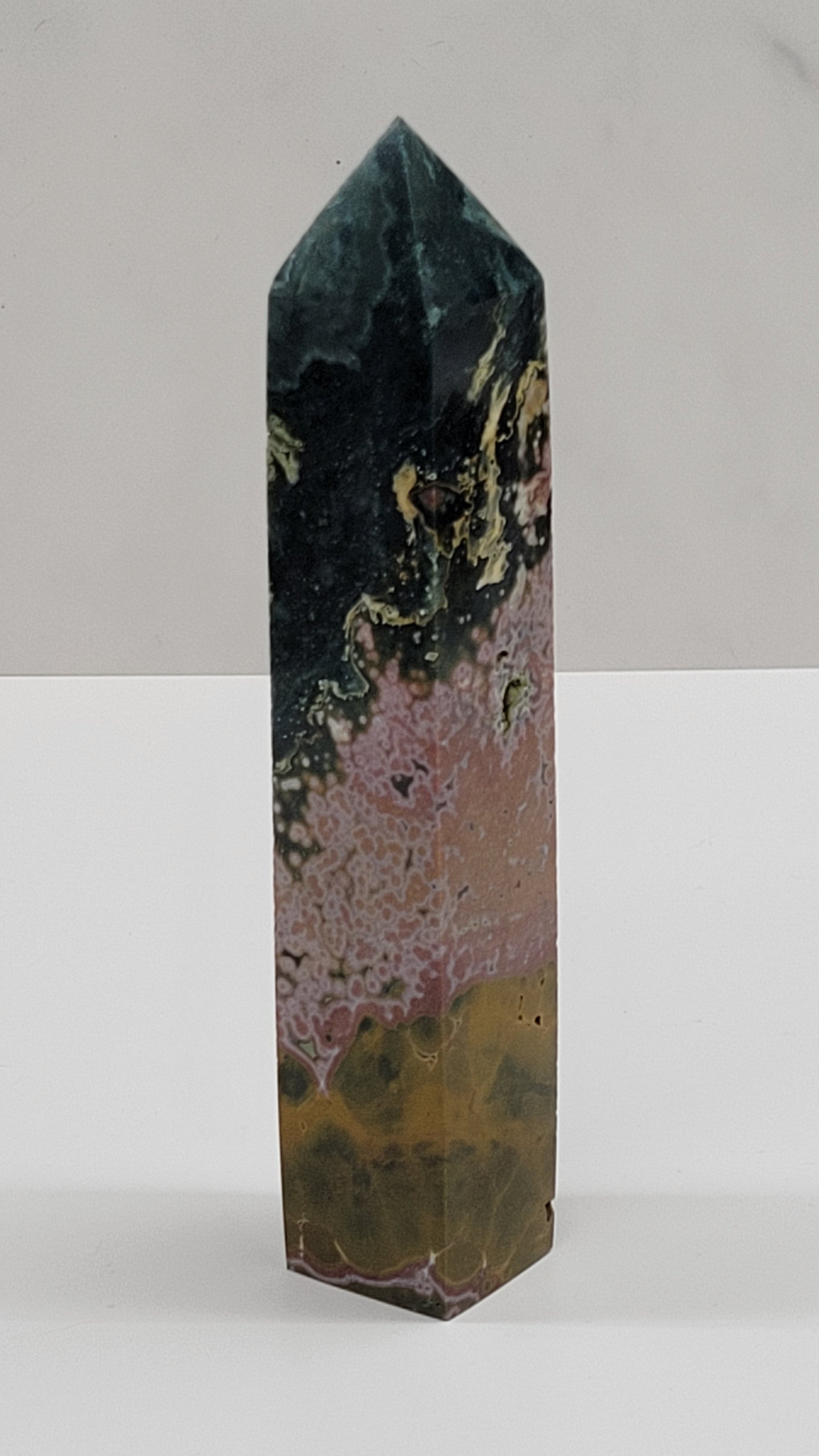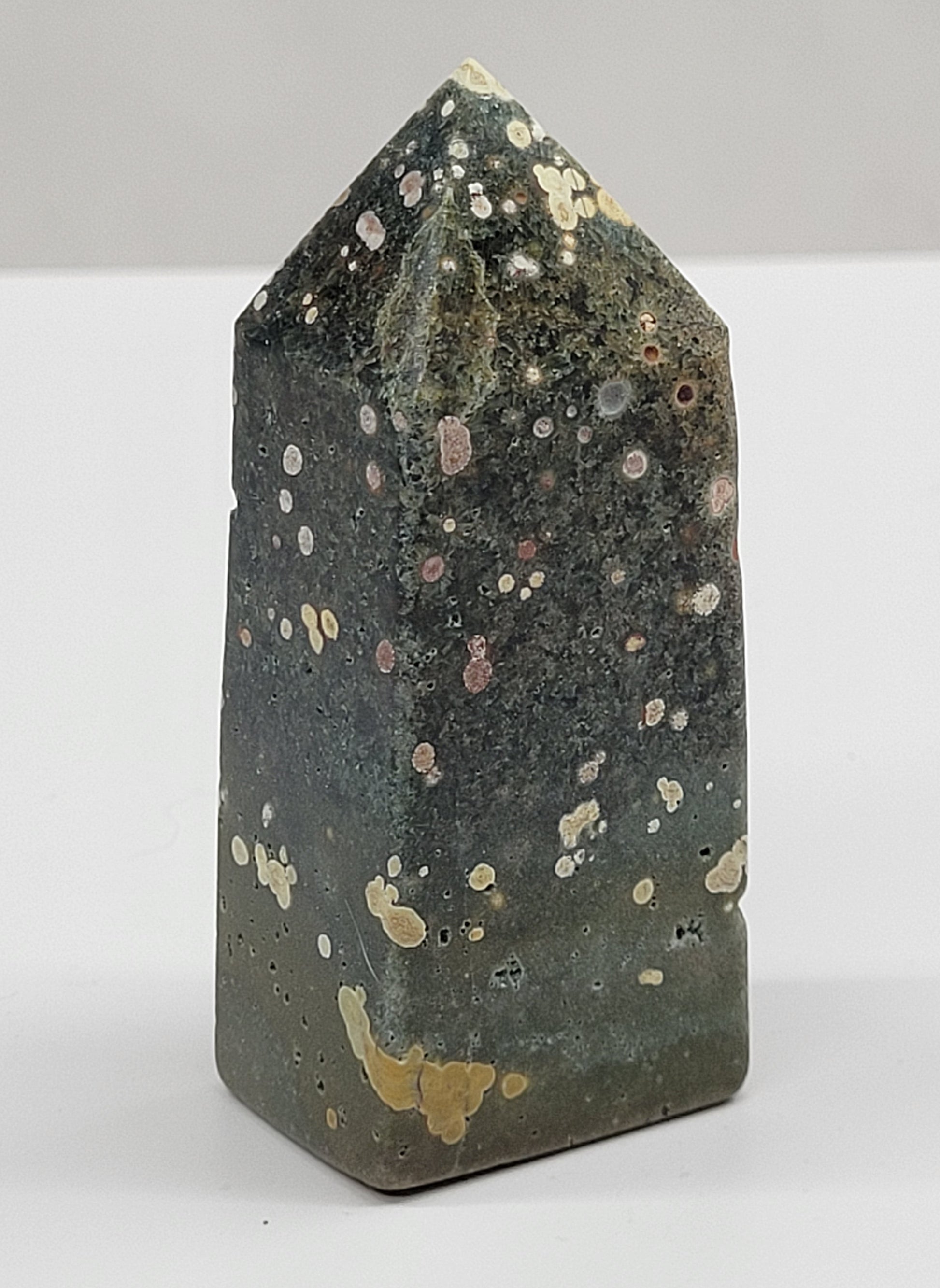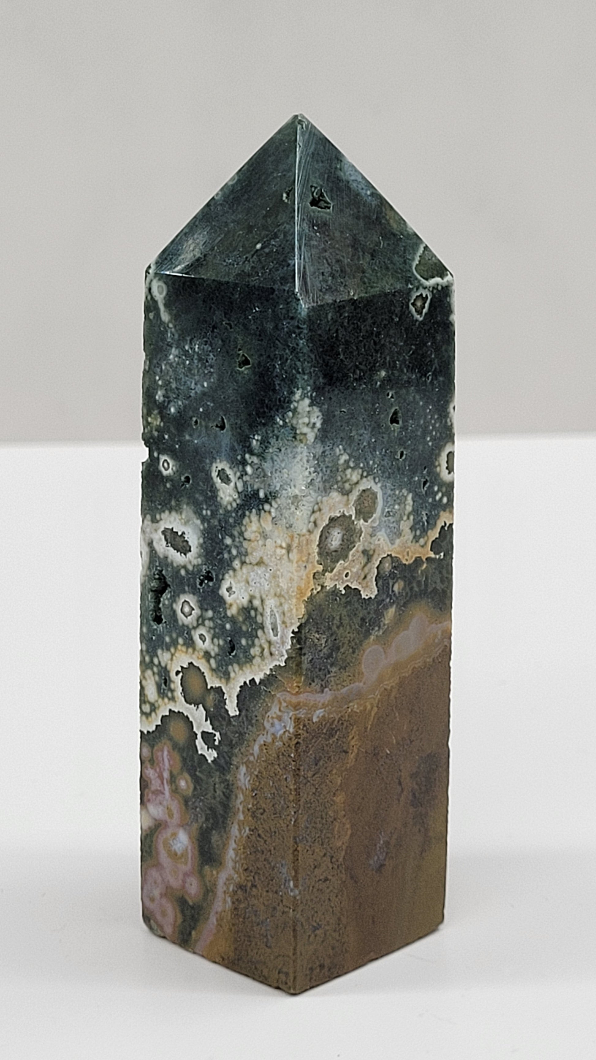 Ocean Jasper, rare variety of Jasper, a silicon dioxide mineral, and a member of the Quartz family. Its defined by circular “orb” like patterns that can be seen as green, brown, blue, yellow, grey, white, pink or red.