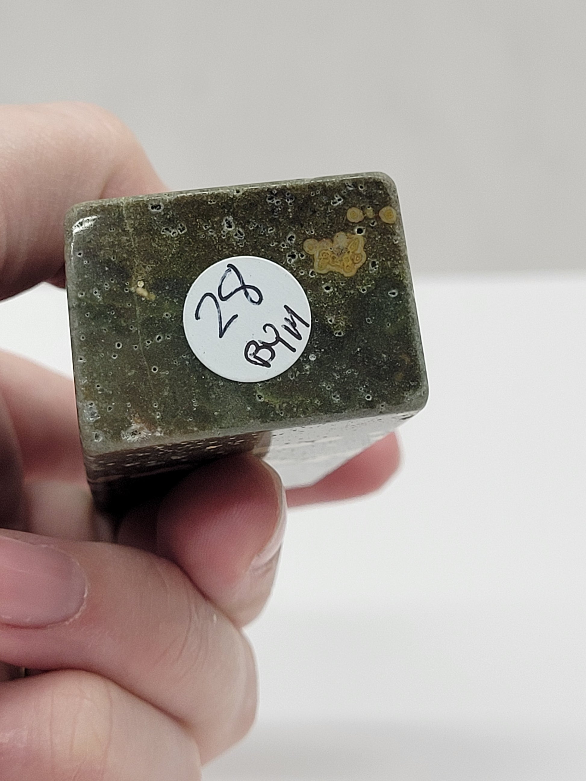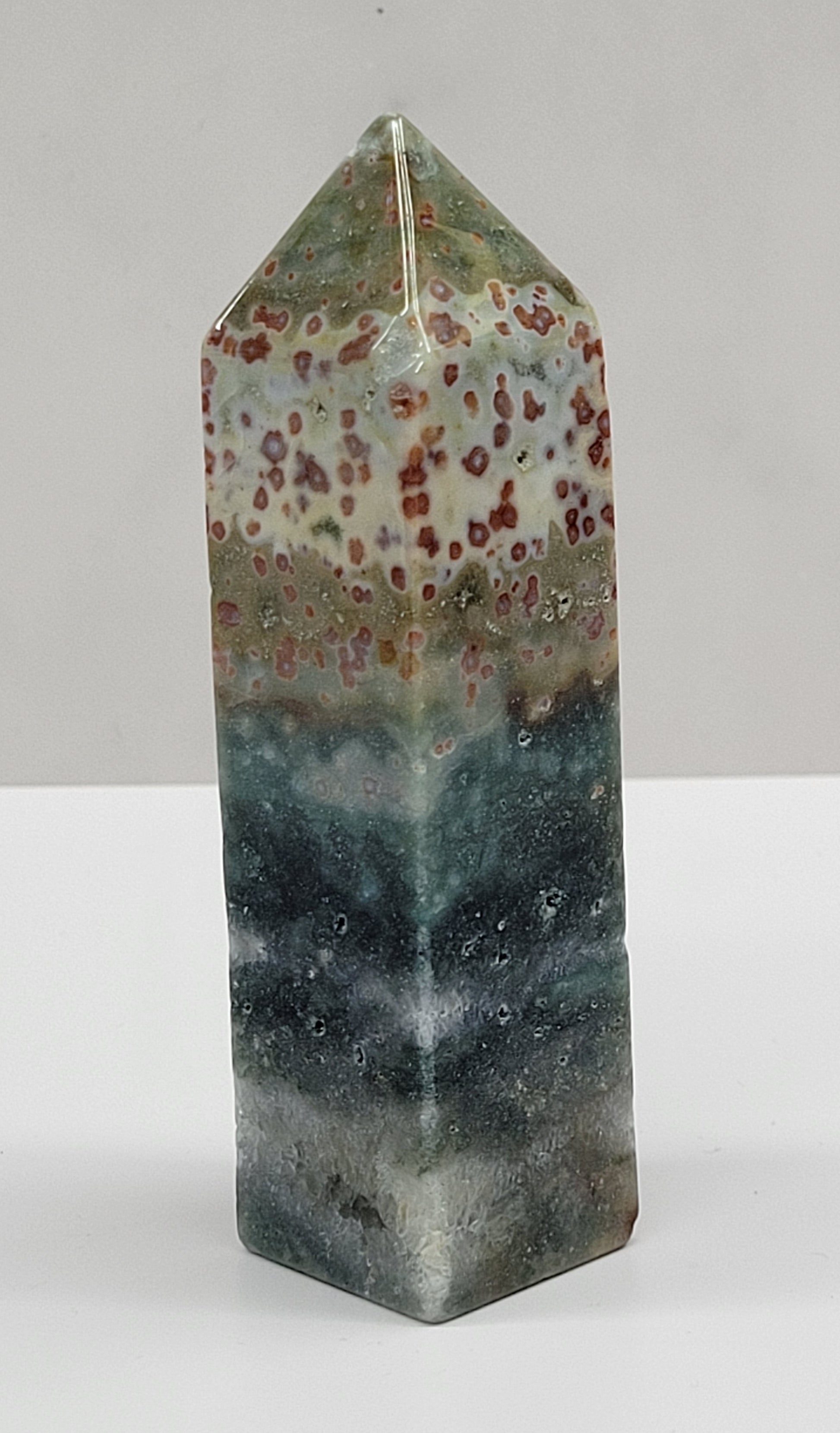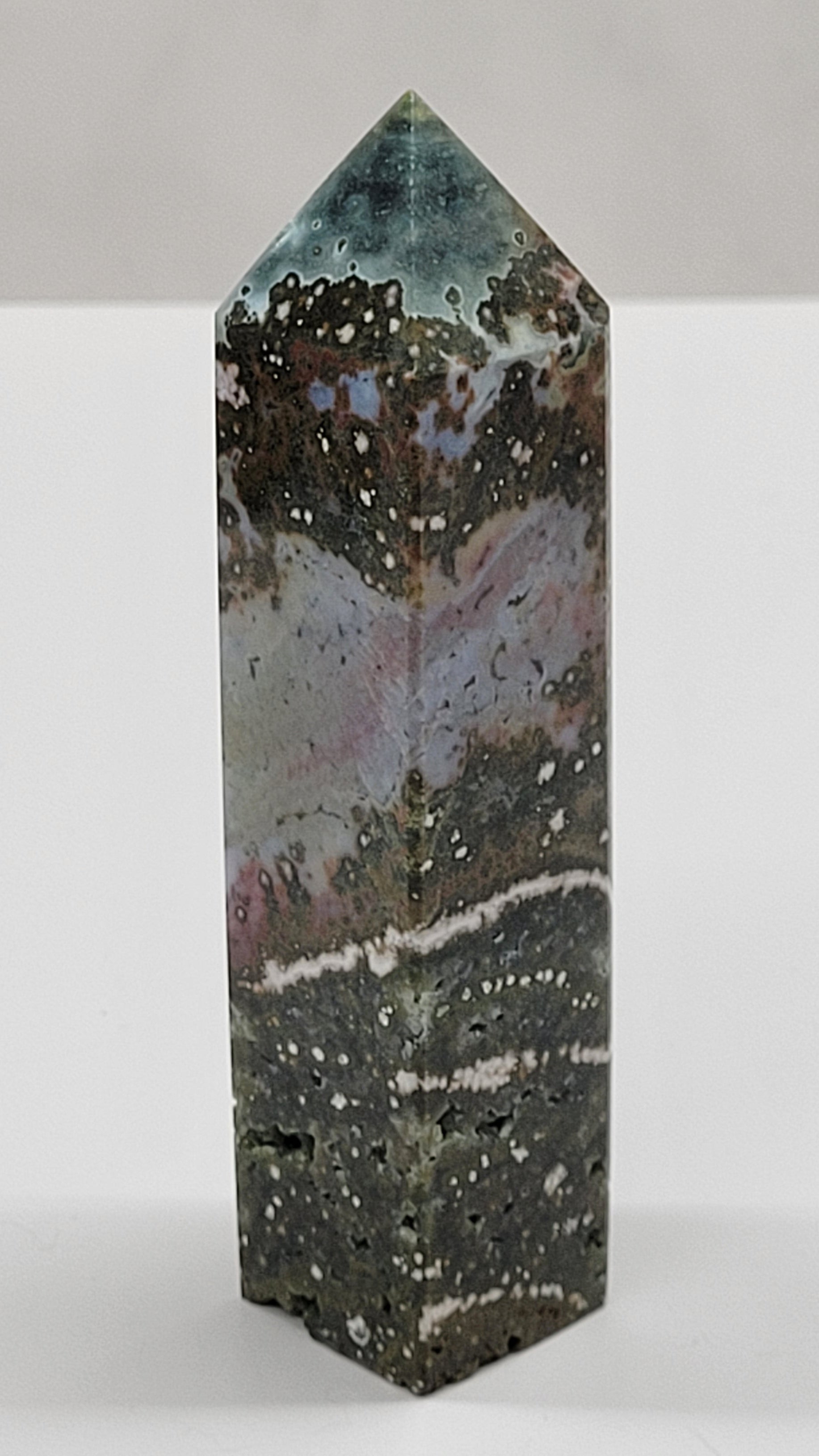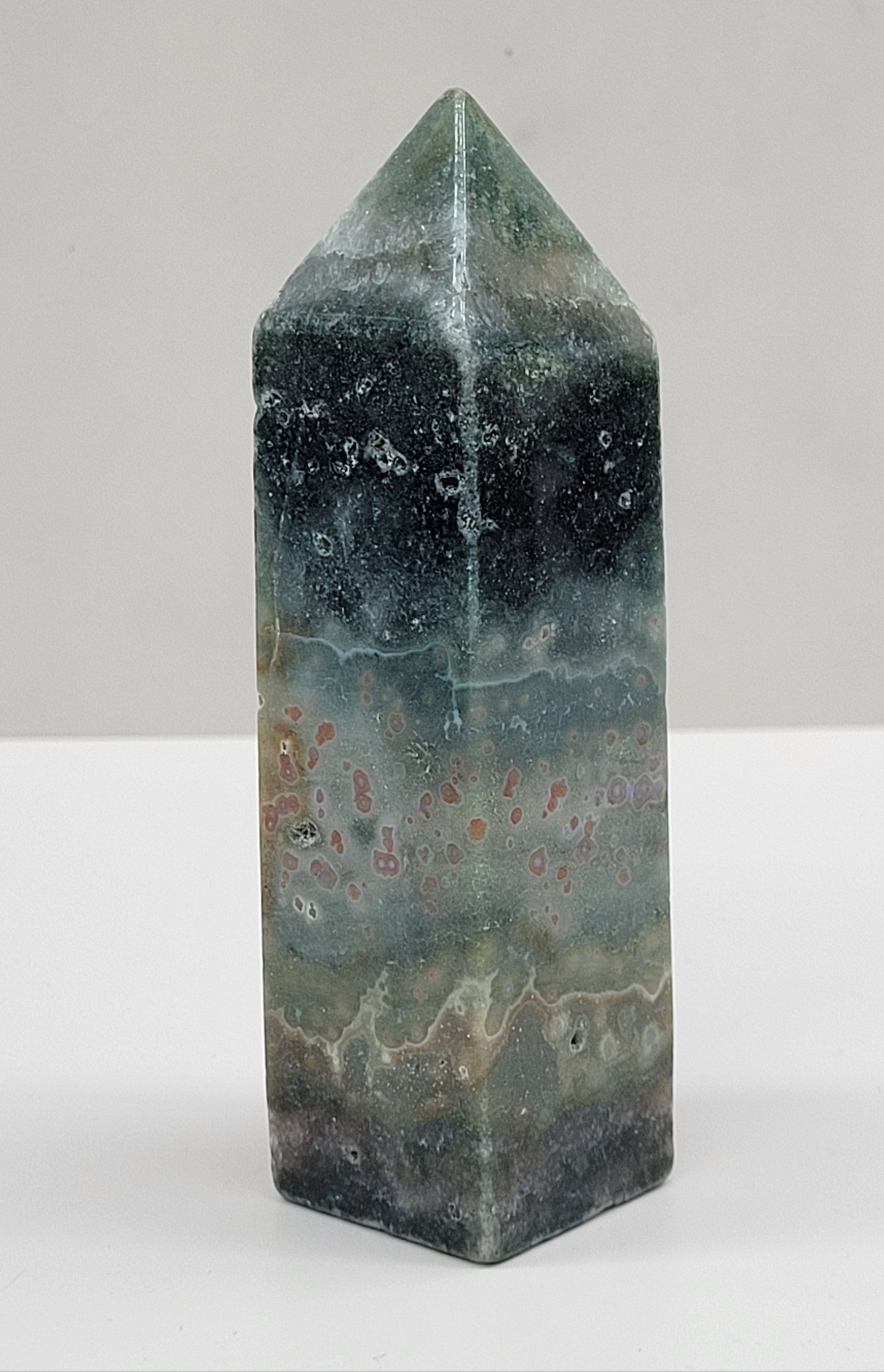Ocean Jasper, rare variety of Jasper, a silicon dioxide mineral, and a member of the Quartz family. Its defined by circular “orb” like patterns that can be seen as green, brown, blue, yellow, grey, white, pink or red.