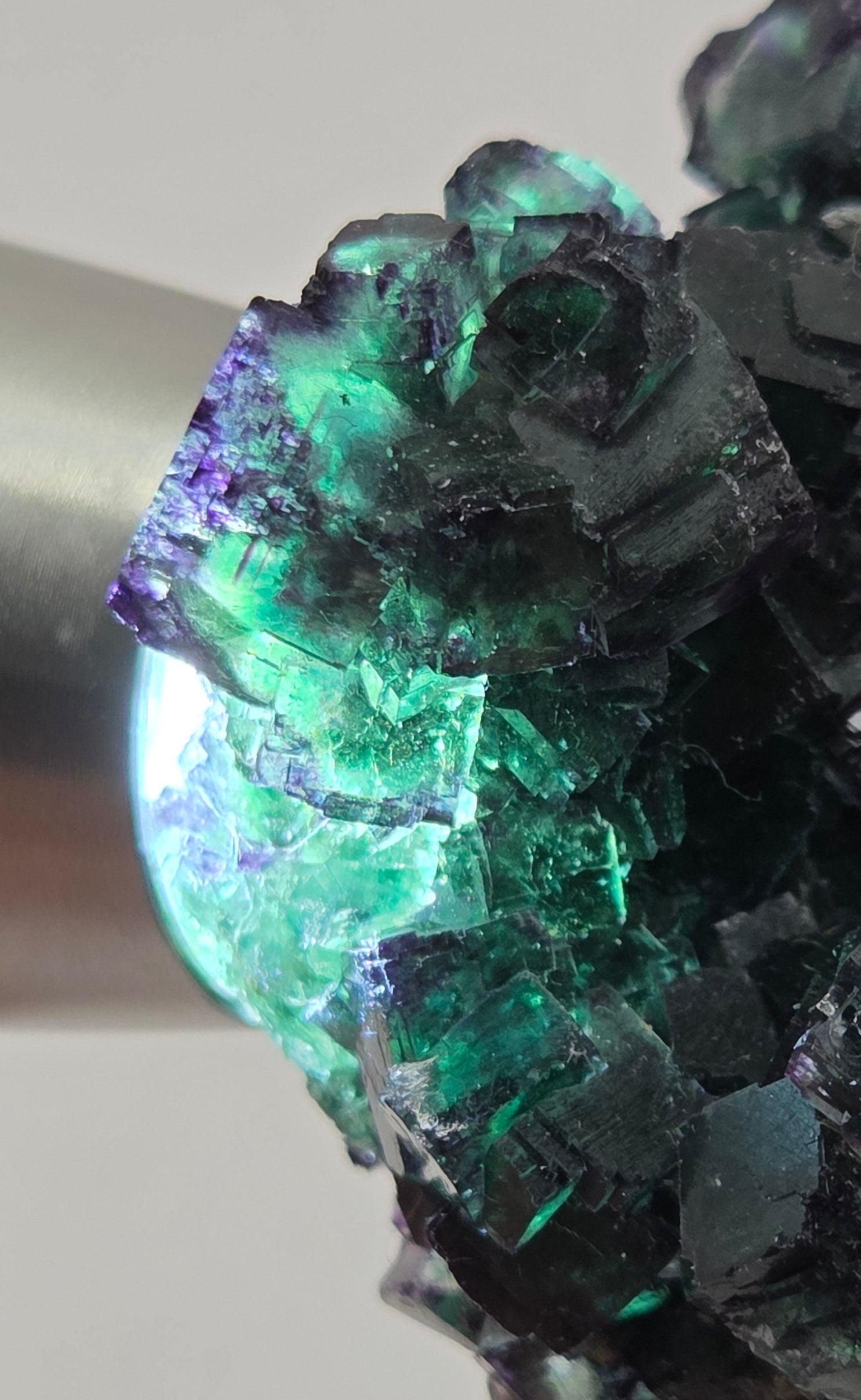 Okorusu fluorite is a type of fluorite mineral from the famous Okorusu Mine in Namibia, renowned for its vibrant and complex colors, sharp cubic crystals, and striking internal phantoms. The specimens often feature a vivid combination of colors, such as purple, green, and colorless, with a translucent quality that can make them glow under backlighting. These minerals are highly sought after by collectors for their aesthetic appeal, especially the "ghostly" layered phantoms visible within the crystals