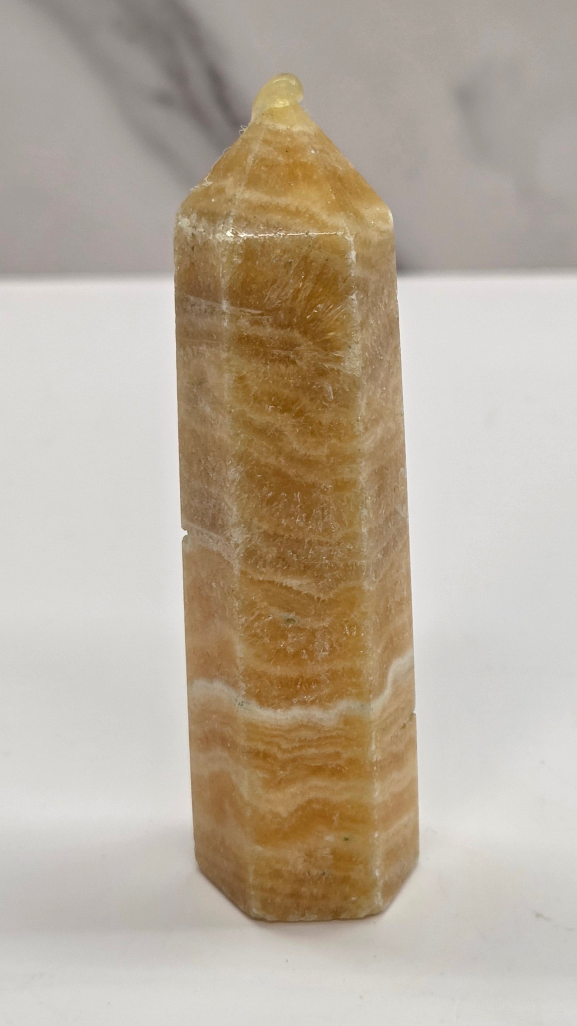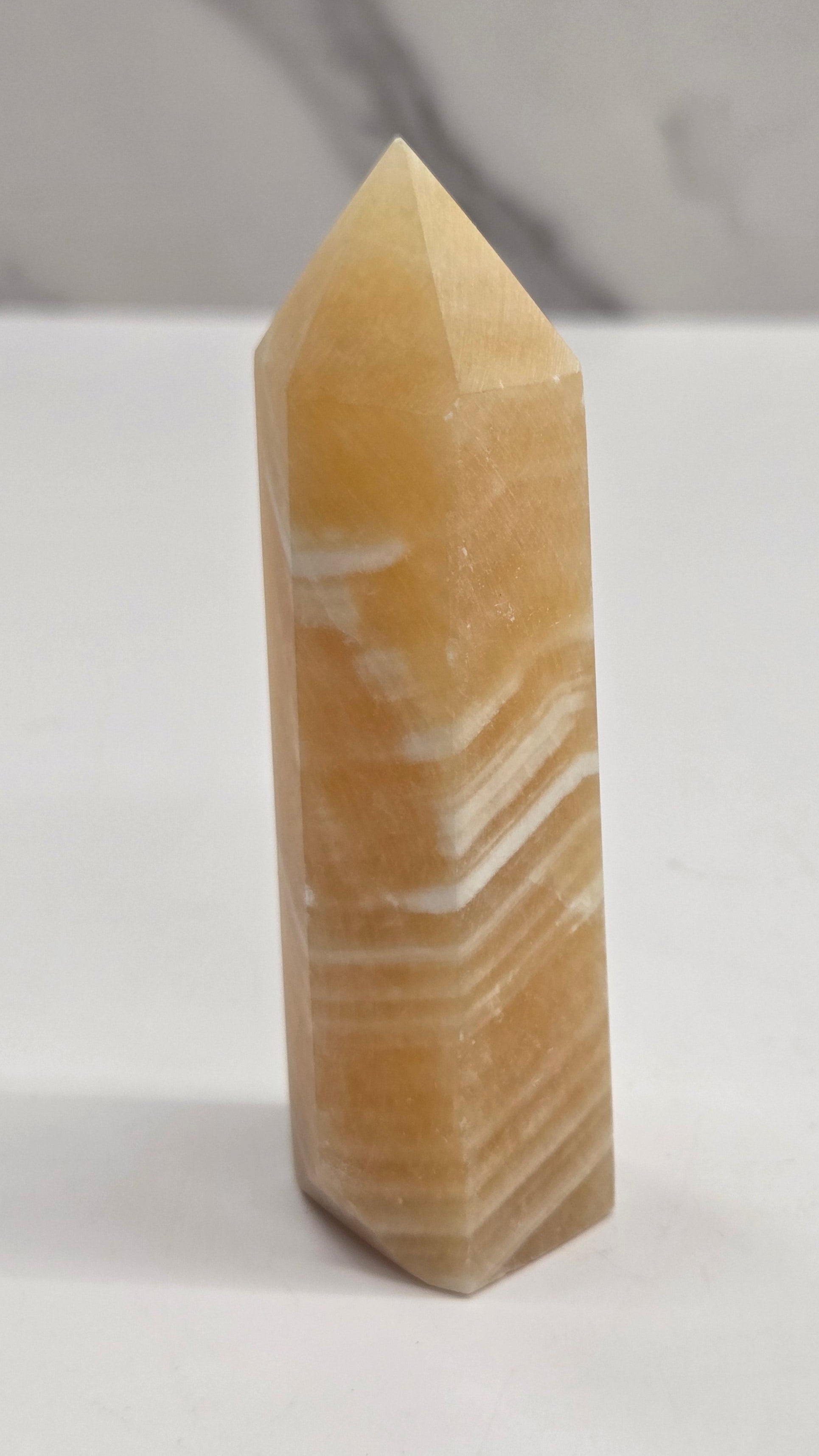 Orange Calcite is a member of the Calcite family of minerals, which means it is primarily made of Calcium Carbonate. This banded Calcite tower is made of Orange and White Calcite.
