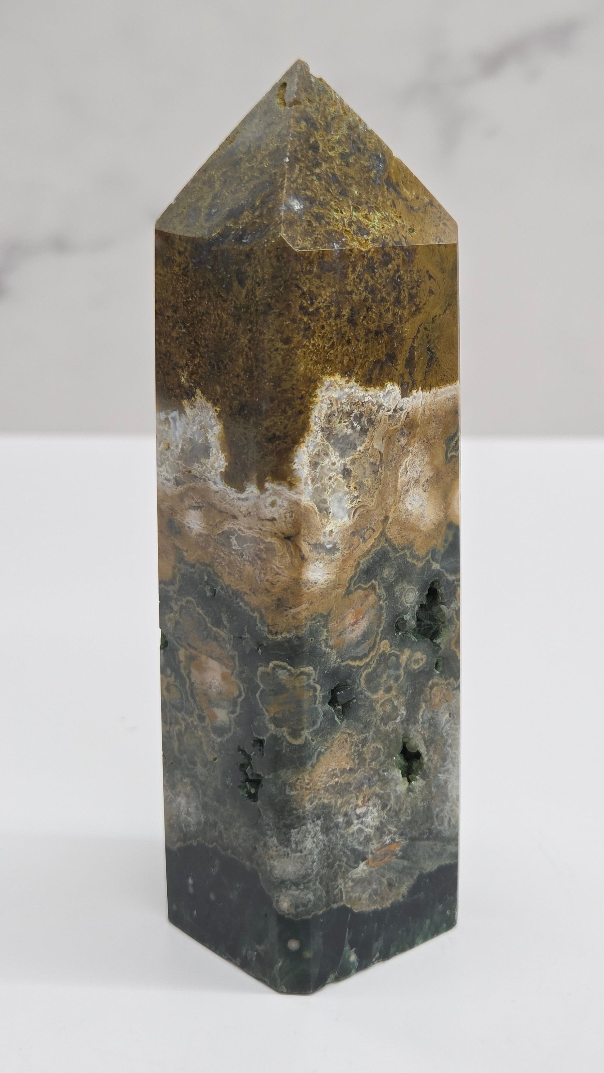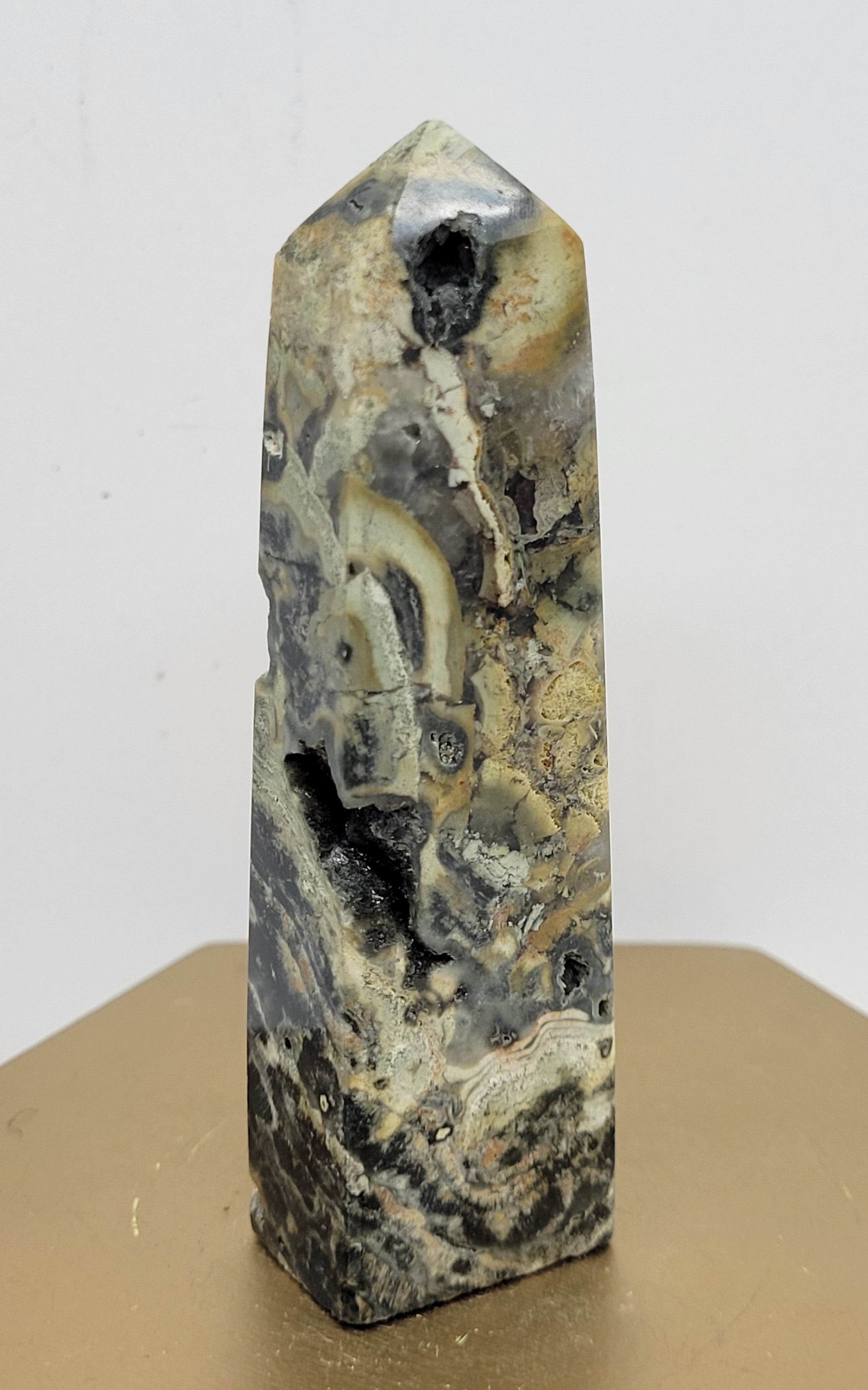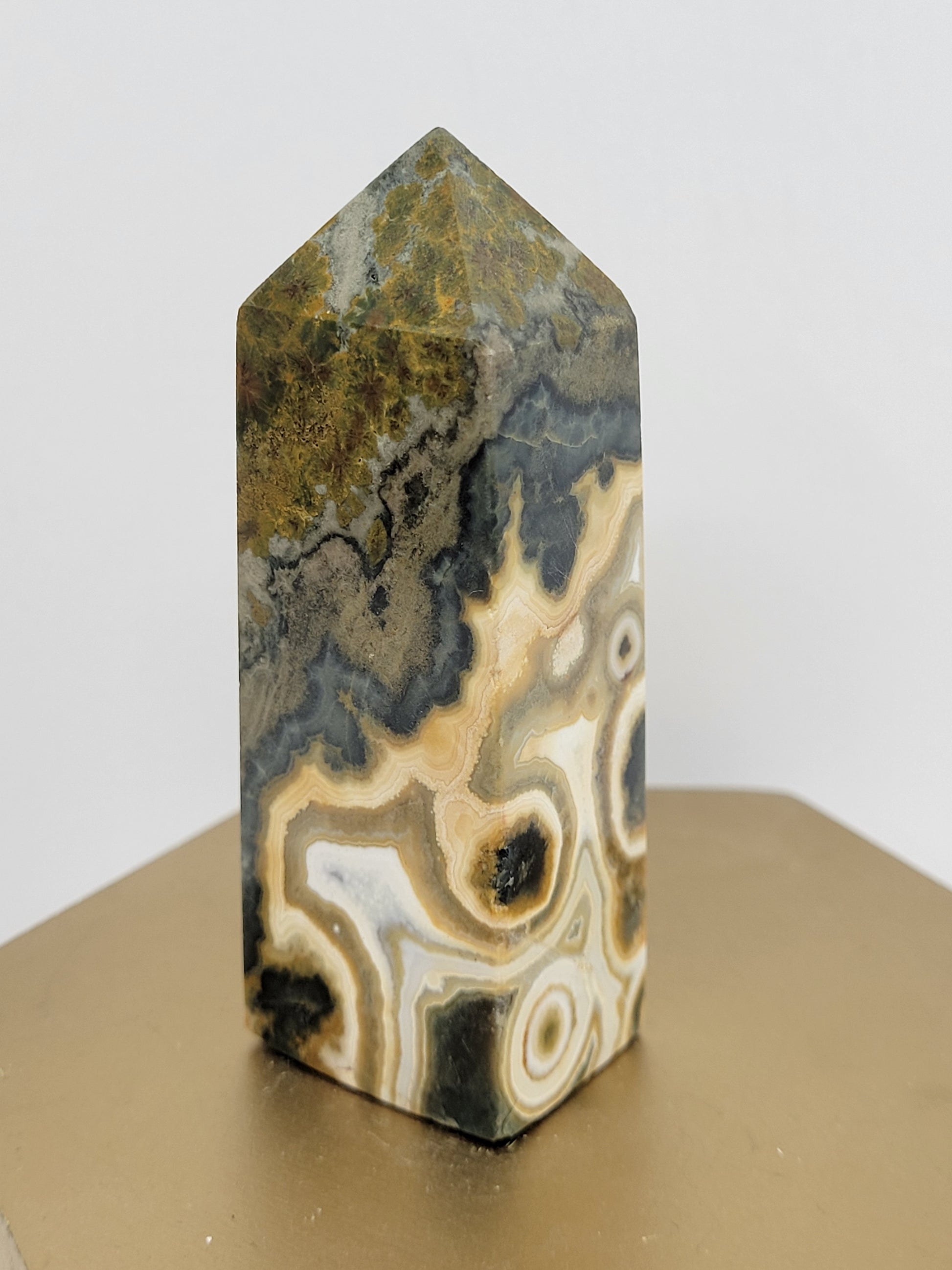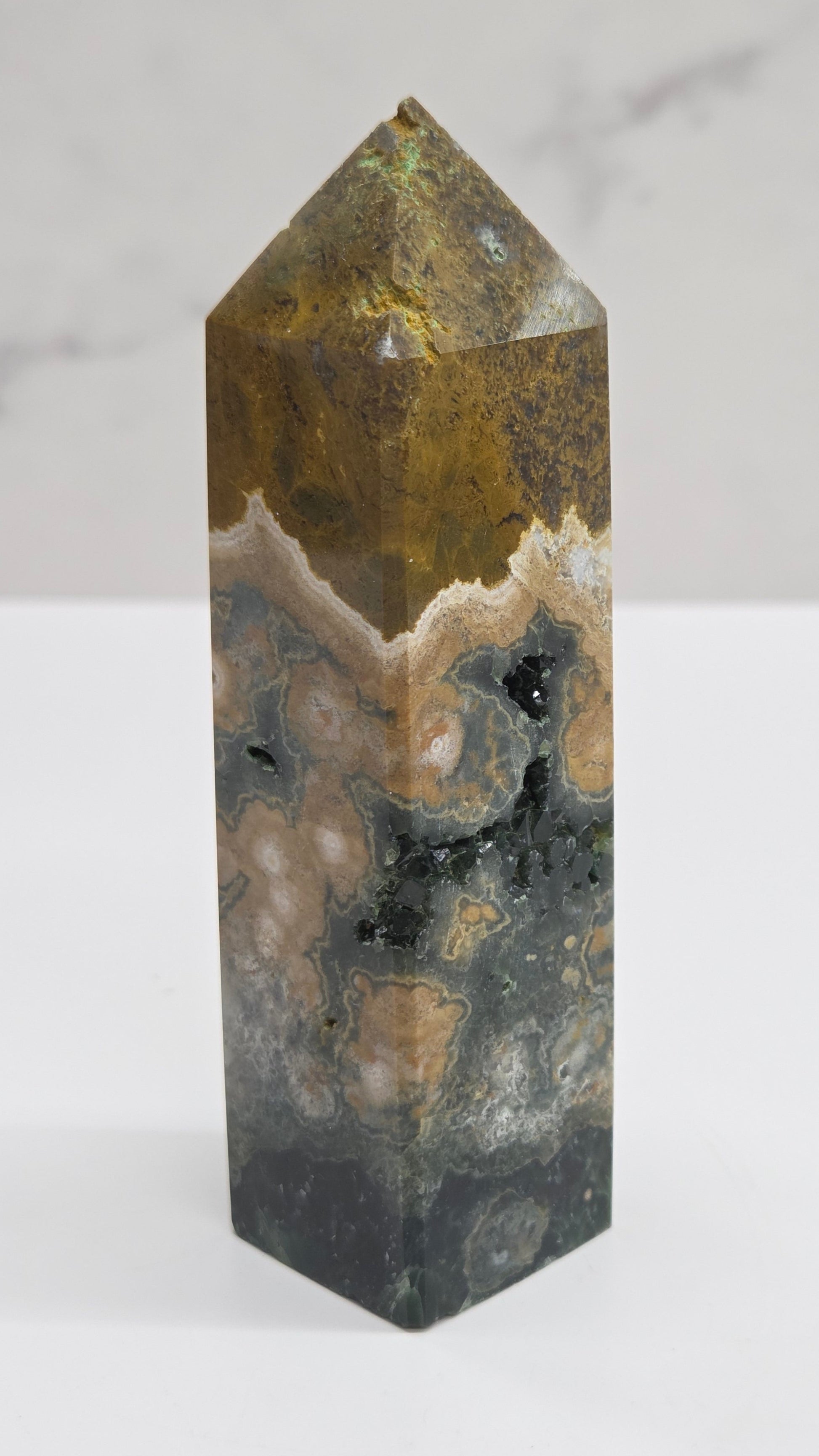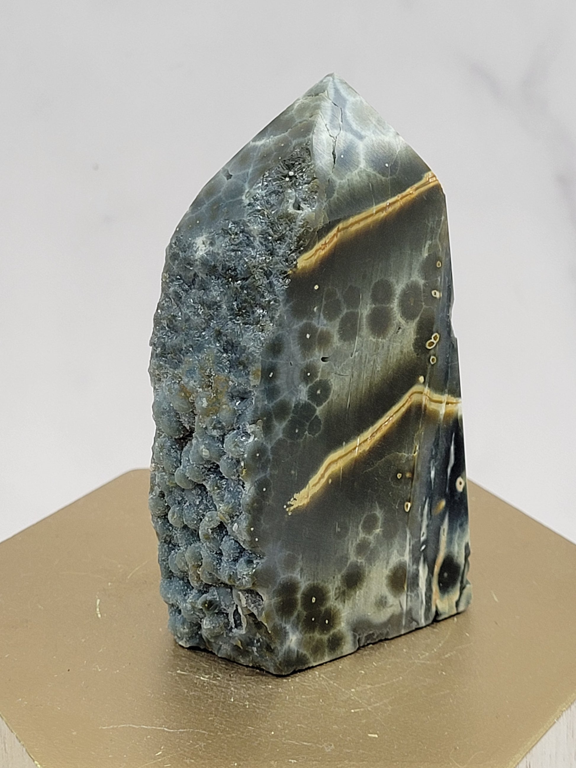Orbicular jasper is a variety of jasper which contains variably-colored orbs or spherical inclusions or zones. Some of the towers have beautiful druzy caves of dark green and/or black quartz crystals.