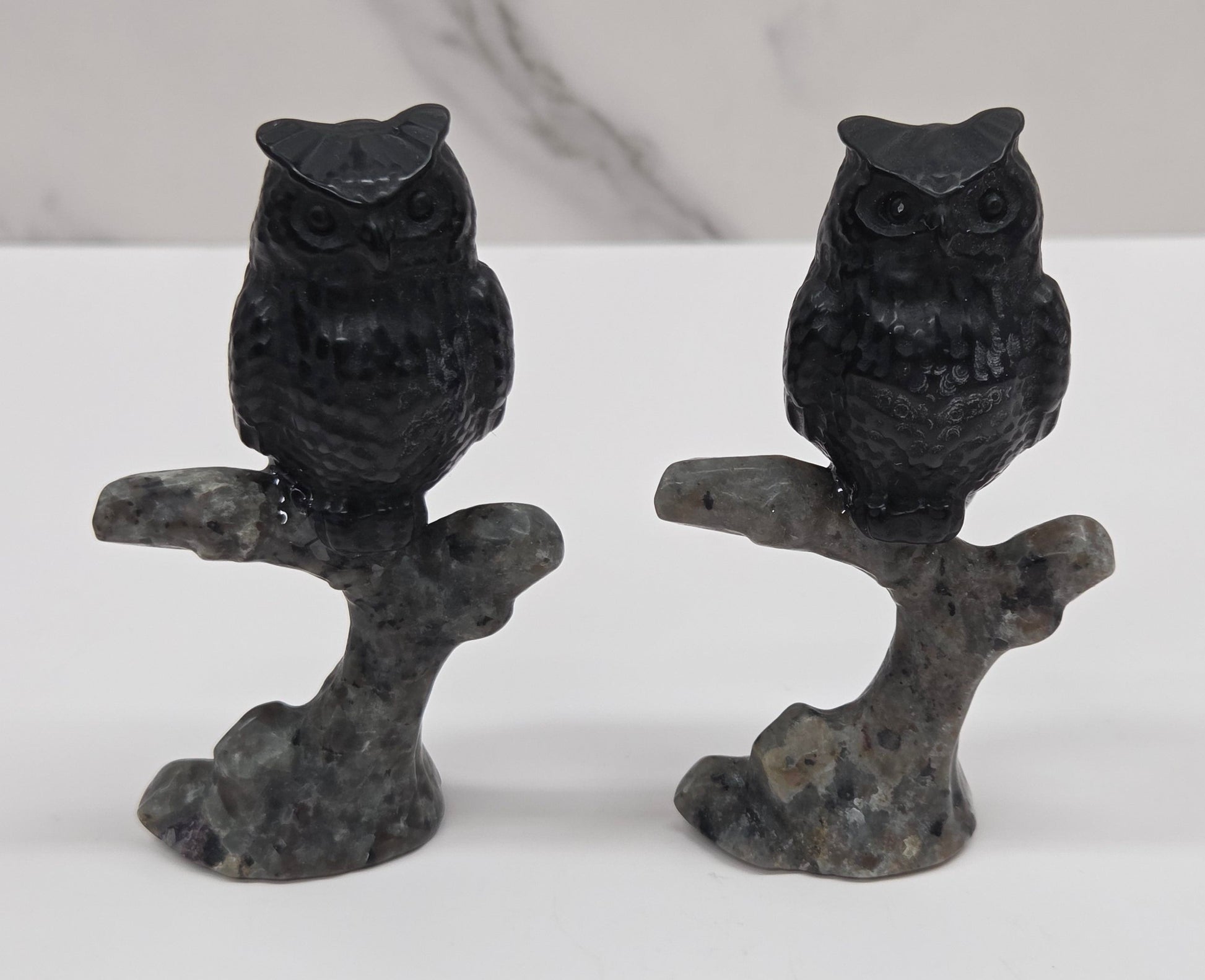Obsidian owls sitting on Yooperlite branches. Owls measure 3.25" tall