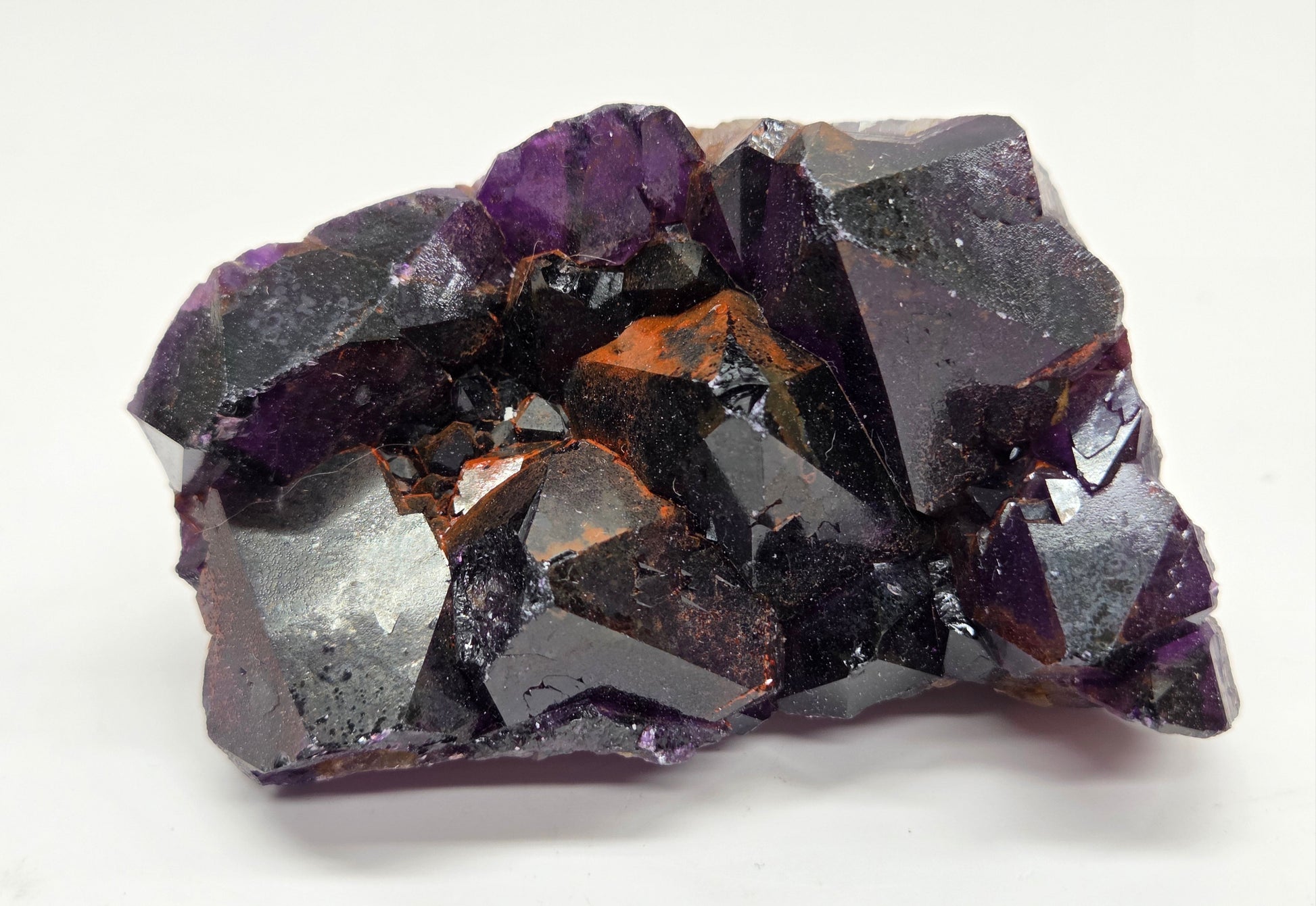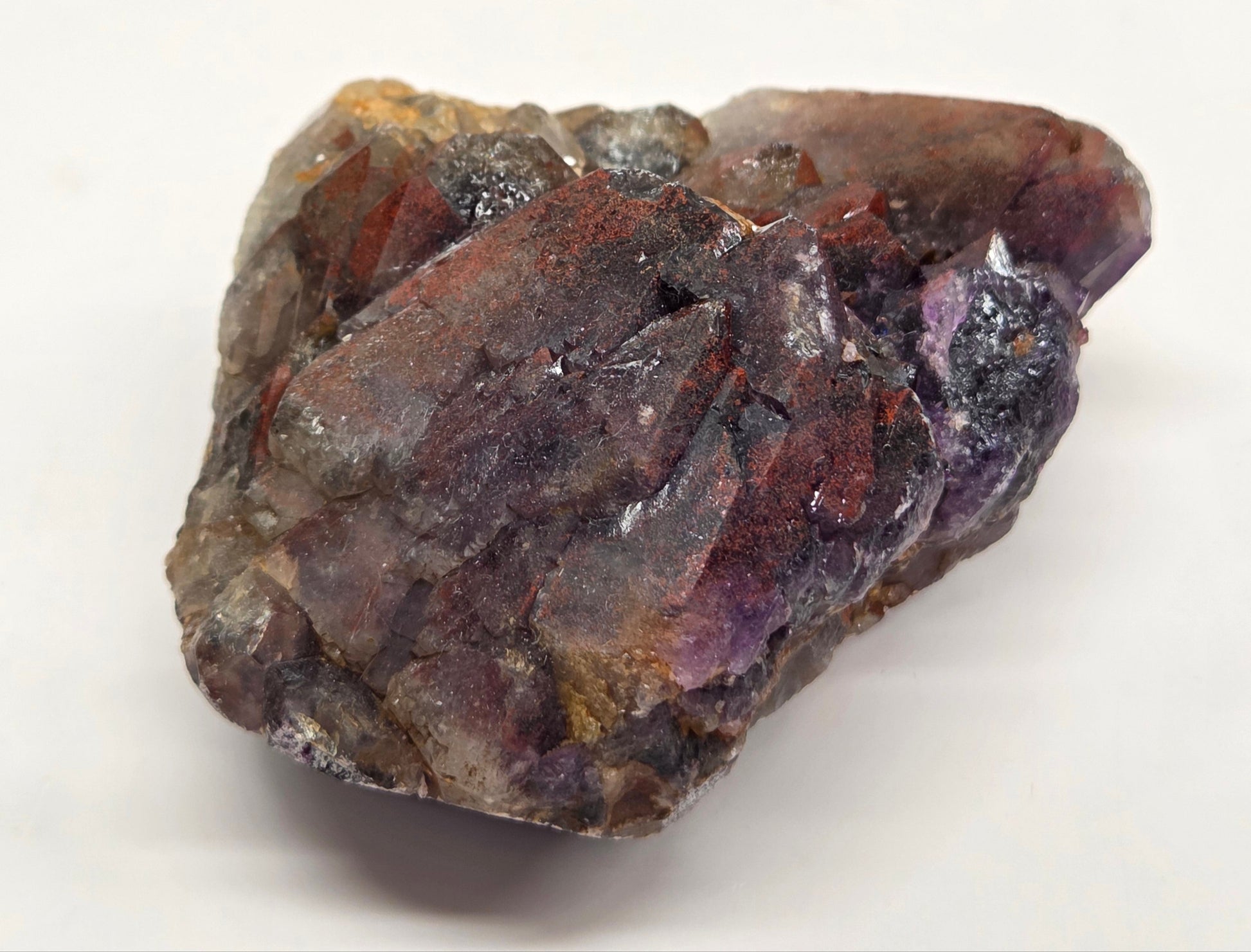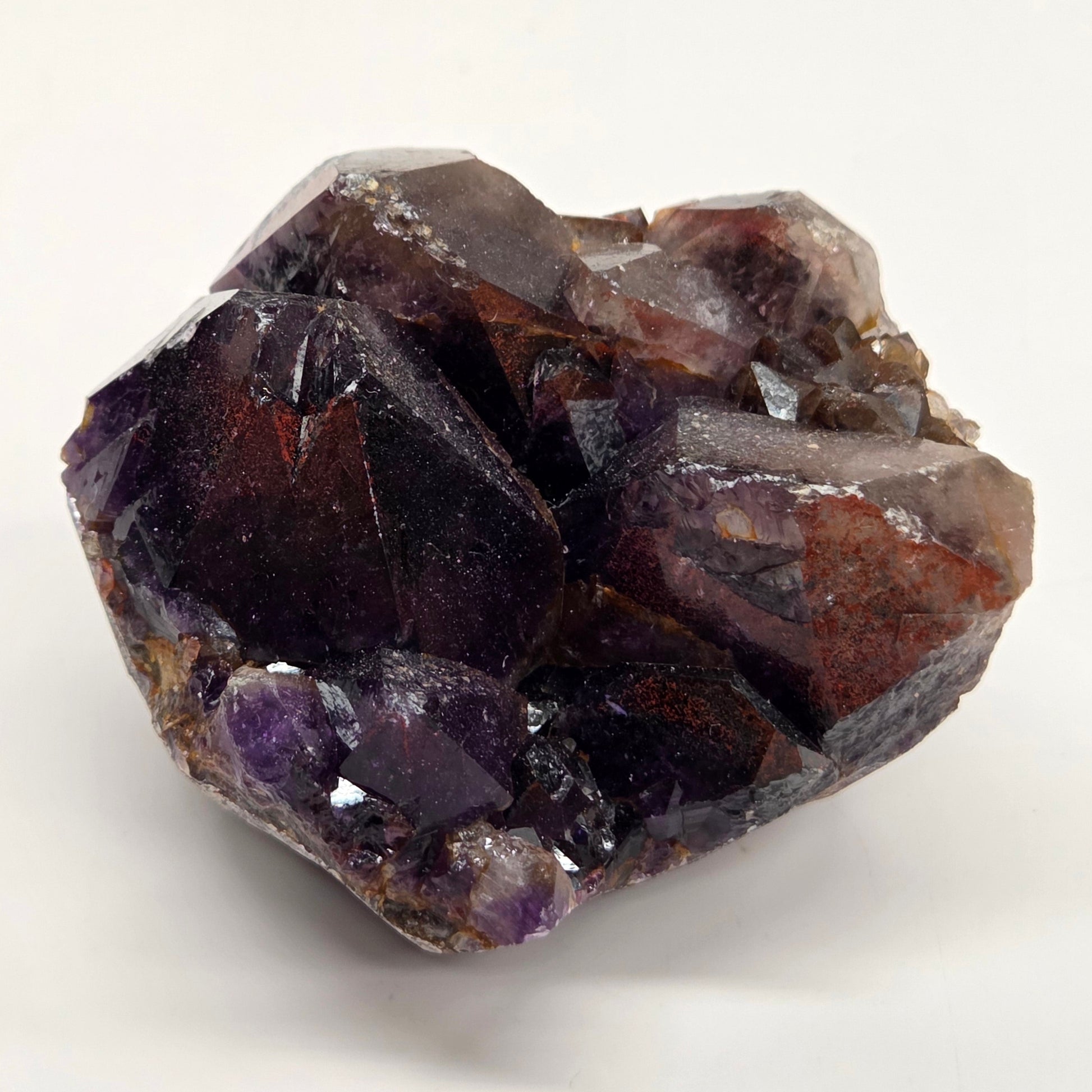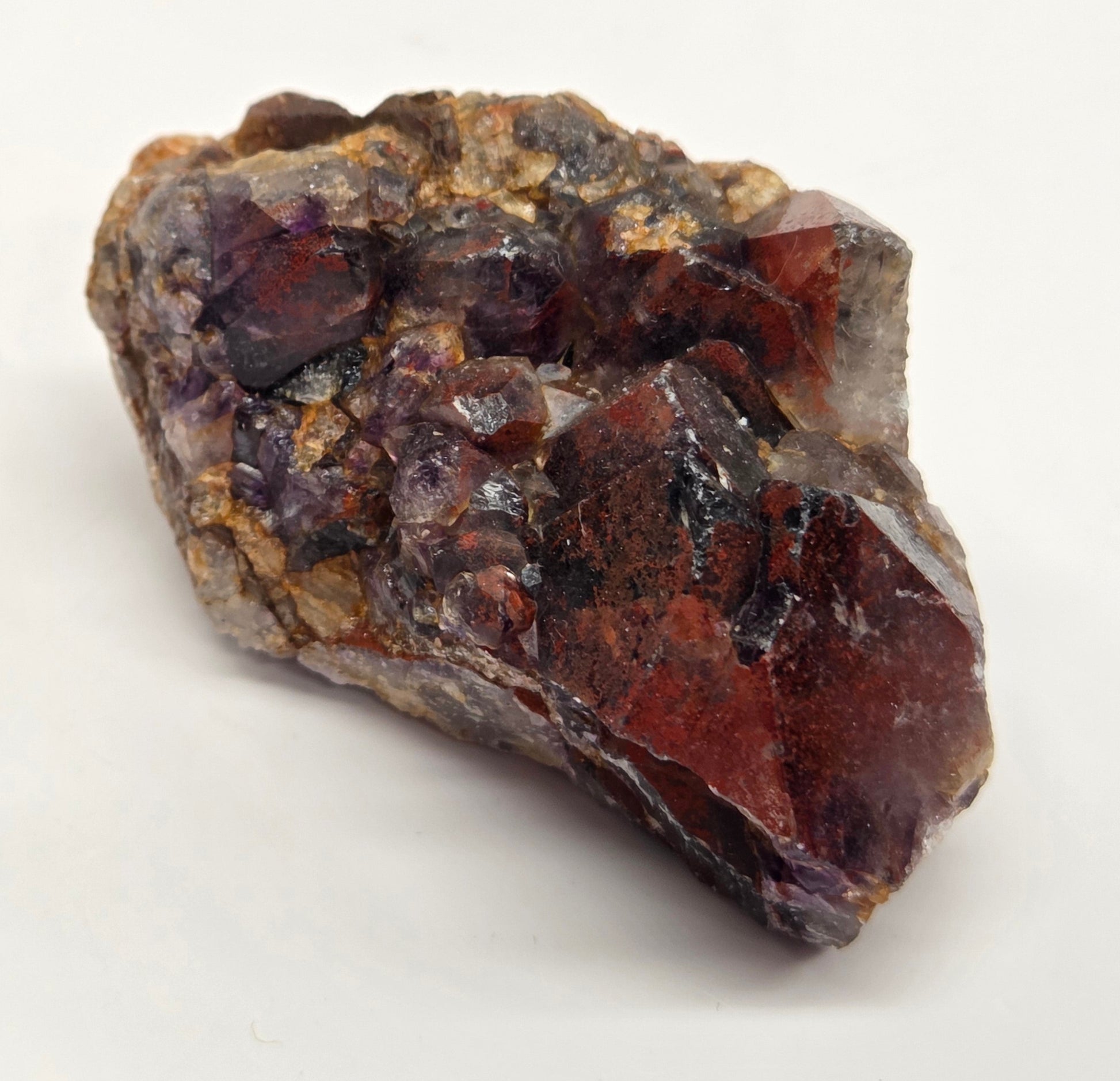 Amethyst with hematite (aka Alien Amethyst) is a natural combination of purple amethyst and the iron oxide mineral hematite. It appears as amethyst crystals with reddish hues, zones, or inclusions from the hematite.