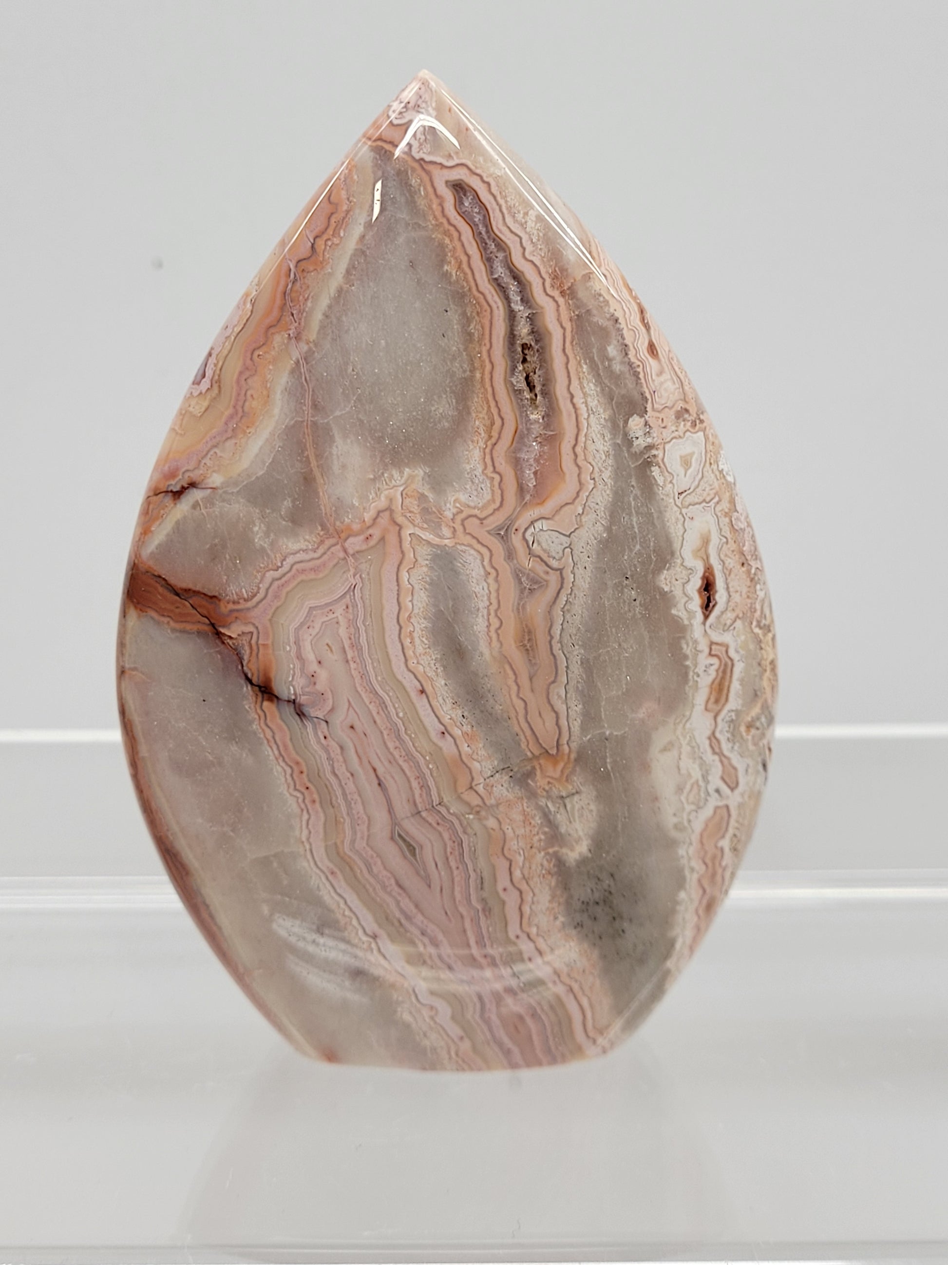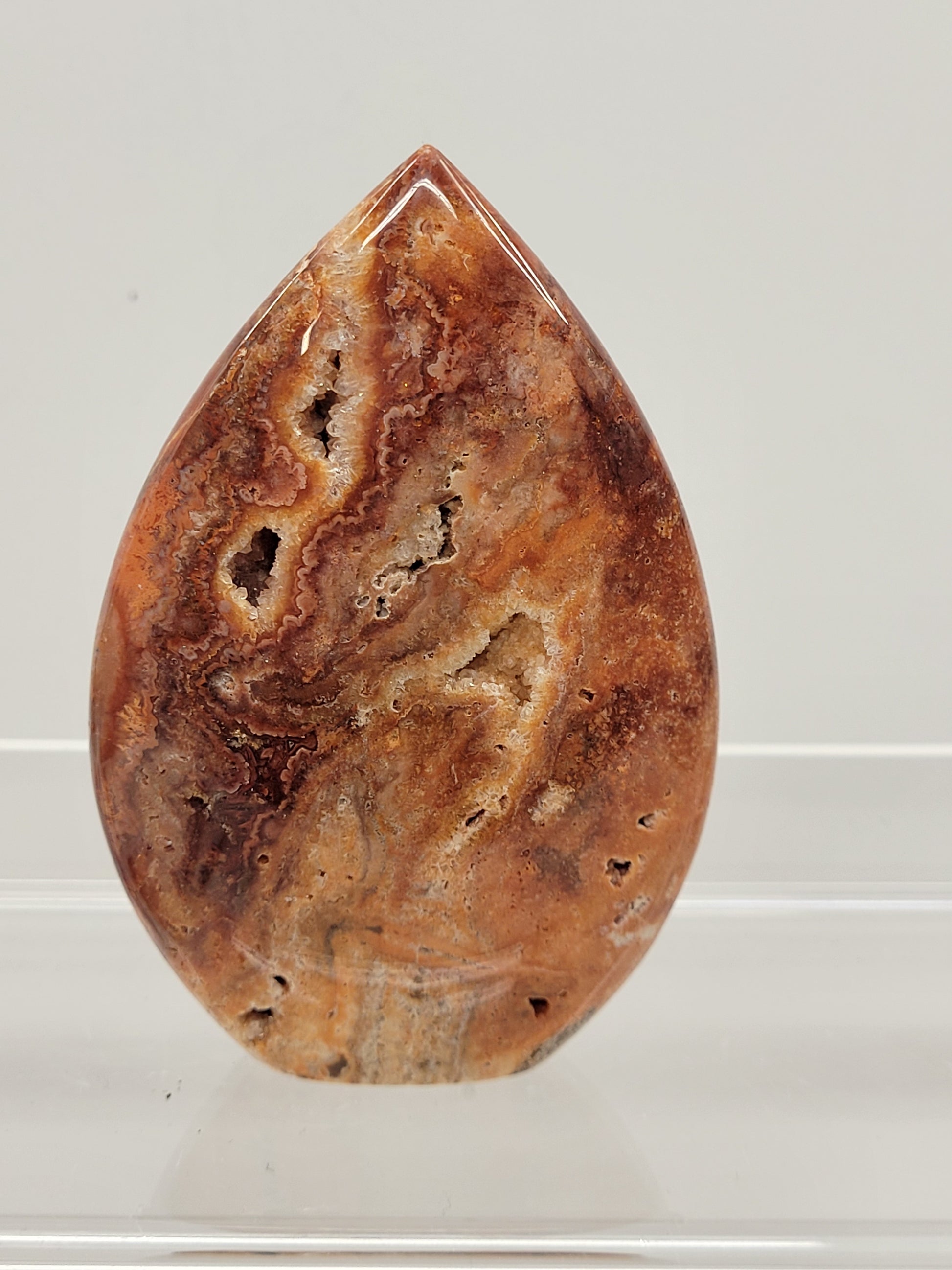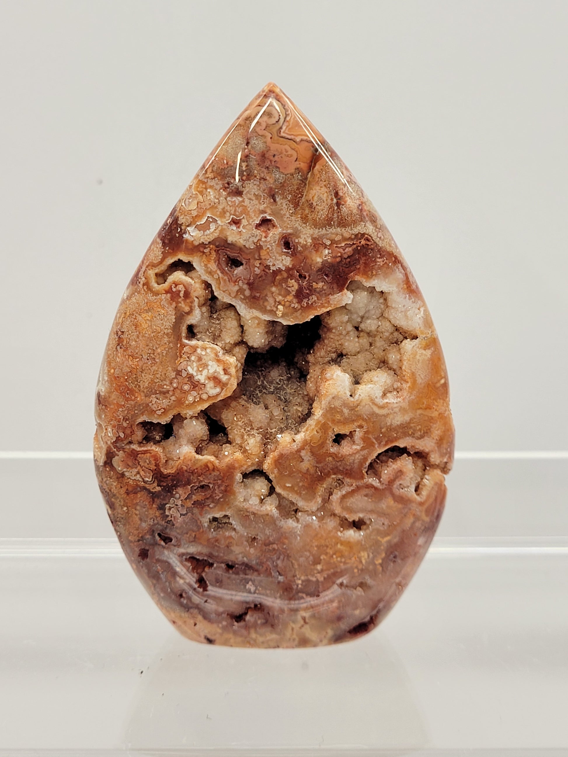 Crazy lace agate is a banded chalcedony (microcrystalline quartz) that's infused with iron and aluminum and is often brightly colored and complexly patterned. This produces the creamy browns, blacks, greys and golds (and occasional pinks or reds) swirled together in this stone.