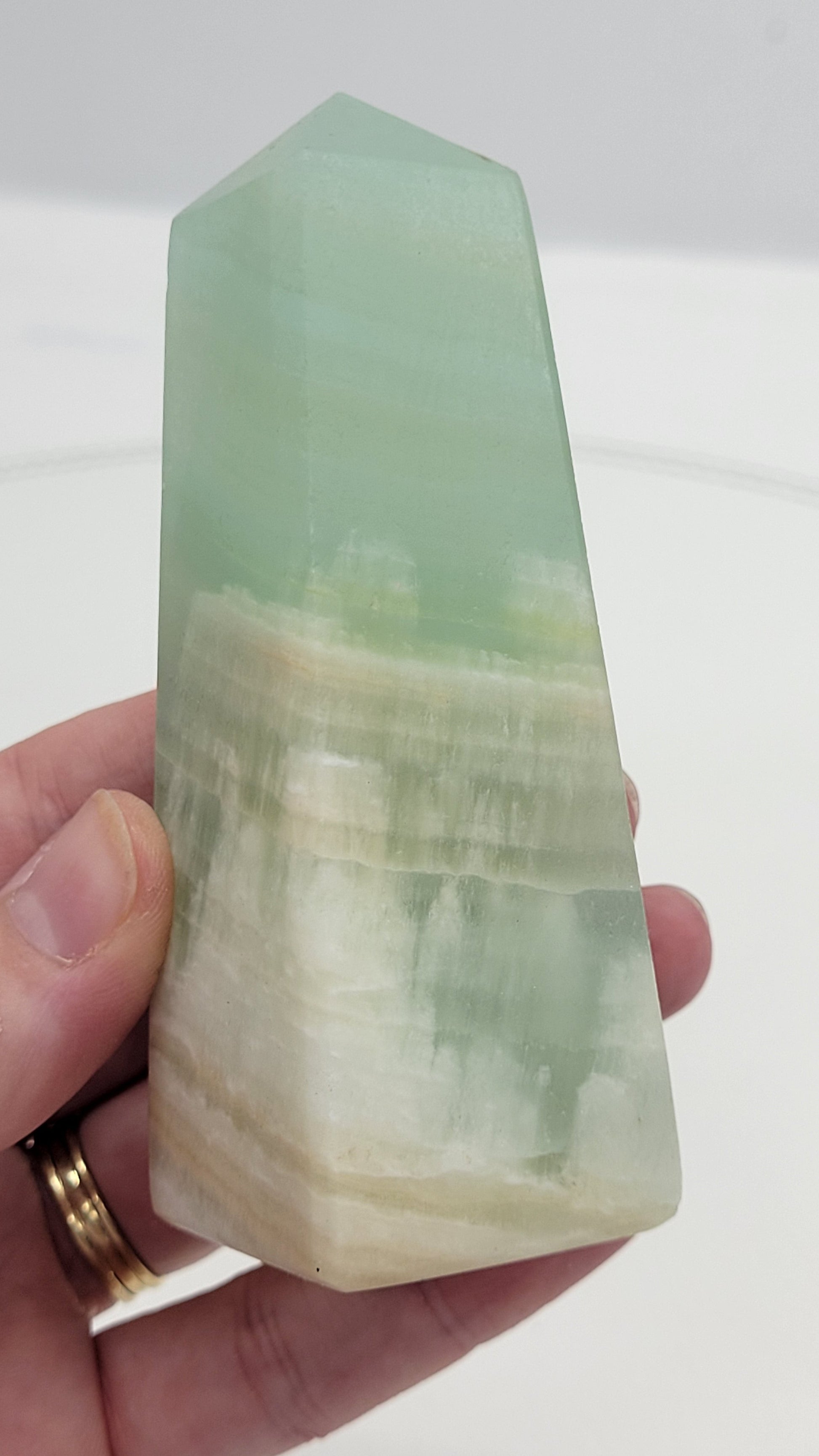 Pistachio Calcite is a newer form of Calcite from Pakistan. This crystal can be found in a blue-green color with white undertones and striations throughout.