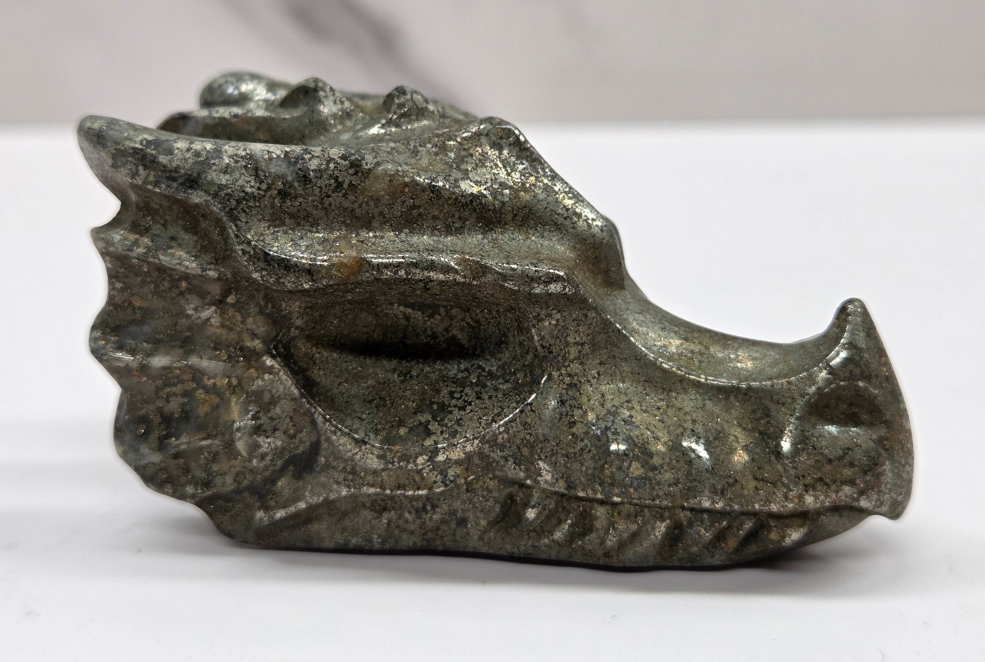 Pyrite dragon head that measures 2.75" x 1.35" x 1.5"