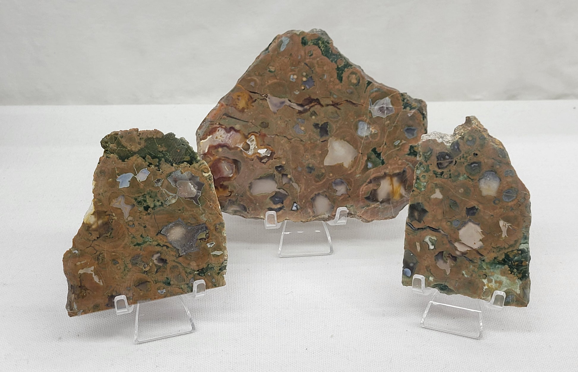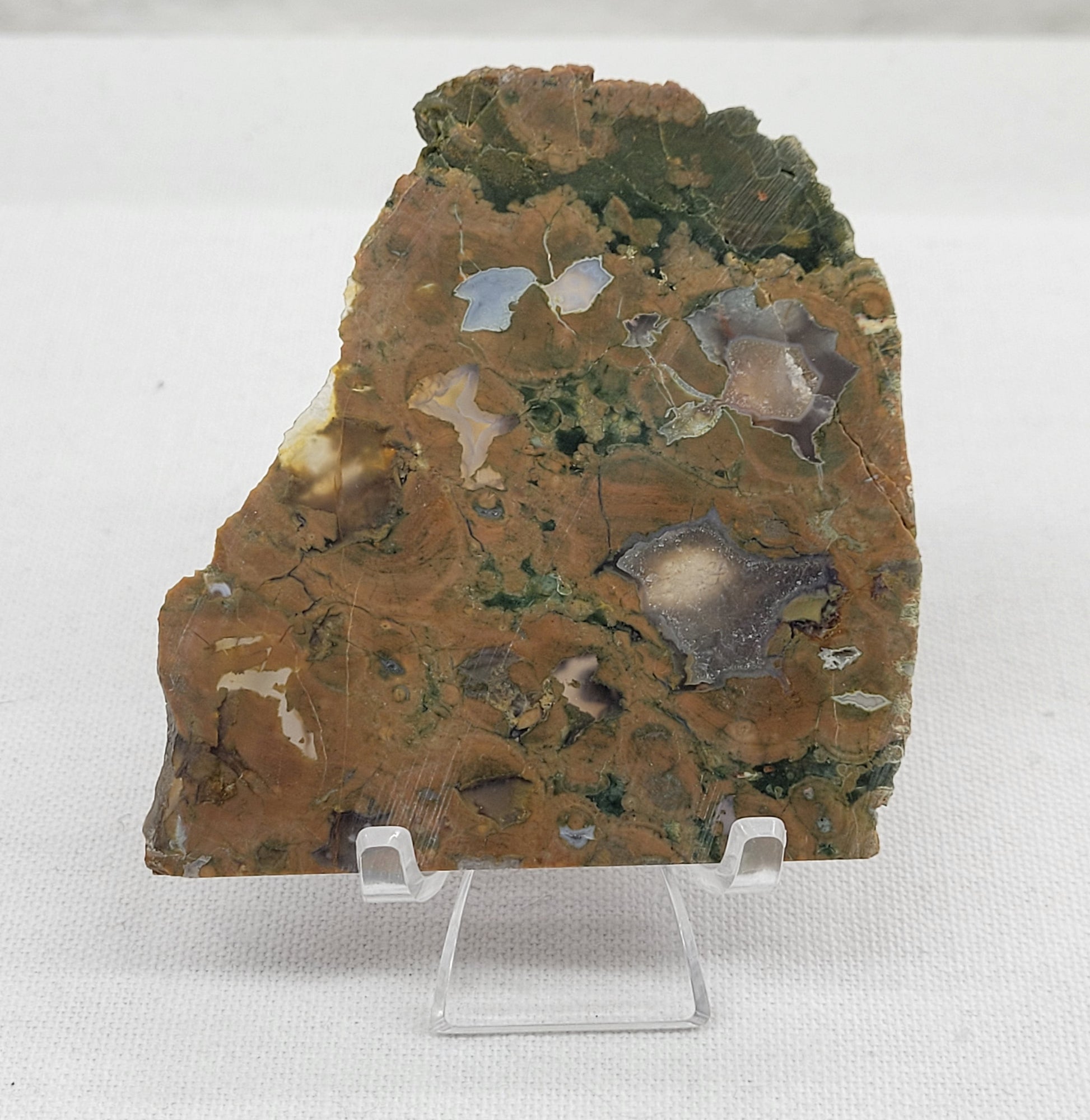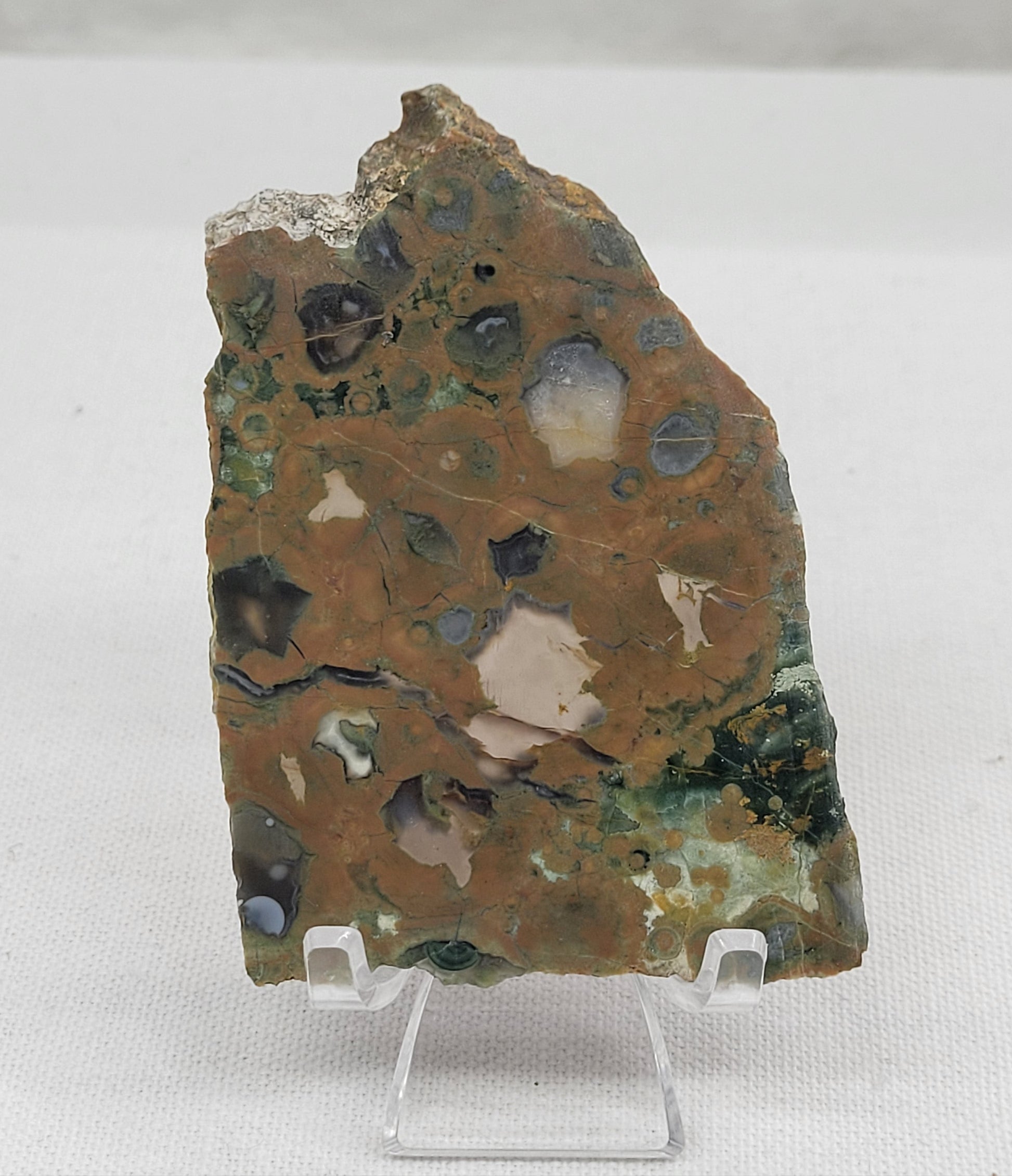 Rainforest Jasper is a rare type of rhyolitic lava, associated with volcanic activity in some areas. Gas bubbles are trapped in the lava flow during solidification, creating pockets which are later filled, or partially filled by flows of siliceous material, which may be Agate, Jasper, Quartz Crystal or other minerals.