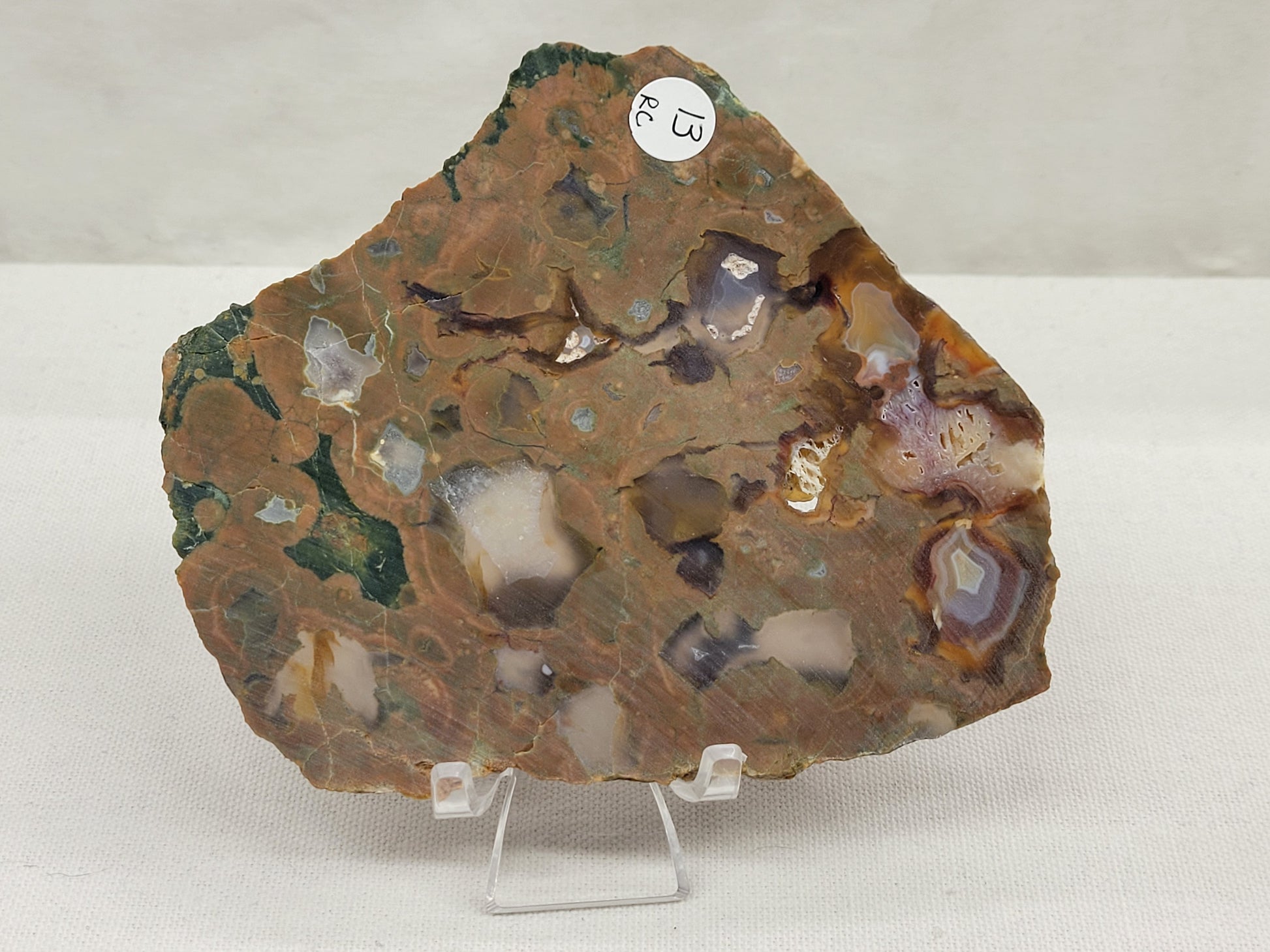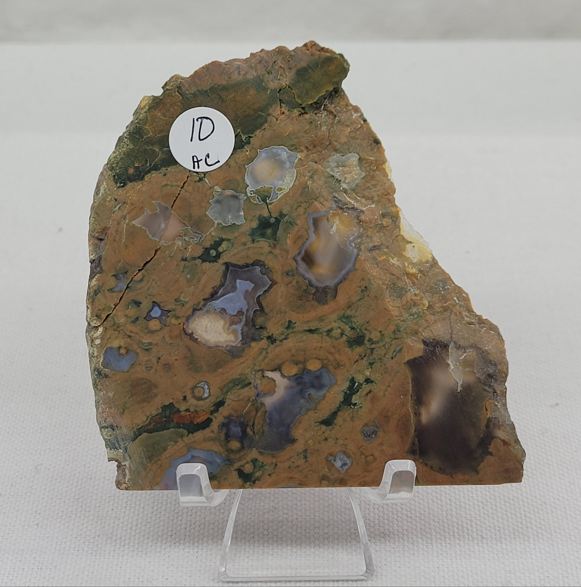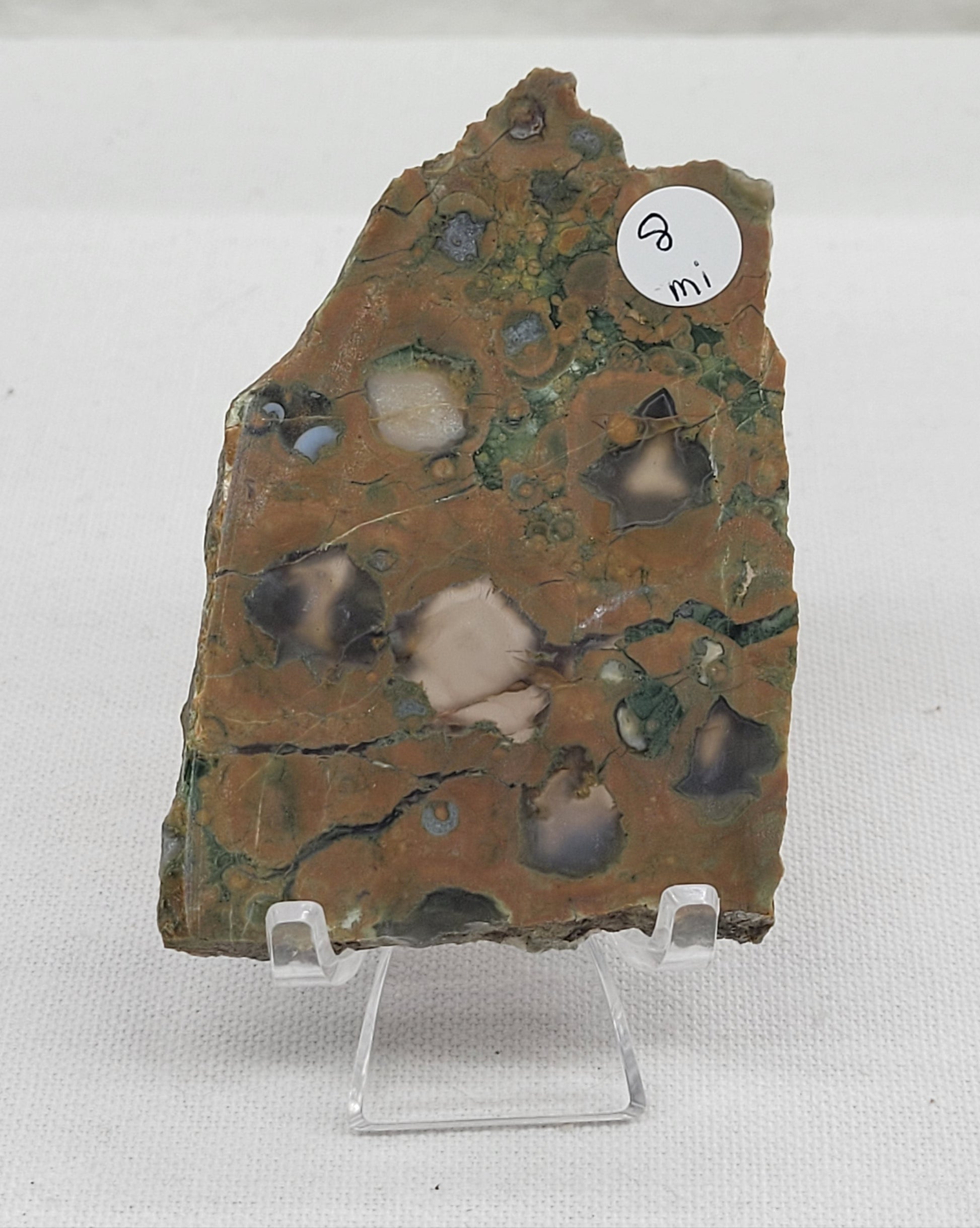 Rainforest Jasper is a rare type of rhyolitic lava, associated with volcanic activity in some areas. Gas bubbles are trapped in the lava flow during solidification, creating pockets which are later filled, or partially filled by flows of siliceous material, which may be Agate, Jasper, Quartz Crystal or other minerals.
