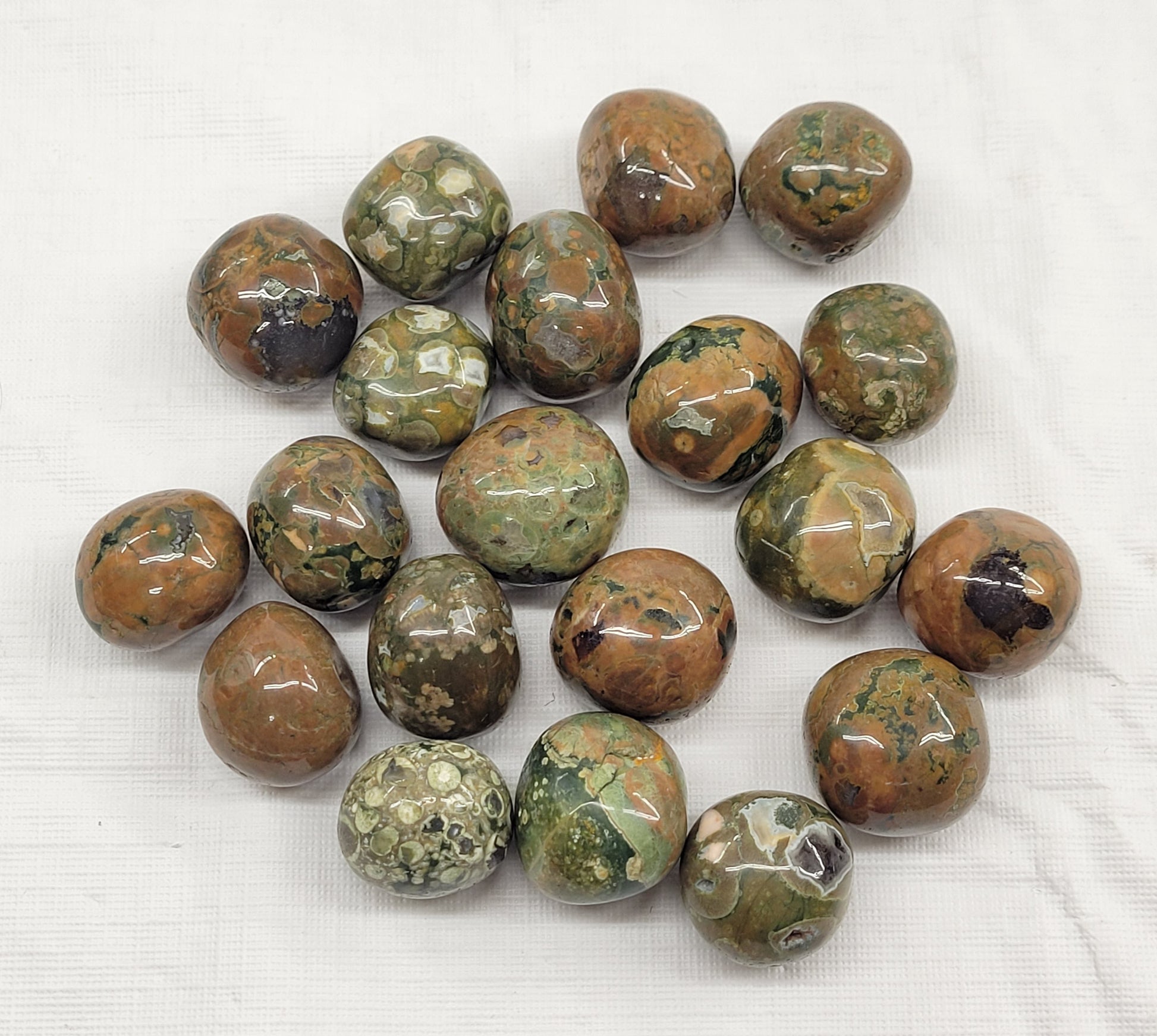 Rainforest Jasper is a rare type of rhyolitic lava, associated with volcanic activity in some areas. Gas bubbles are trapped in the lava flow during solidification, creating pockets which are later filled, or partially filled by flows of siliceous material, which may be Agate, Jasper, Quartz Crystal or other minerals.