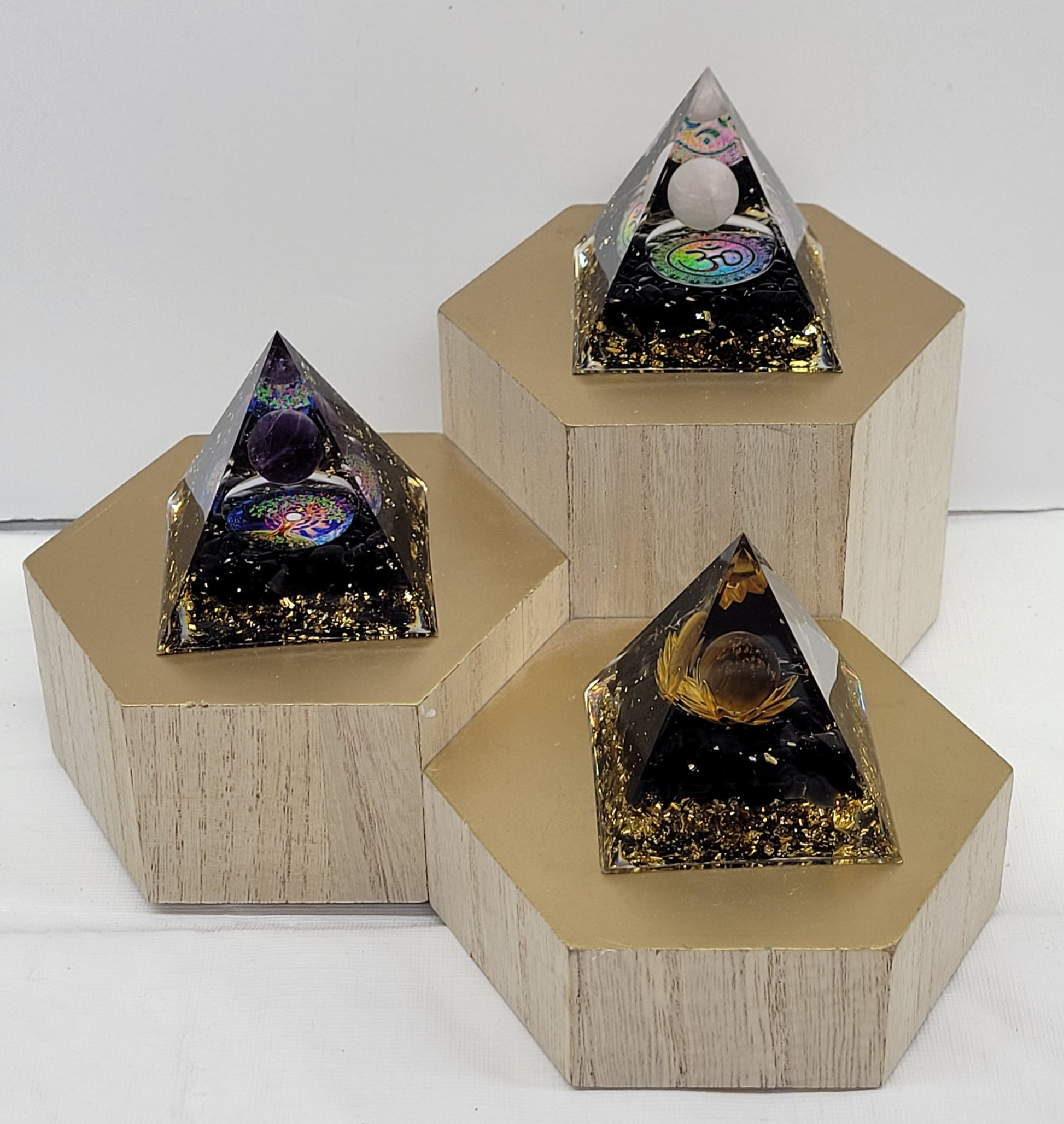 A variety of resin pyramids with crystal chips.