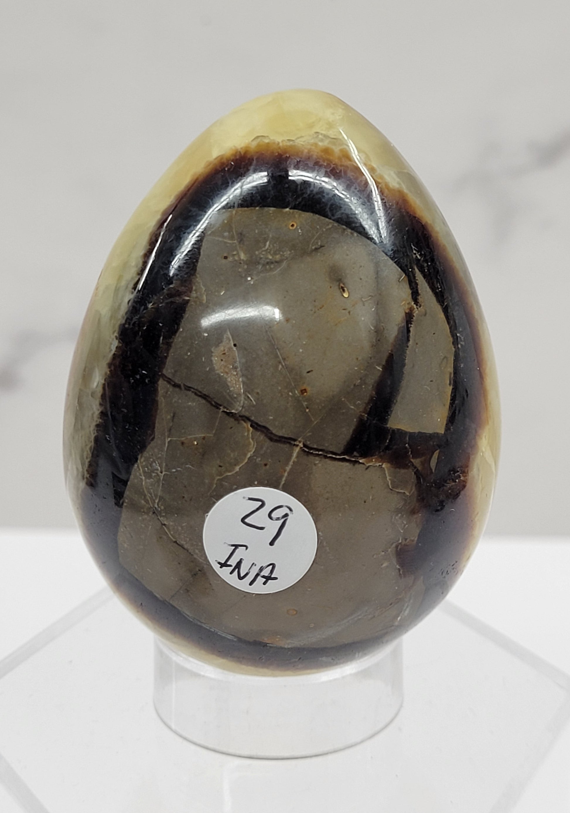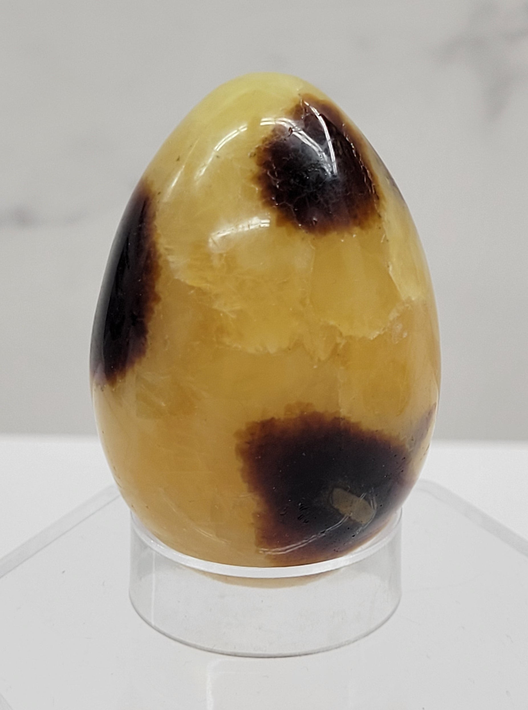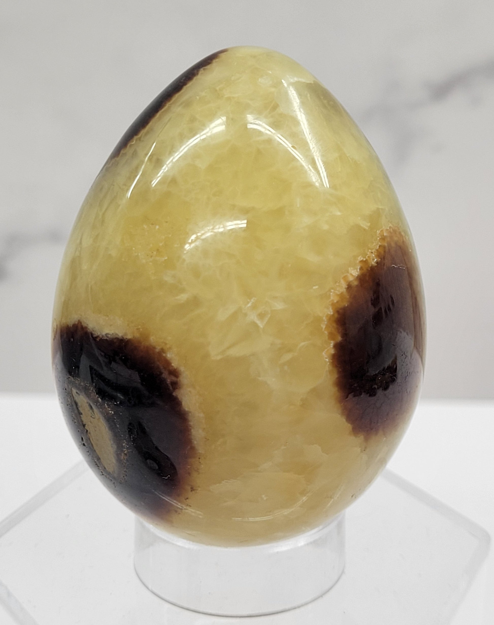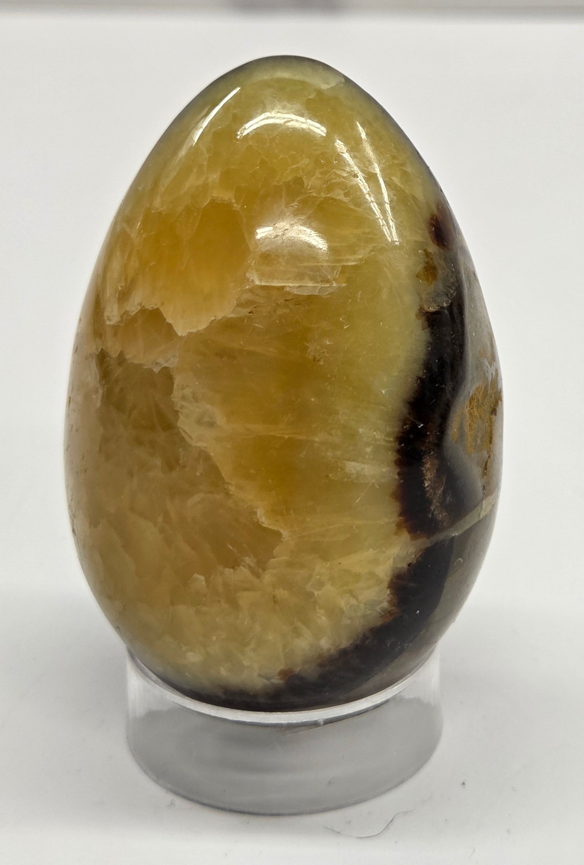 Septarian, also referred to as Dragon Stone, is a tri color concretion composed of Aragonite (the brown), Calcite, (the yellow), and Limestone (the grey). This unique mineral was formed around 50 to 70 million years ago during Earth’s Cretaceous Period. Sea life during that time became attracted to the molten sediment that was produced by these massive volcanic eruptions. Overtime as sea life began to die, their chemical composition became enriched in sedimentary rock, forming the nodules we see today. As oceans began to recede around the world, the water within soon dried out and massive cracks formed internally. The chemicals within the dead sea life eventually crystallized and formed Aragonite “crusts” and drusy Calcite crystals. Most Septarian Nodules are from Utah, where the Gulf Of Mexico once spanned to, as well as Madagascar, which was under very similar conditions during that time period.