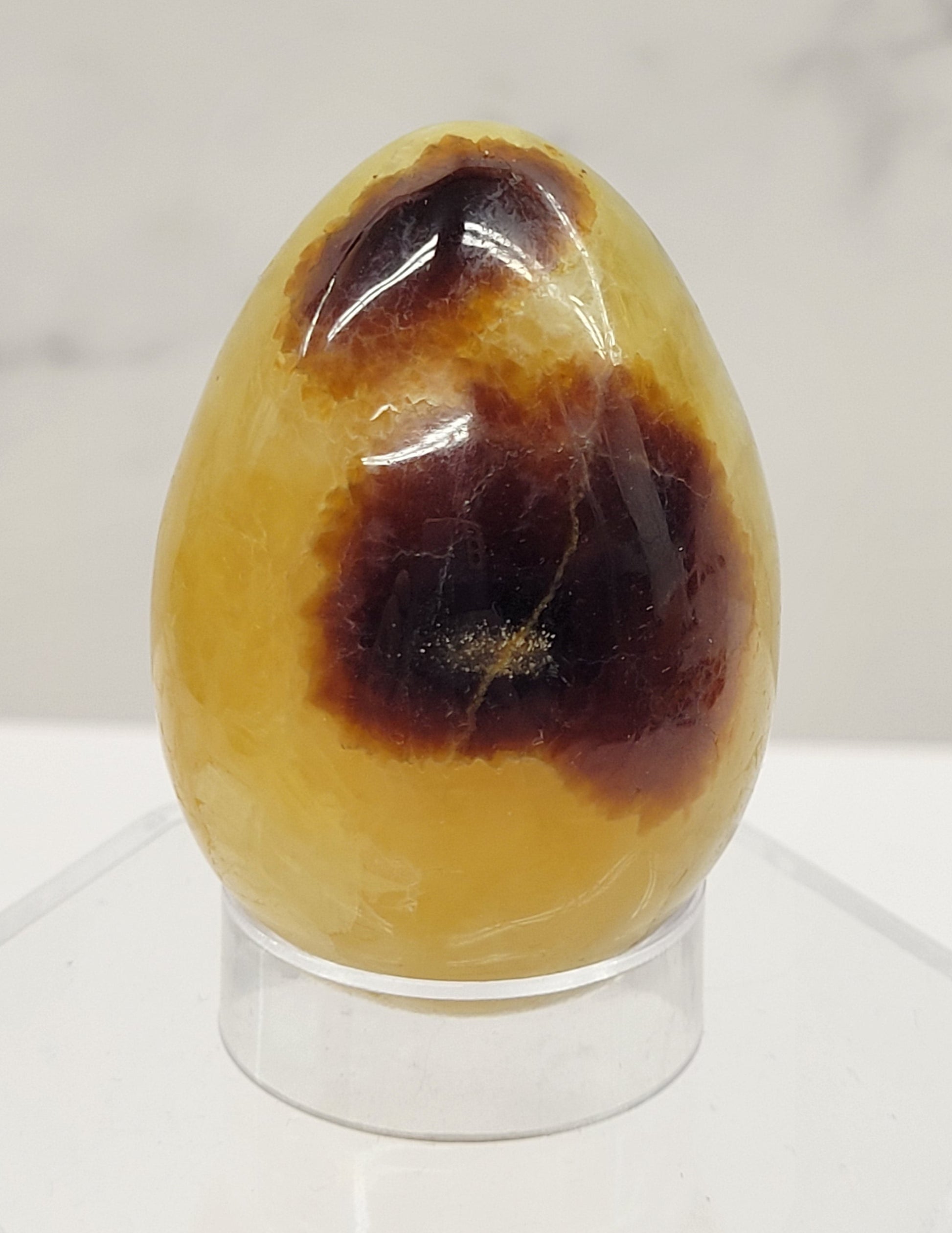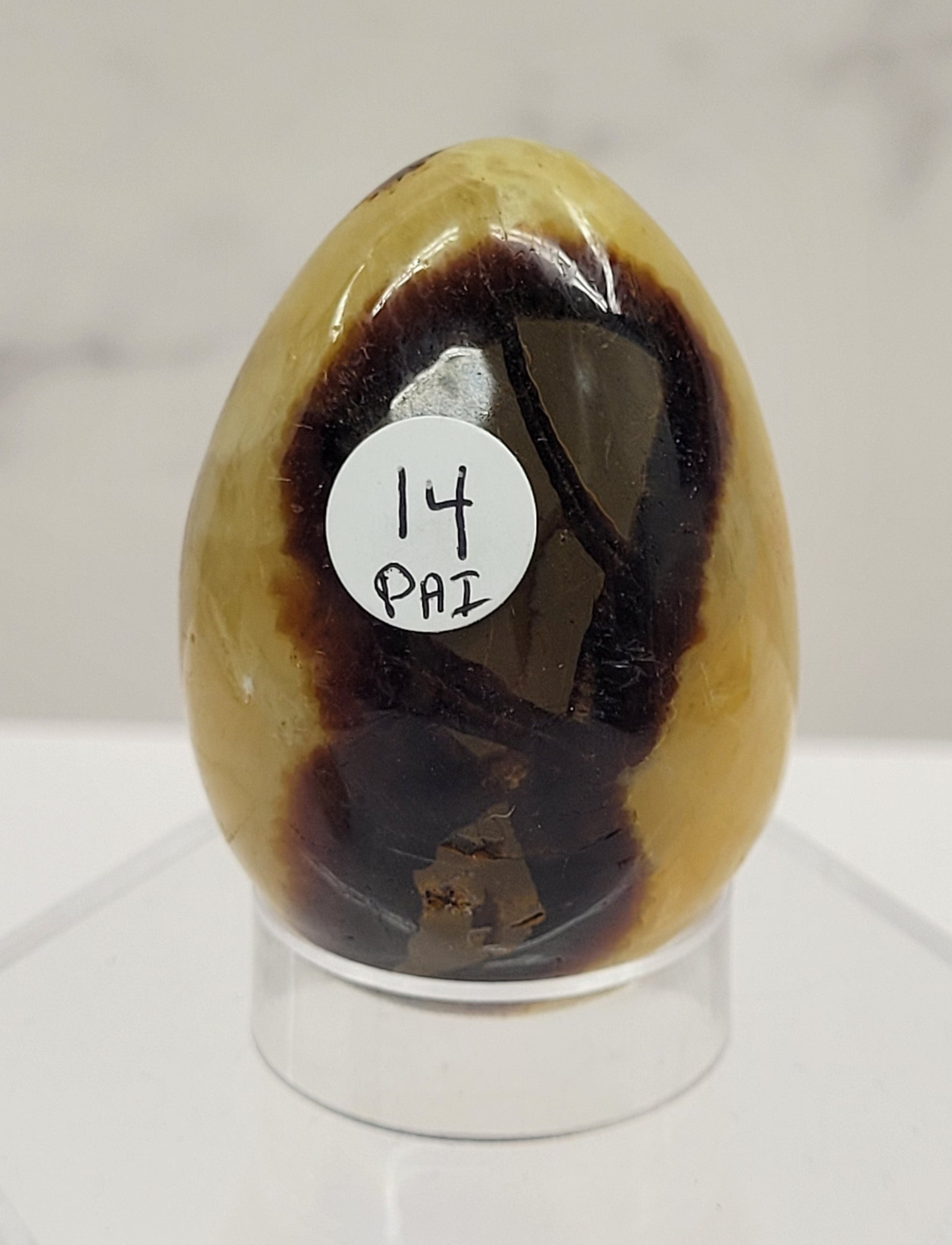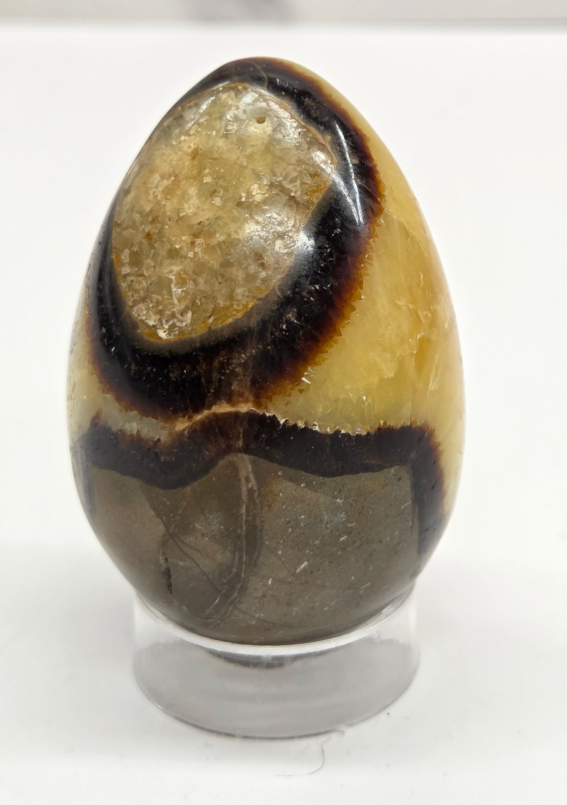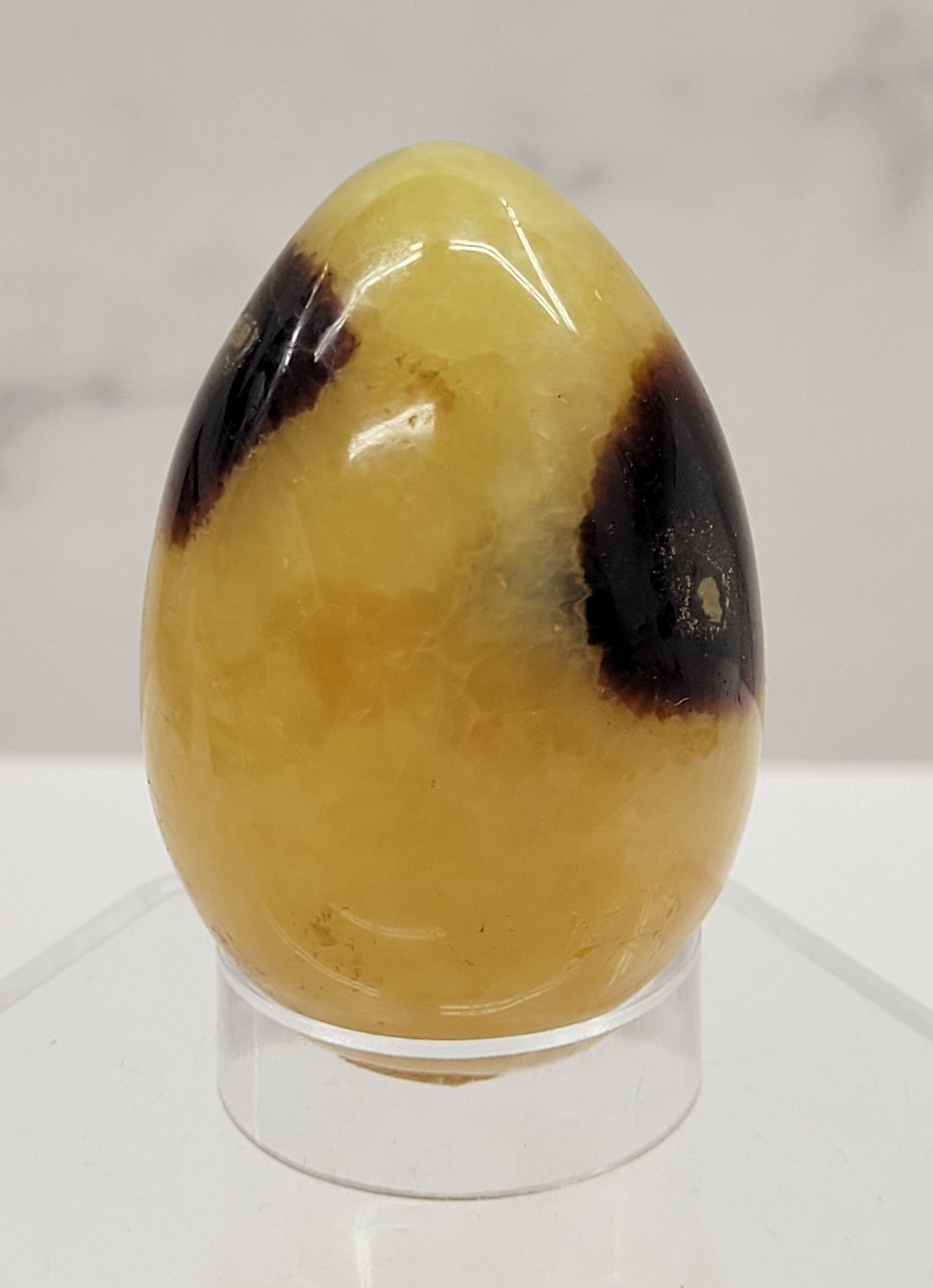 Septarian, also referred to as Dragon Stone, is a tri color concretion composed of Aragonite (the brown), Calcite, (the yellow), and Limestone (the grey). This unique mineral was formed around 50 to 70 million years ago during Earth’s Cretaceous Period. Sea life during that time became attracted to the molten sediment that was produced by these massive volcanic eruptions. Overtime as sea life began to die, their chemical composition became enriched in sedimentary rock, forming the nodules we see today. As oceans began to recede around the world, the water within soon dried out and massive cracks formed internally. The chemicals within the dead sea life eventually crystallized and formed Aragonite “crusts” and drusy Calcite crystals. Most Septarian Nodules are from Utah, where the Gulf Of Mexico once spanned to, as well as Madagascar, which was under very similar conditions during that time period.