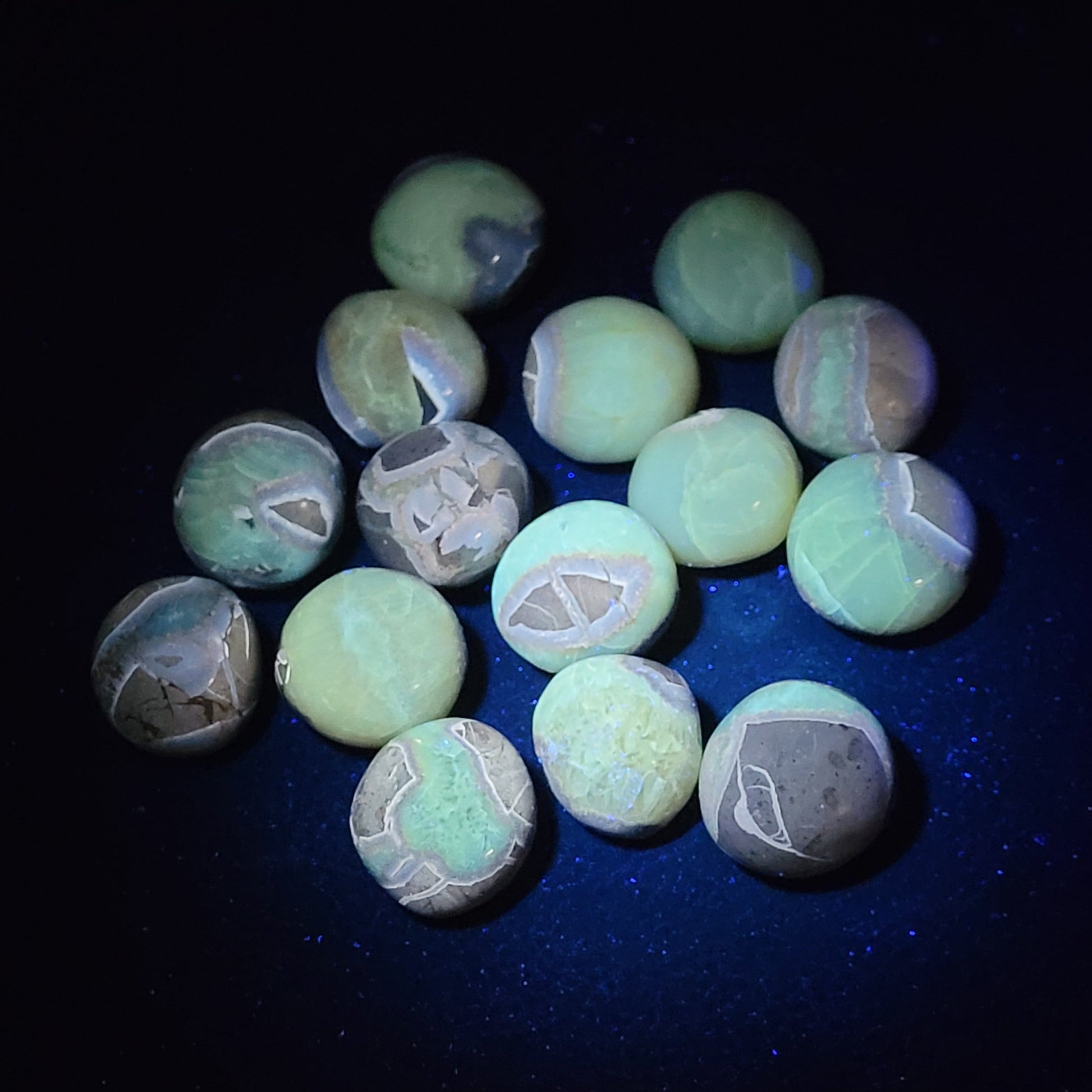 Septarian, also referred to as Dragon Stone, is a tri color concretion composed of Aragonite (the brown), Calcite, (the yellow), and Limestone (the grey). This unique mineral was formed around 50 to 70 million years ago during Earth’s Cretaceous Period. Sea life during that time became attracted to the molten sediment that was produced by these massive volcanic eruptions. Overtime as sea life began to die, their chemical composition became enriched in sedimentary rock, forming the nodules we see today. As oceans began to recede around the world, the water within soon dried out and massive cracks formed internally. The chemicals within the dead sea life eventually crystallized and formed Aragonite “crusts” and drusy Calcite crystals. Most Septarian Nodules are from Utah, where the Gulf Of Mexico once spanned to, as well as Madagascar, which was under very similar conditions during that time period.