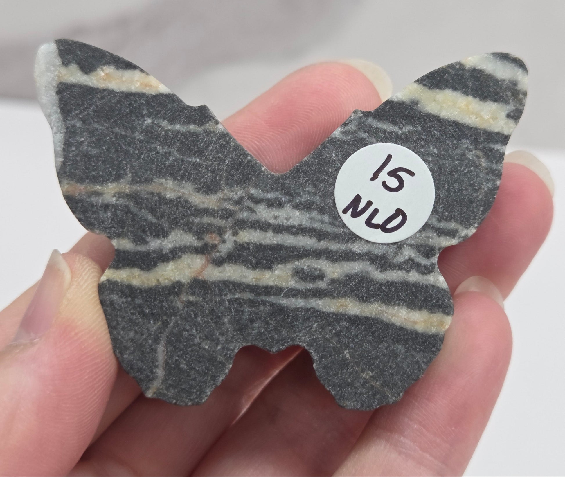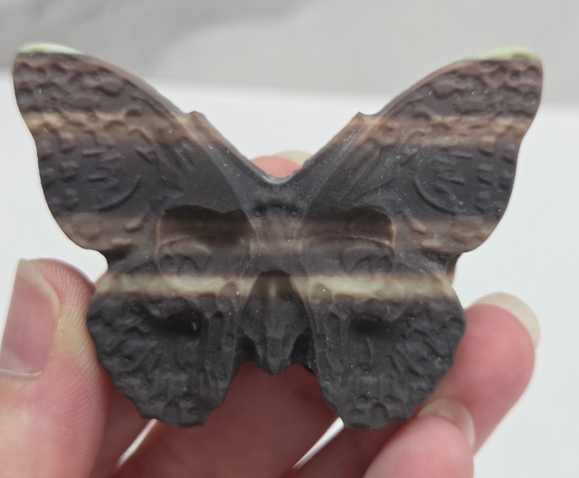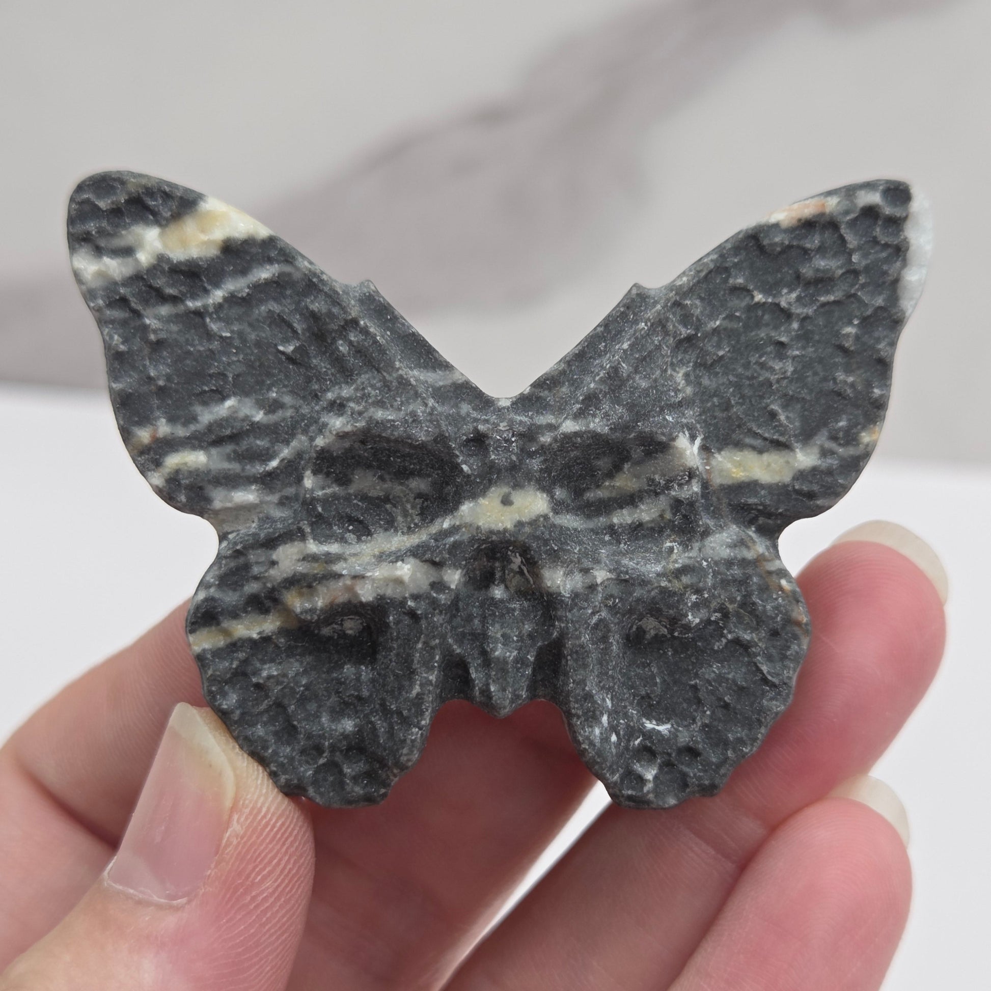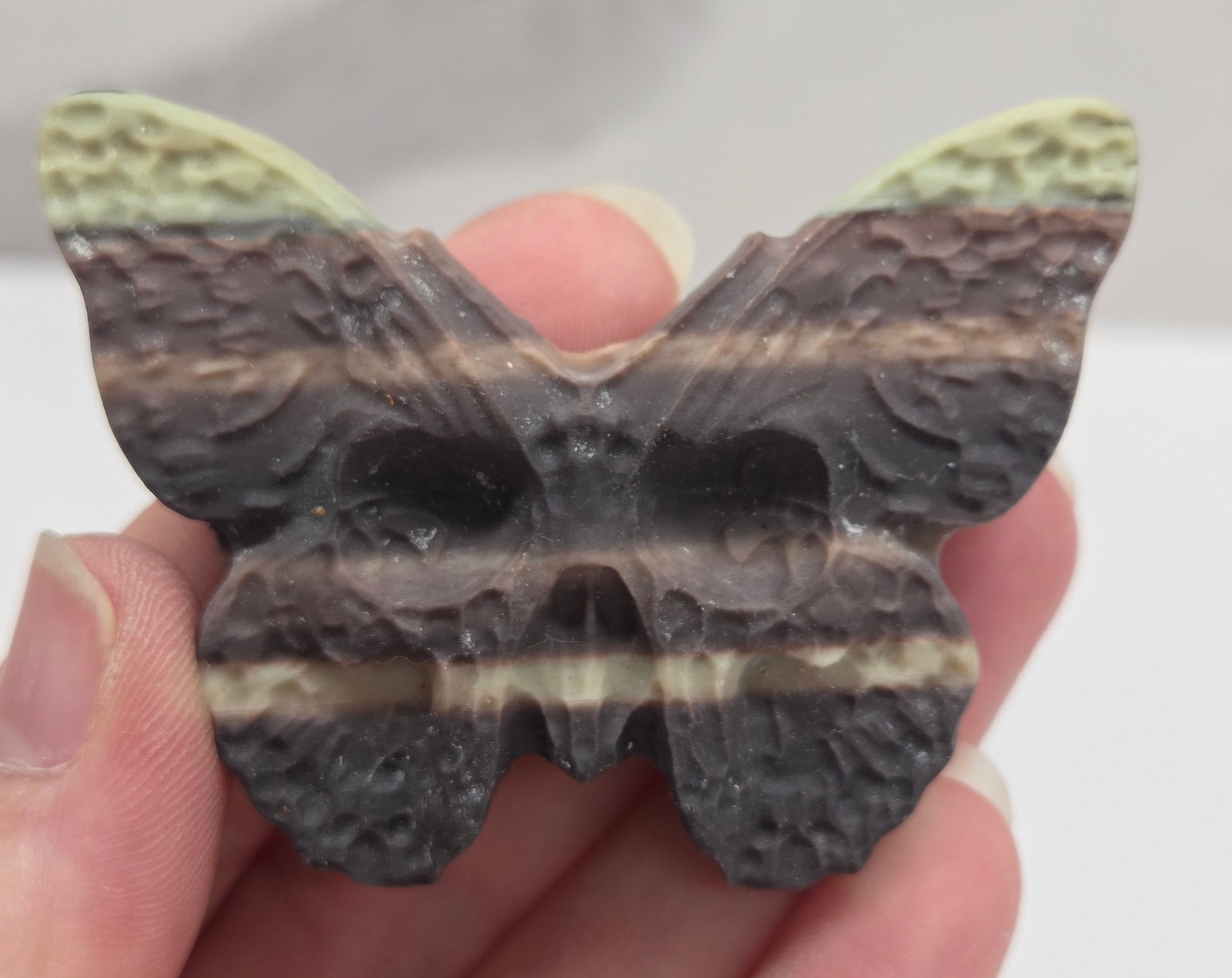 Moth/butterfly carvings with a skull in the middle. Various materials available. Each moth measures 1.8" x 2.46"