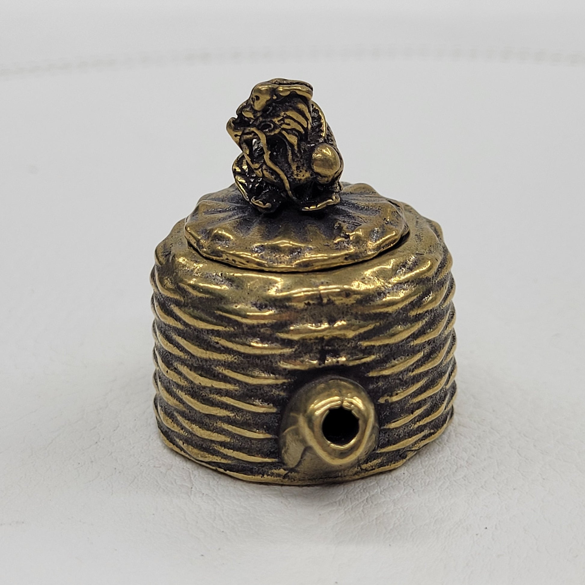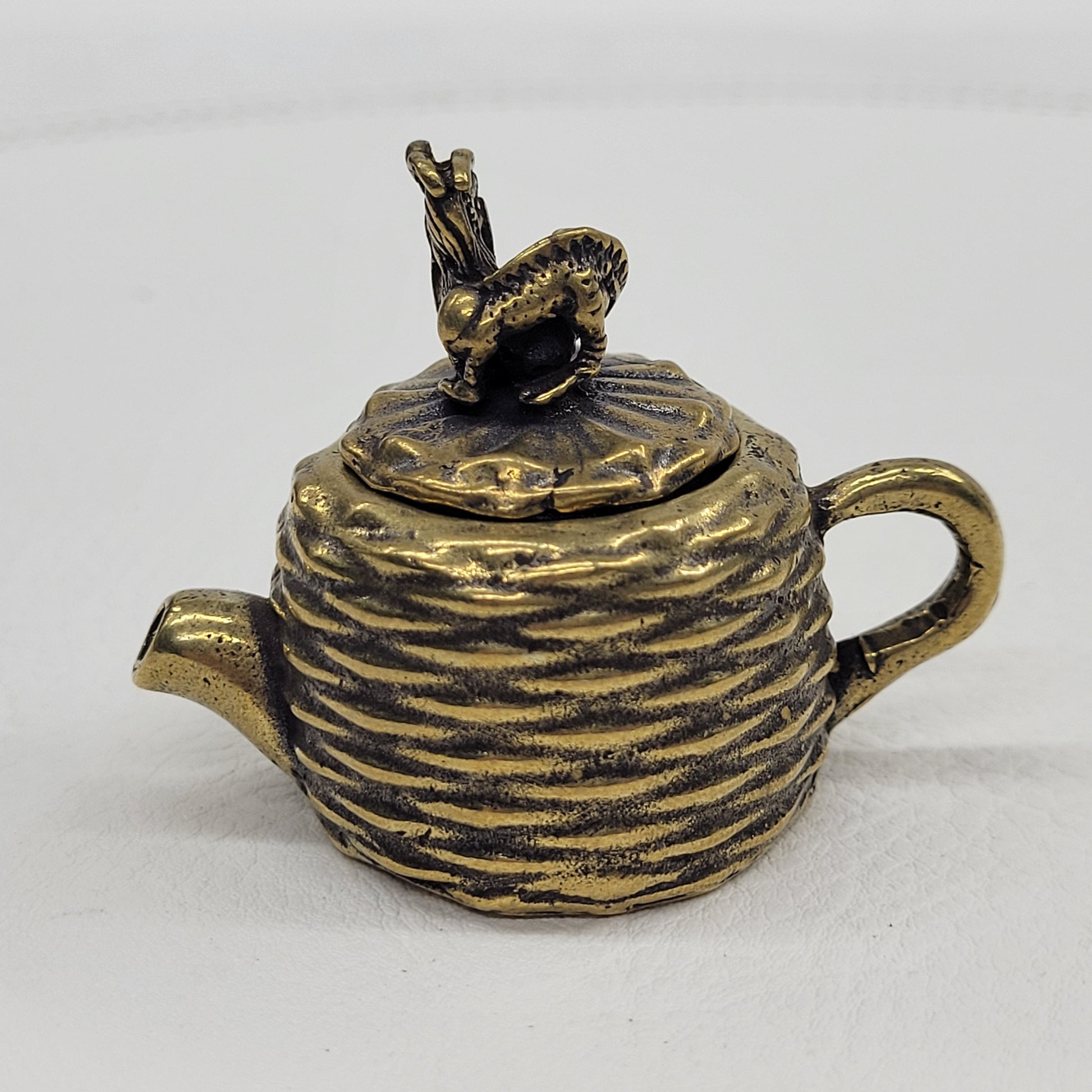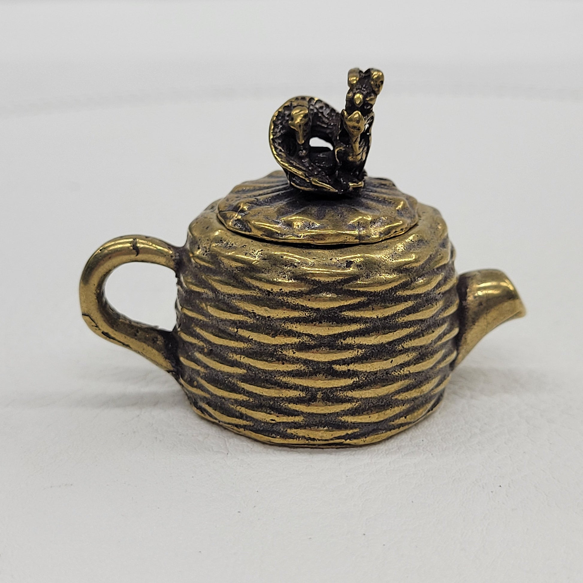 Small brass teapot with a basket weave design and a dragon on the lid.