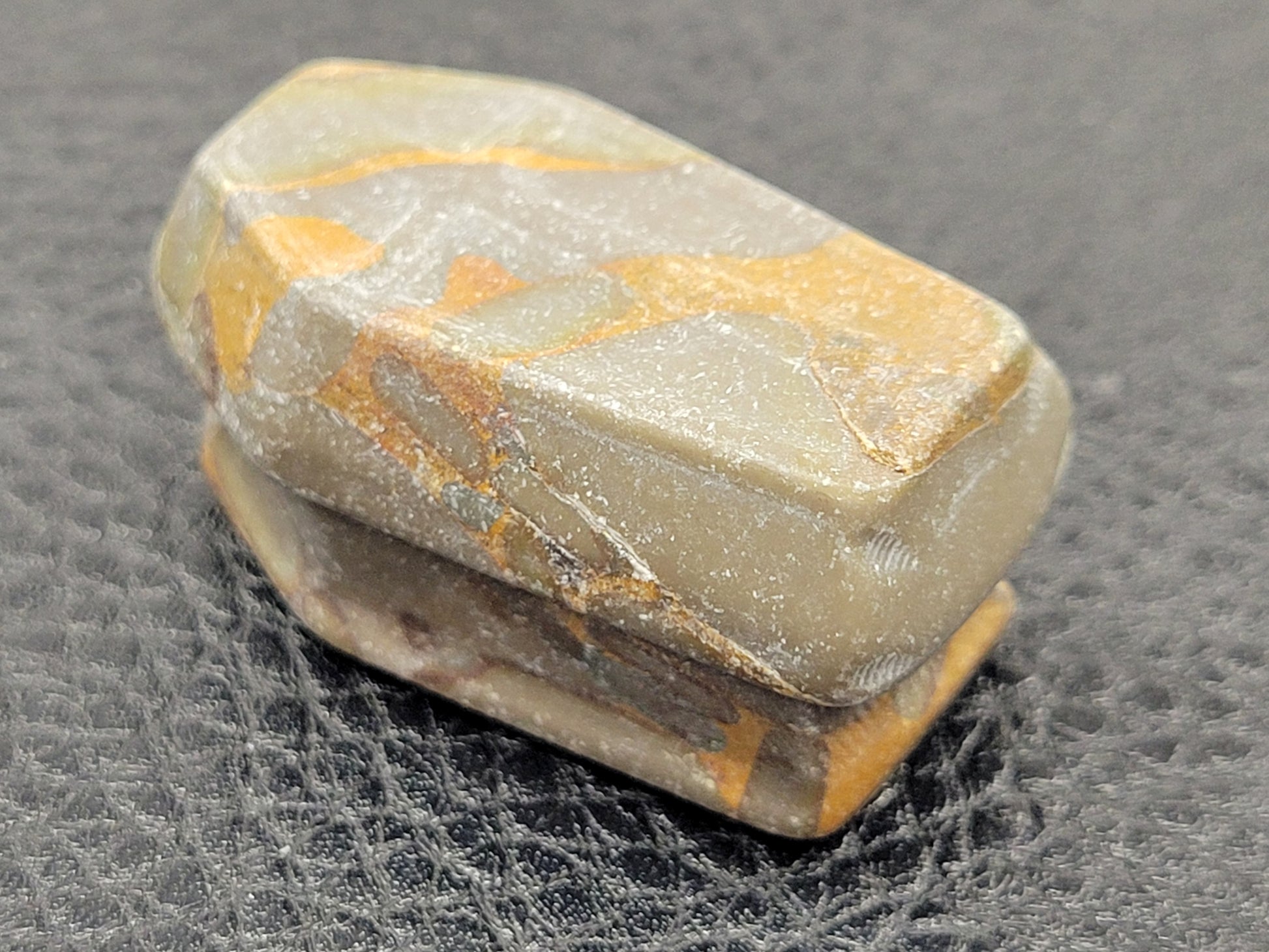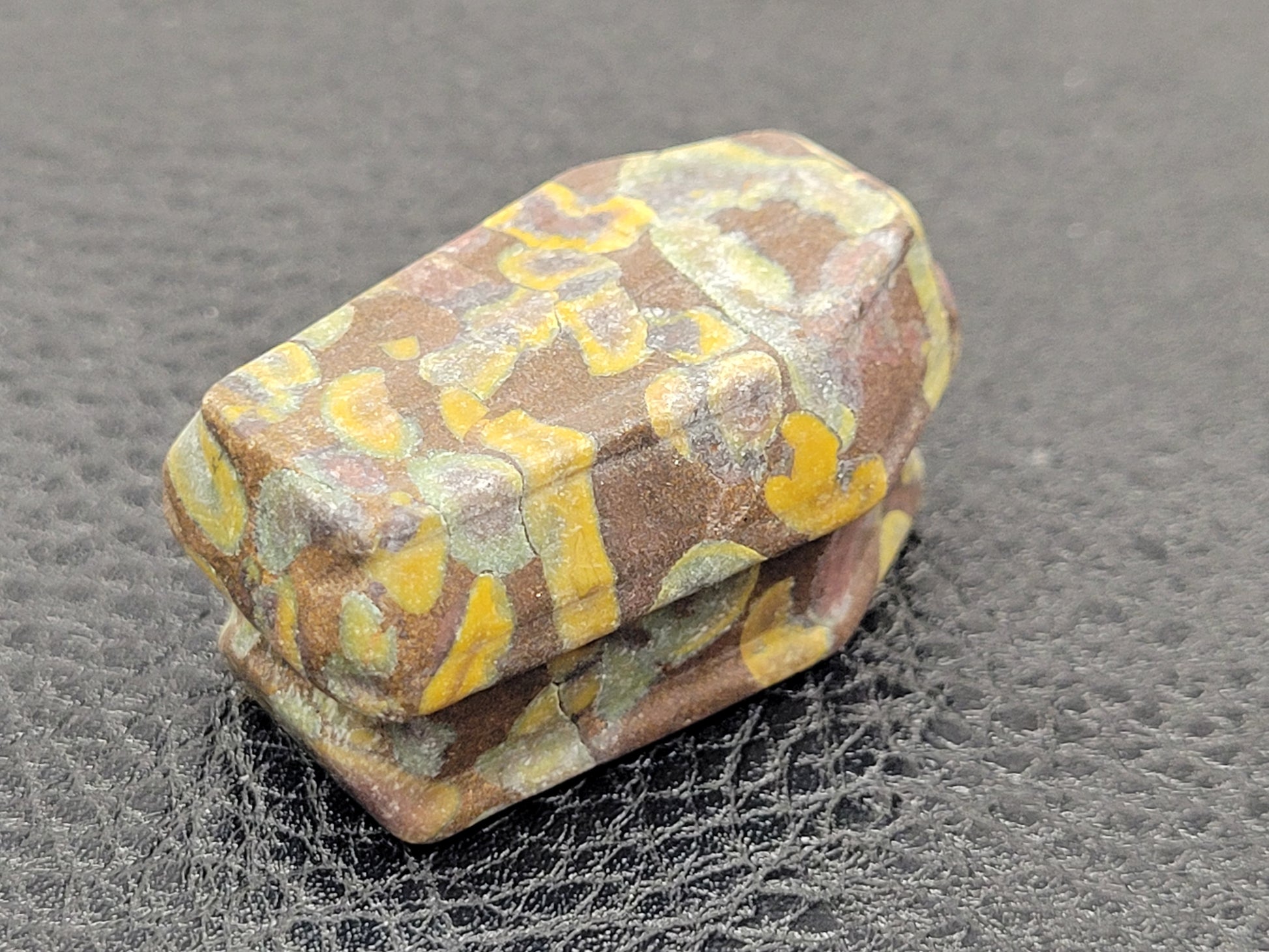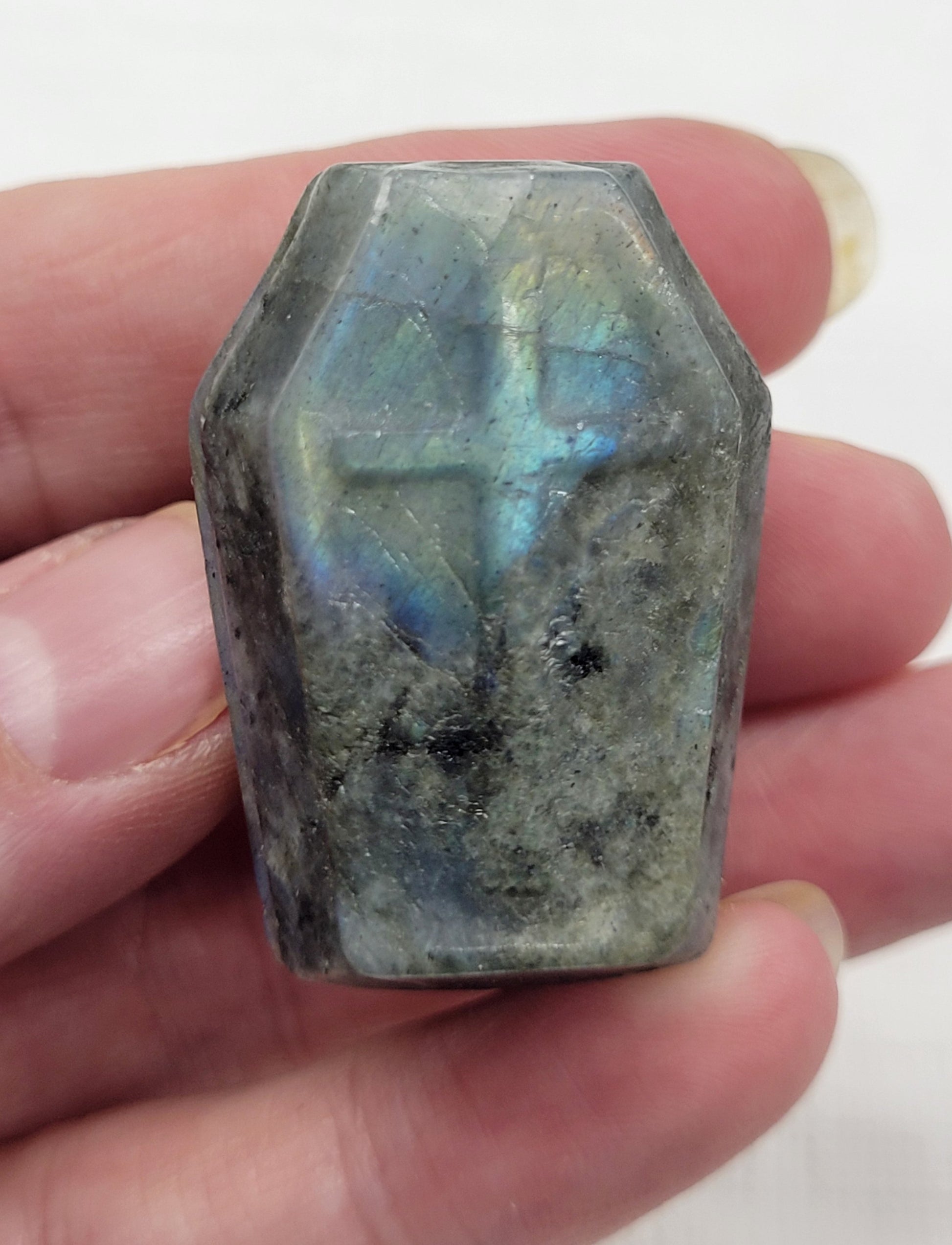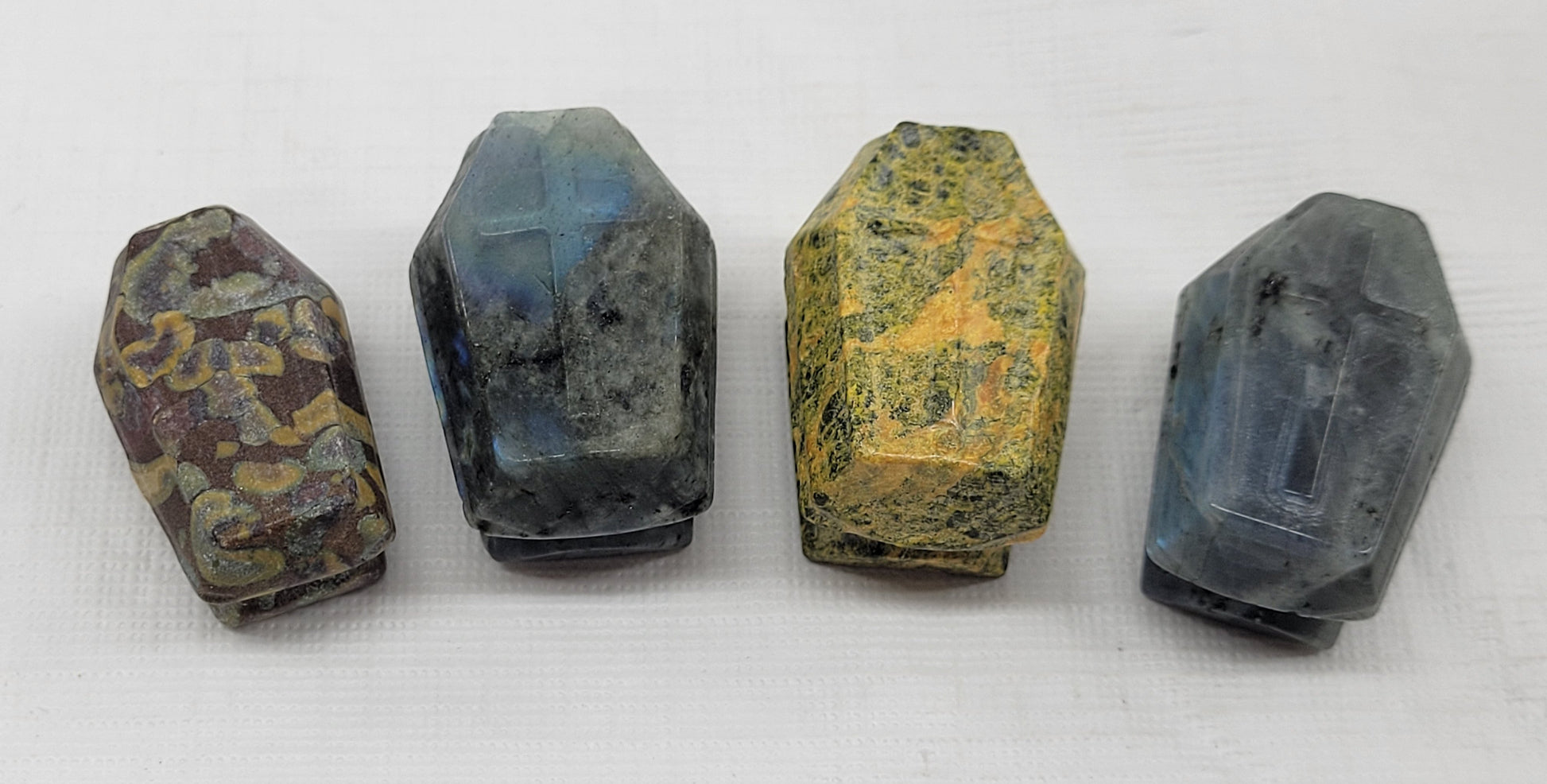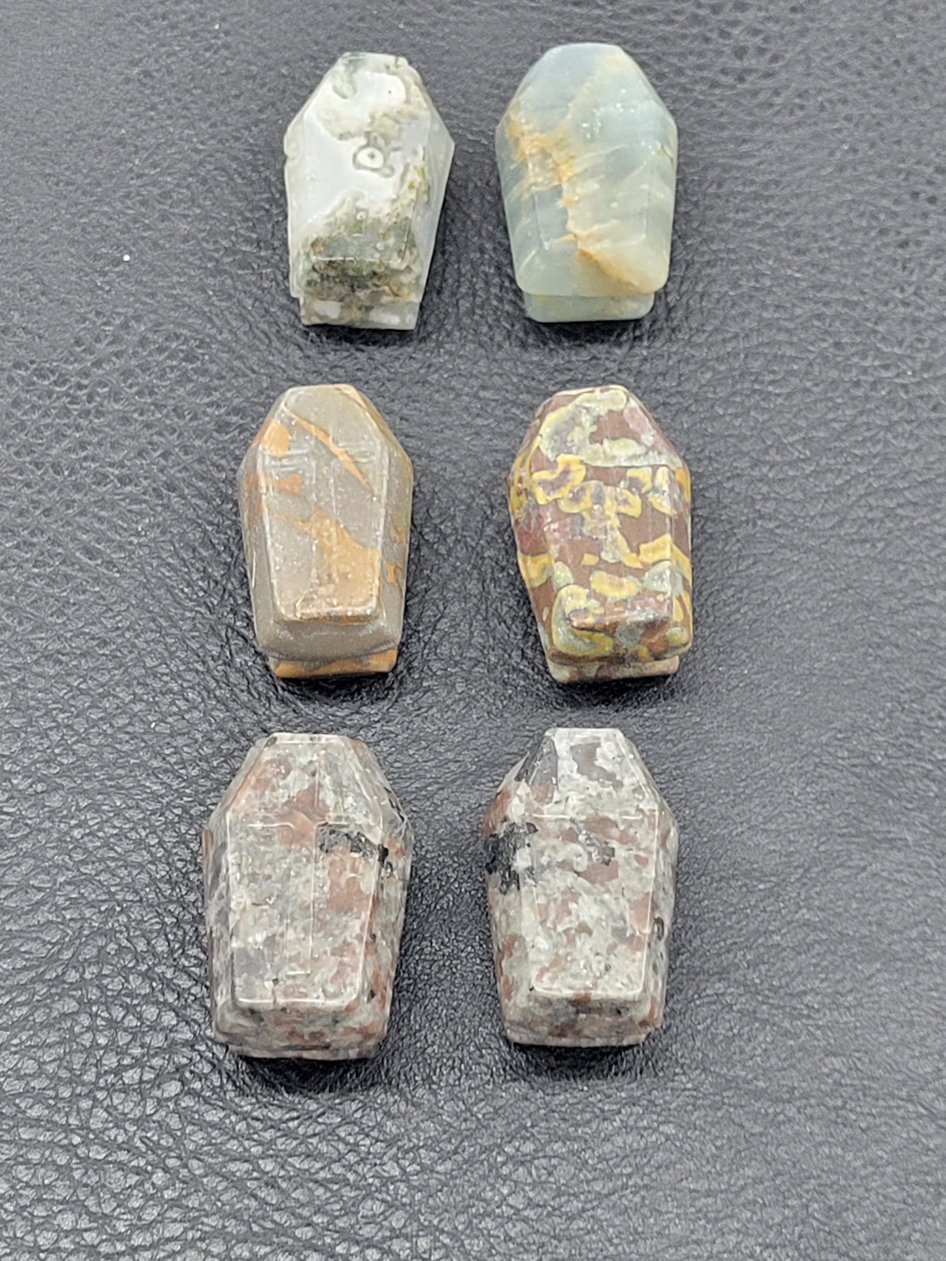 Small coffins on pedestal in a variety of materials. Each coffin is approx. 1.25" x .75"