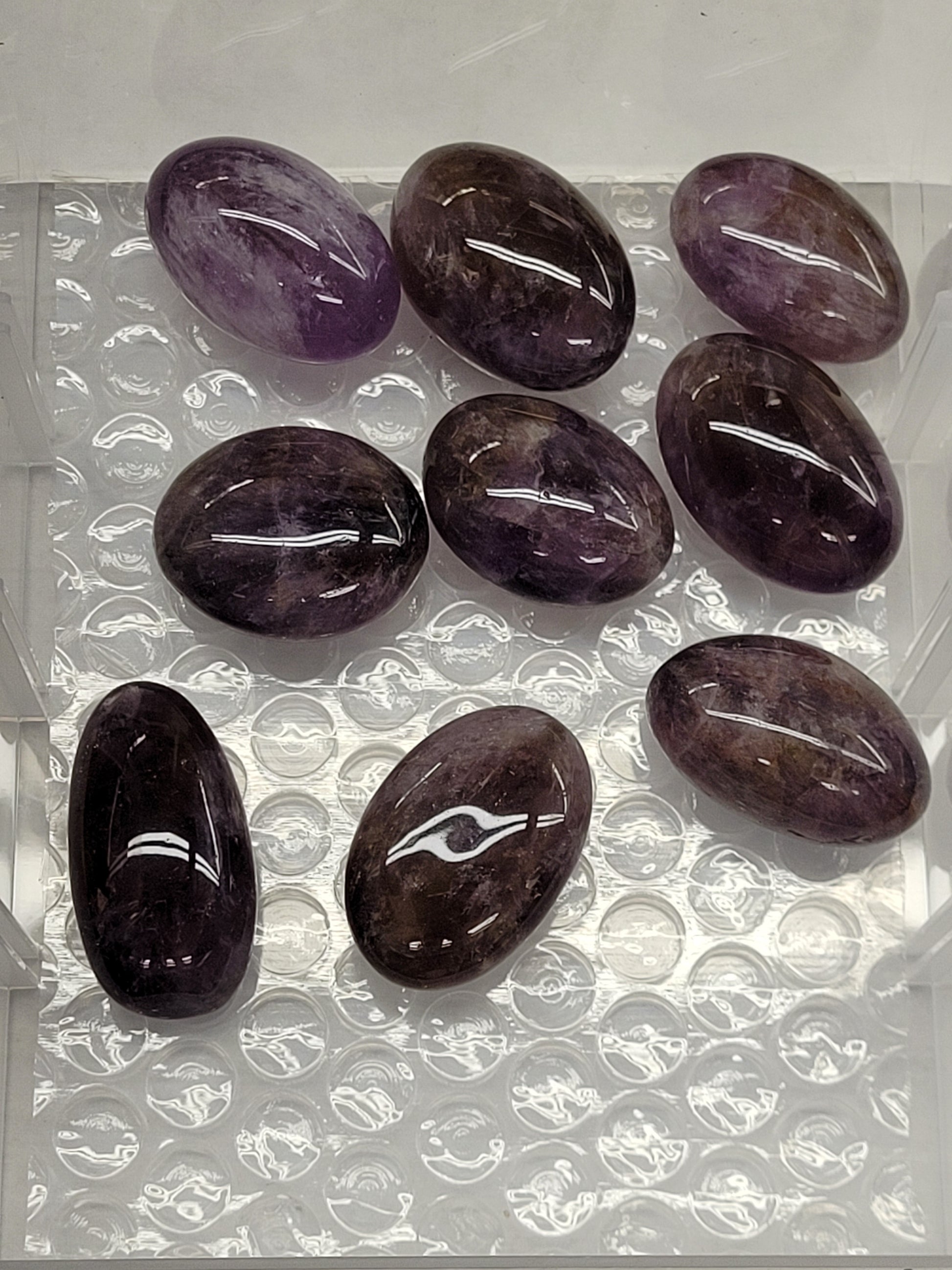 Amethyst is a purple variety of quartz and occurs in primary hues from a light lavender or pale violet to a deep purple. These tumbles have Smoky Quartz as well.