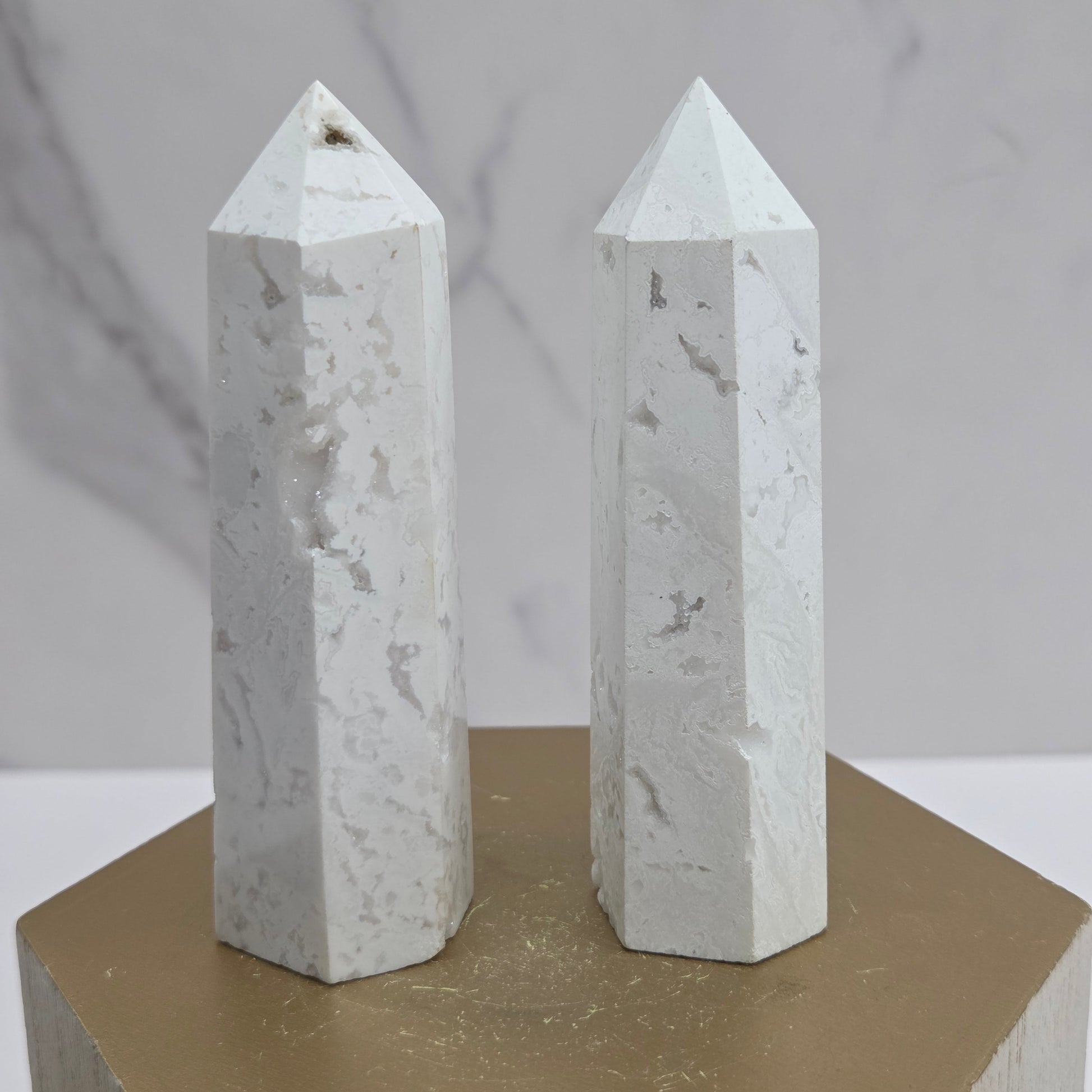 Snow agate, also known as white agate or white plume agate, is a variety of agate characterized by its white color and distinctive, soft, cloud-like patterns, often with clear or lavender drusy quartz pockets.