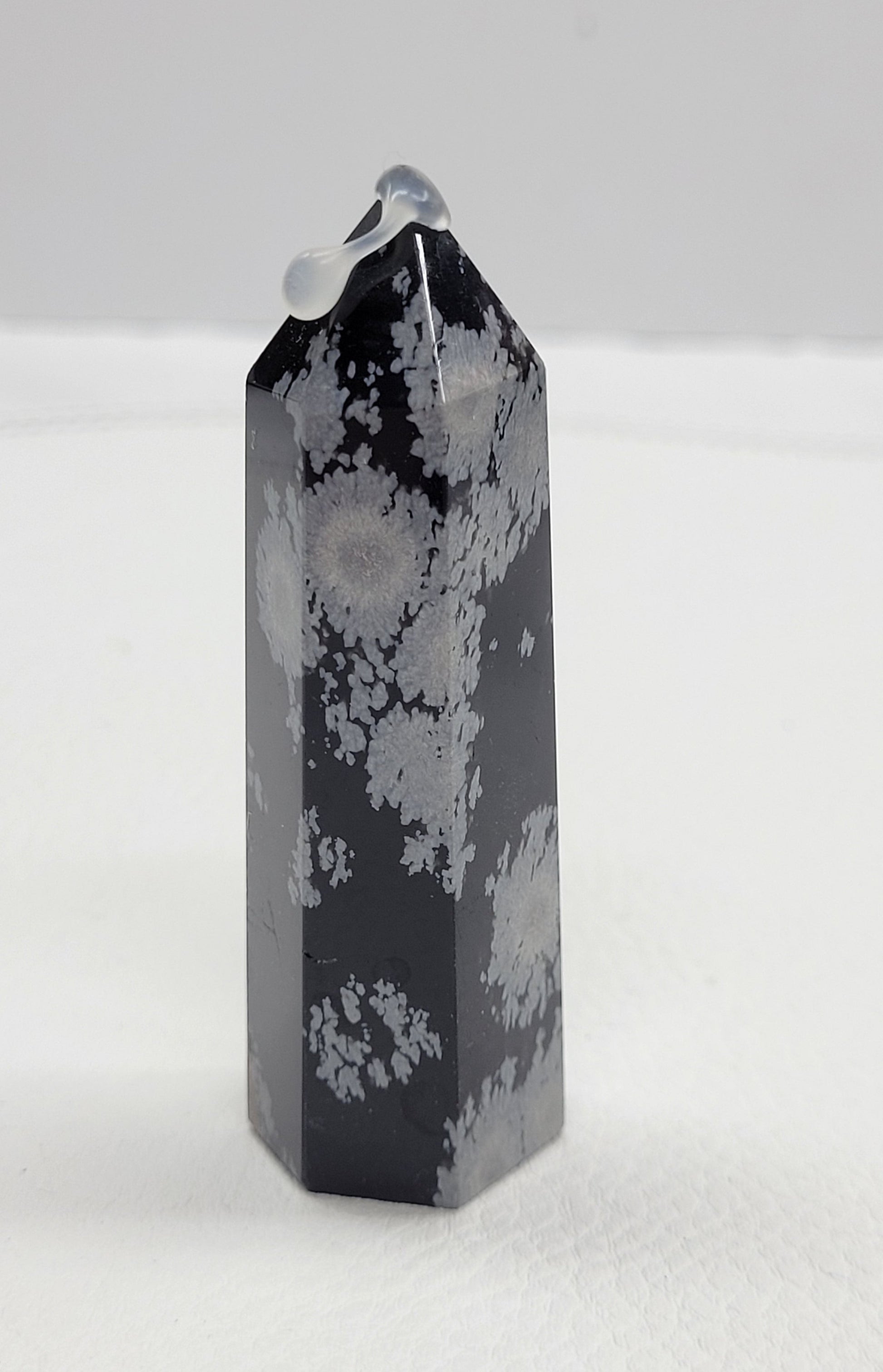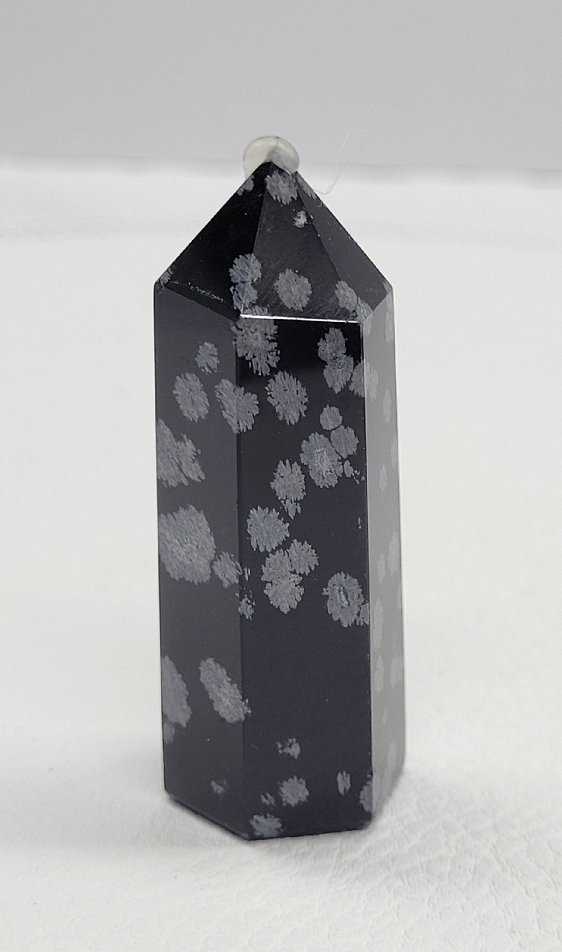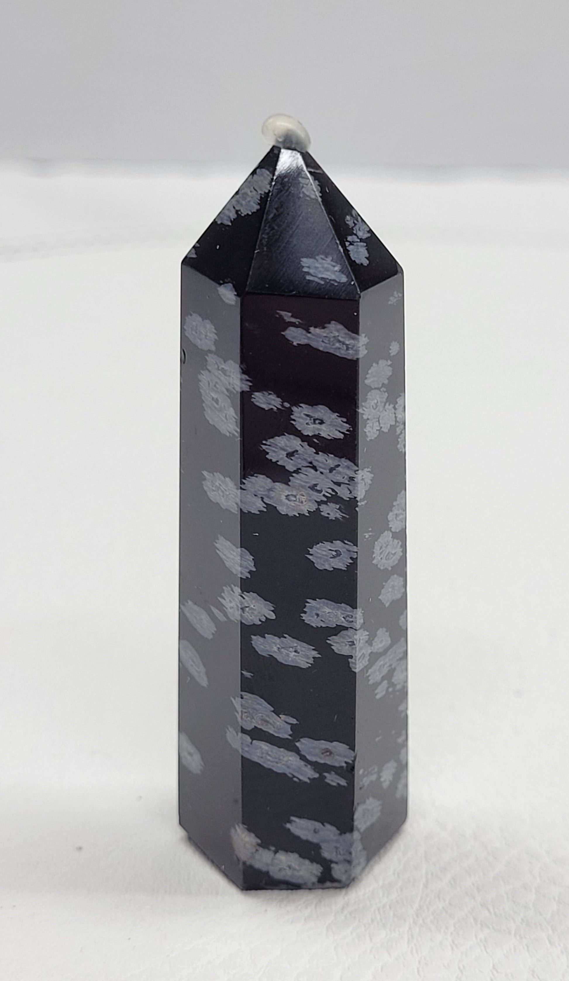 Snowflake obsidian is a type of black obsidian with white or grayish spots. These spots are called spherulites, and they are composed of needle-shaped cristobalite, a type of quartz. Snowflake Obsidian is usually black in color, with white patches called Phenocryst.