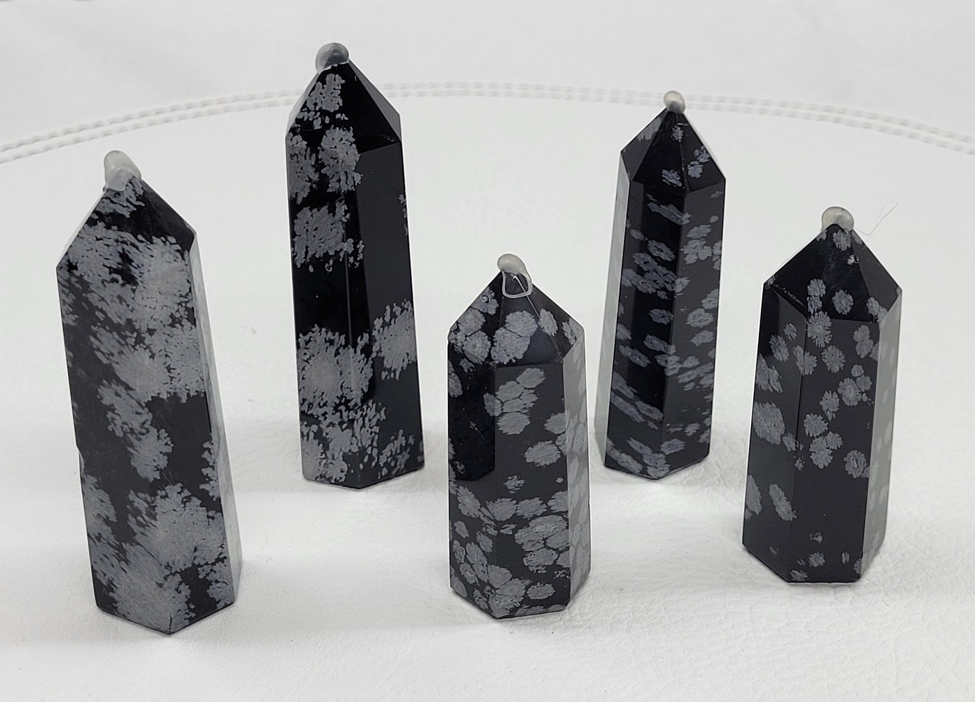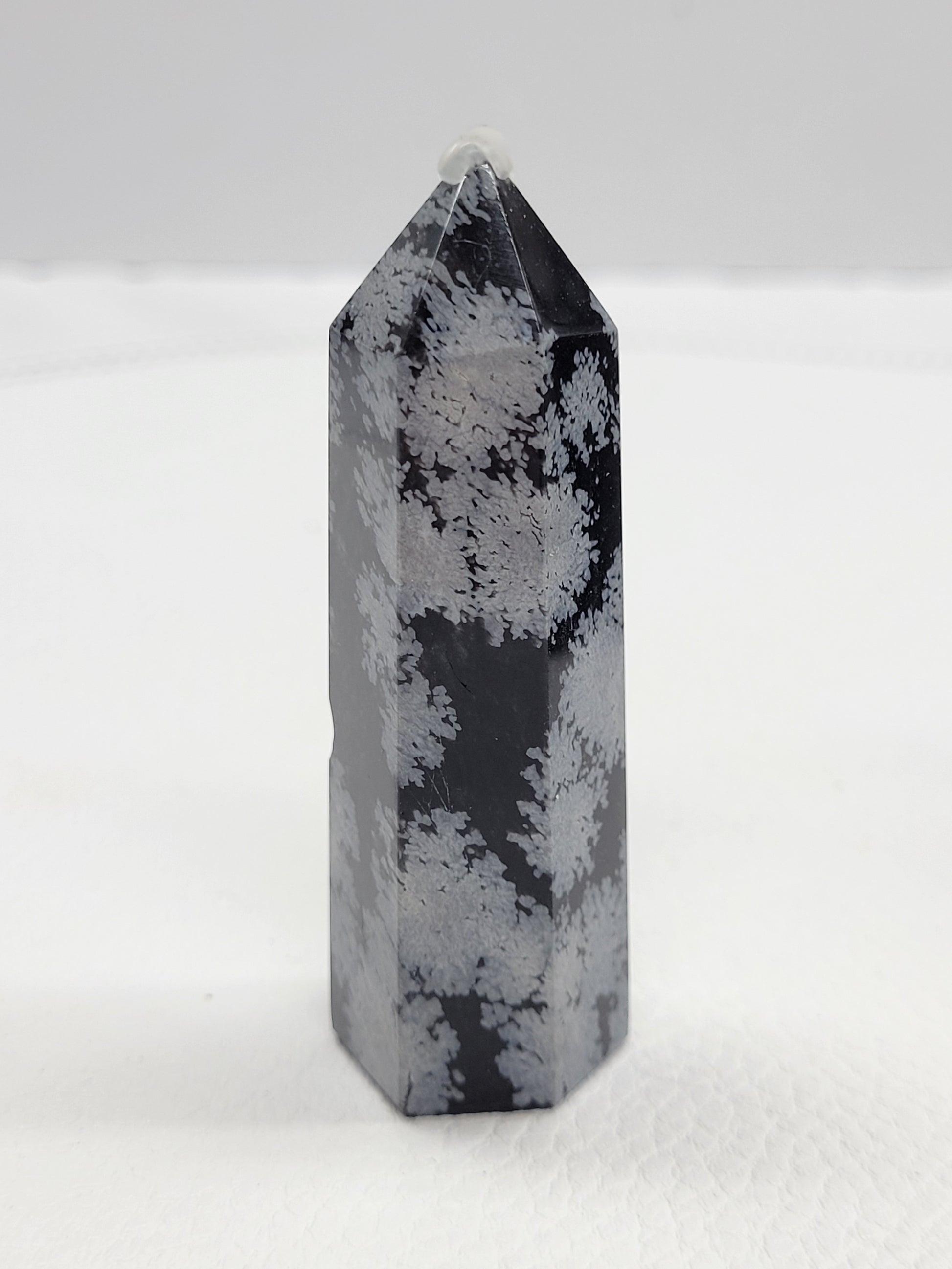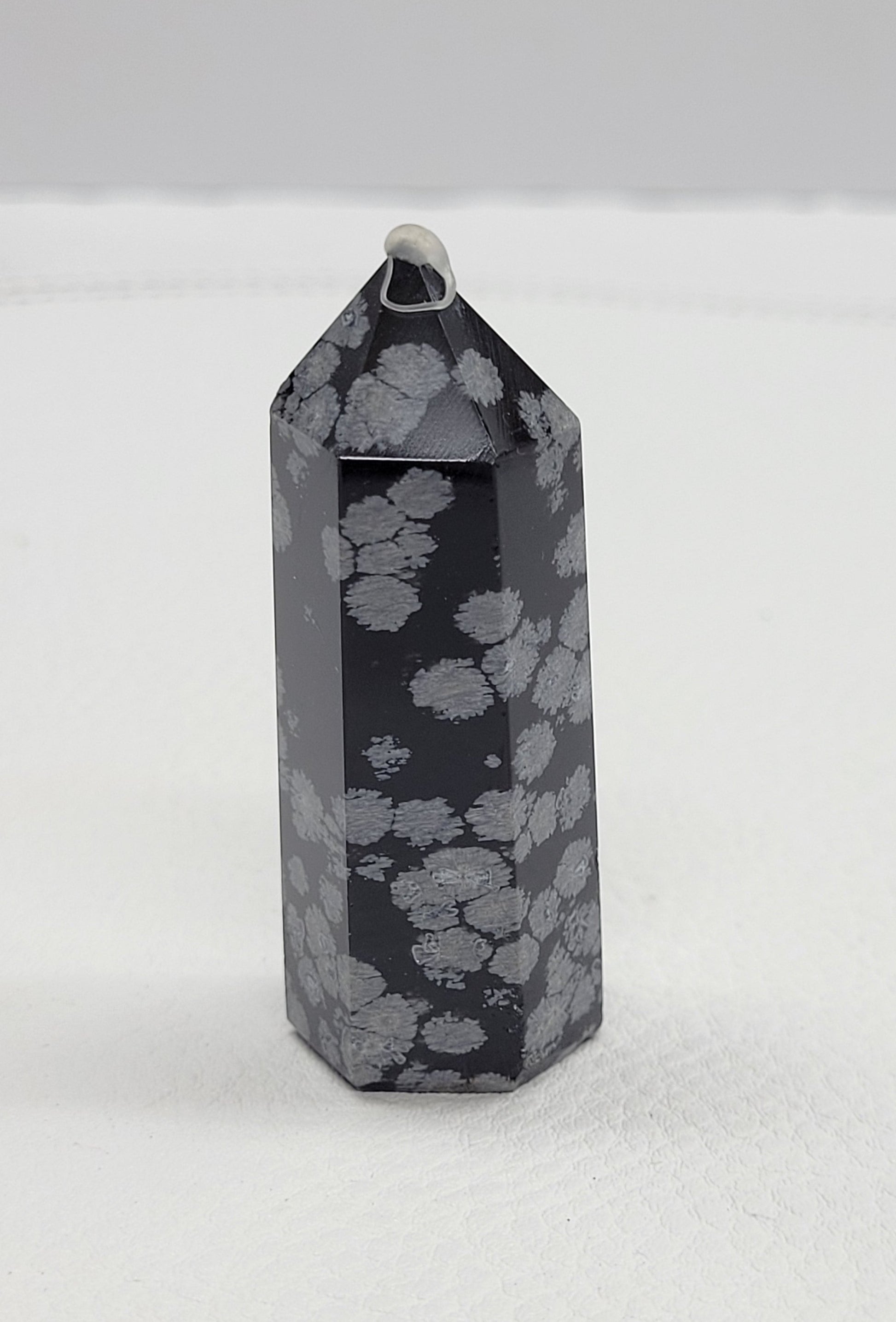 Snowflake obsidian is a type of black obsidian with white or grayish spots. These spots are called spherulites, and they are composed of needle-shaped cristobalite, a type of quartz. Snowflake Obsidian is usually black in color, with white patches called Phenocryst.