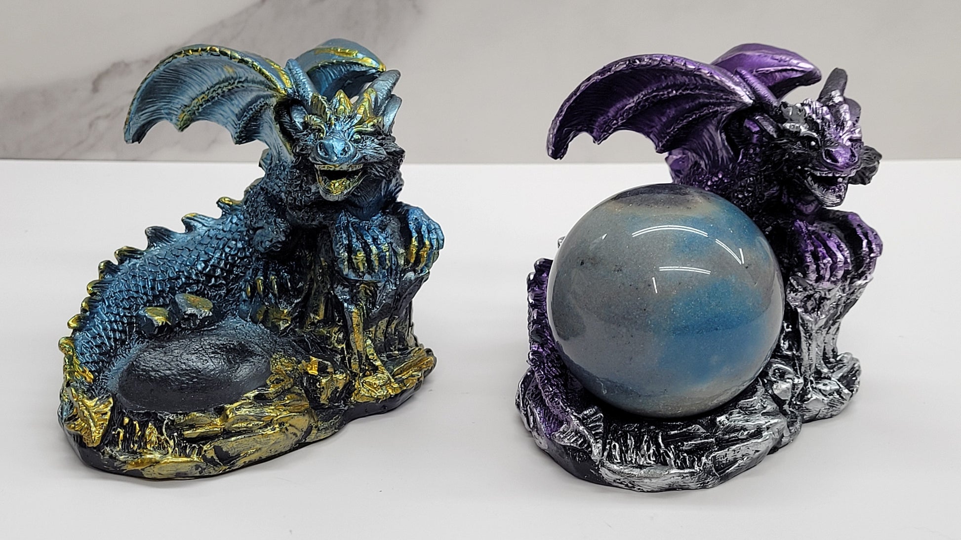 Baby dragon sphere stand/holder holds up to a 70mm. Sphere stand measures 4" x 4.5" x 3"