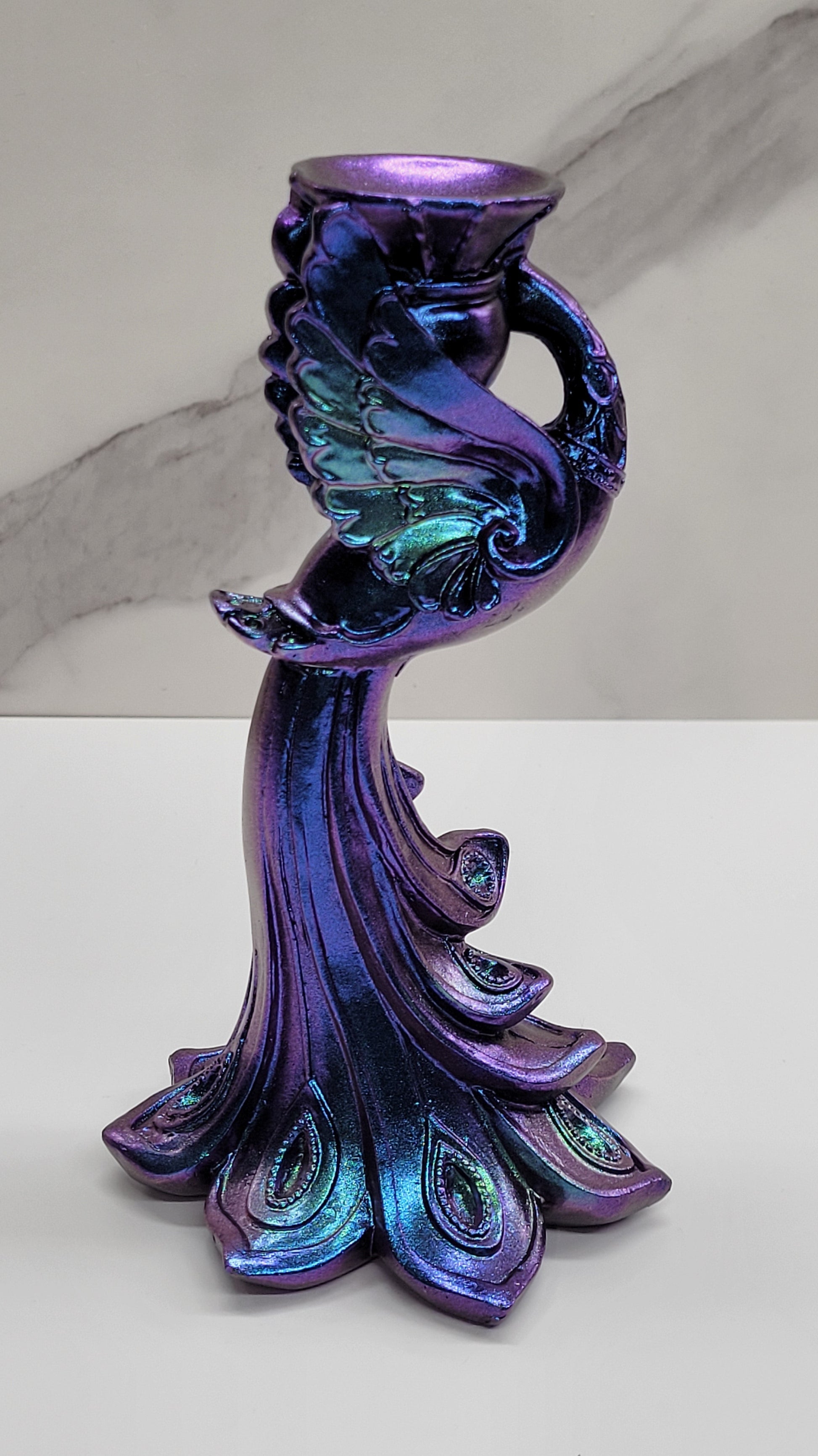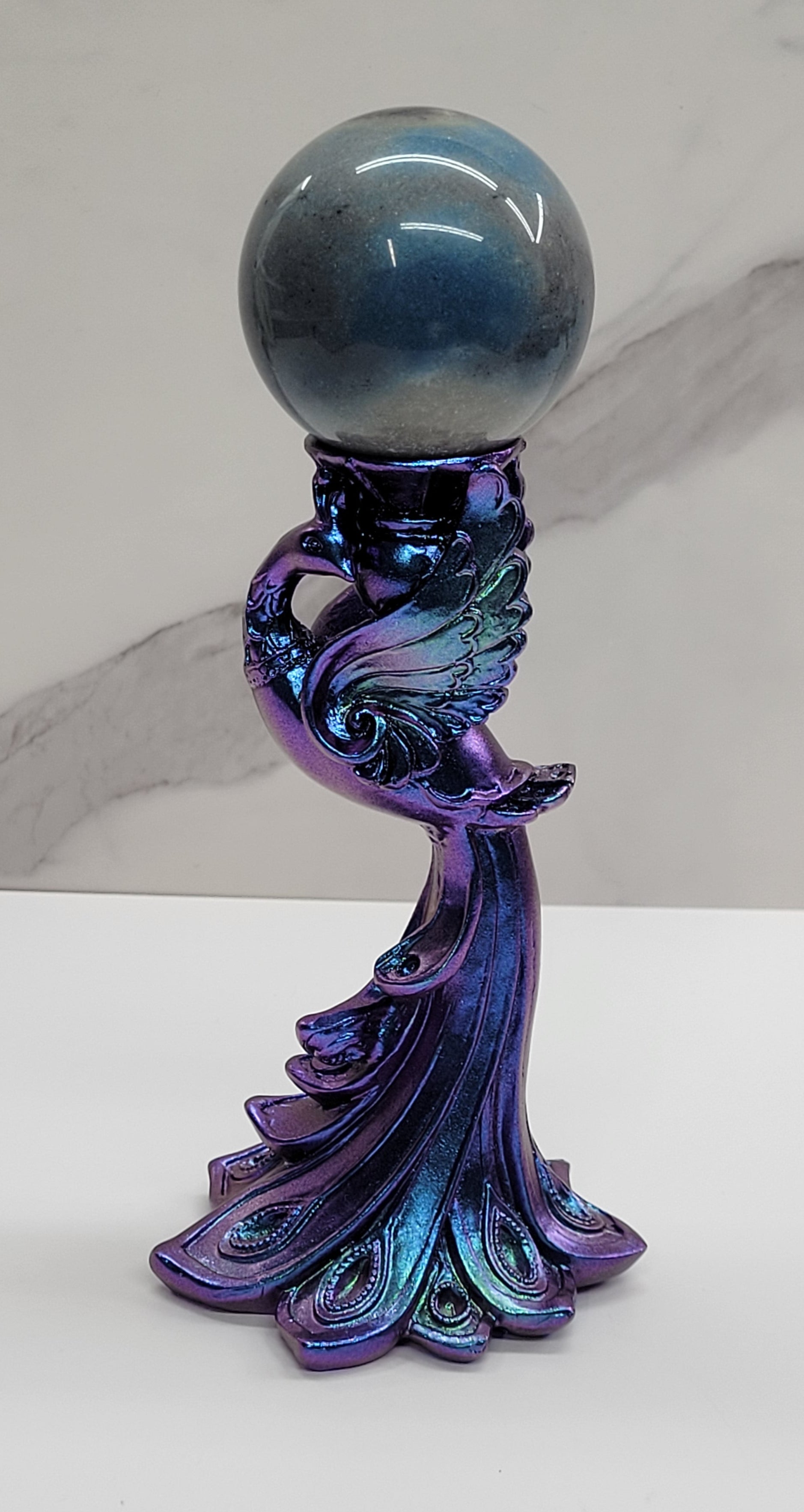 Peacock sphere stand/holder in Purple/Blue aura. Holds up to a 70mm sphere. Sphere stand measures 7" tall
