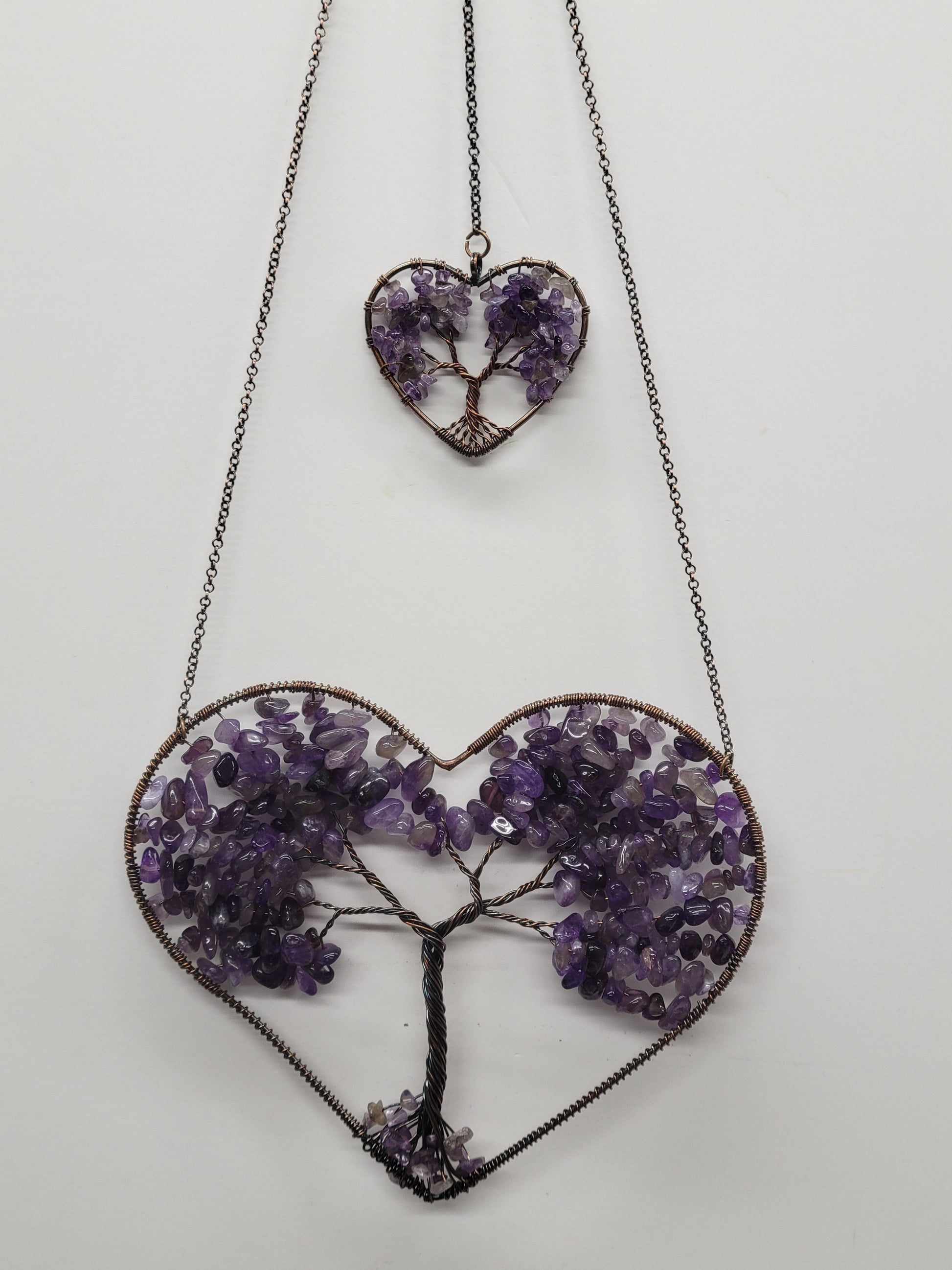 Double heart Tree of Life suncatcher w/ Amethyst chips. Measures 17"