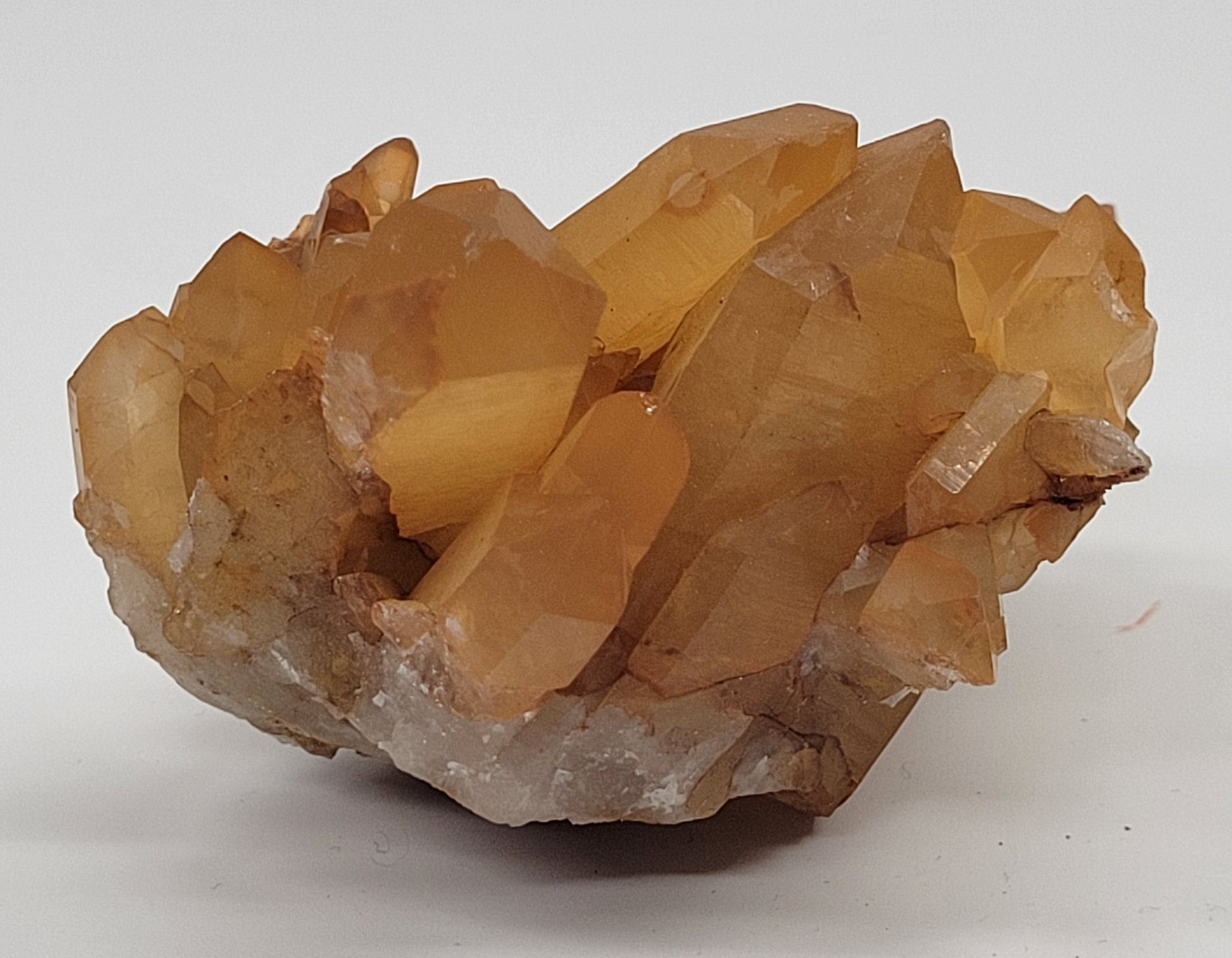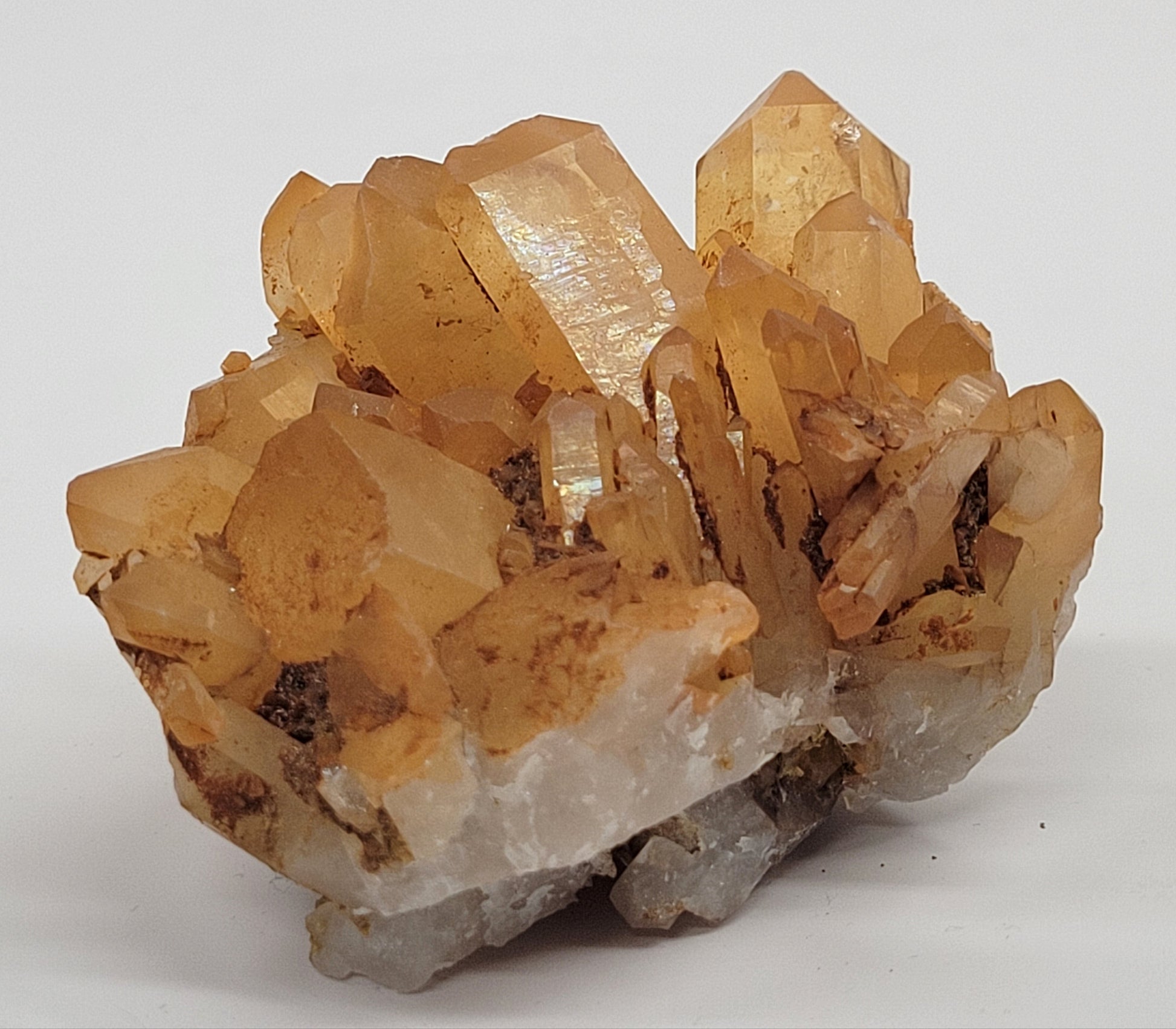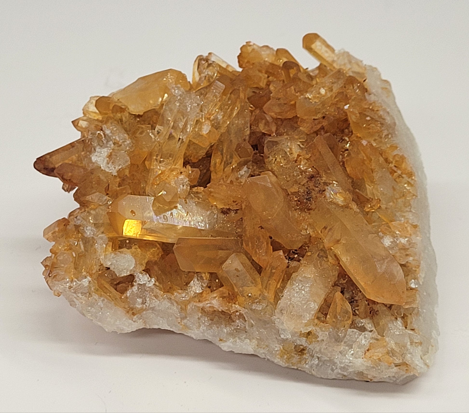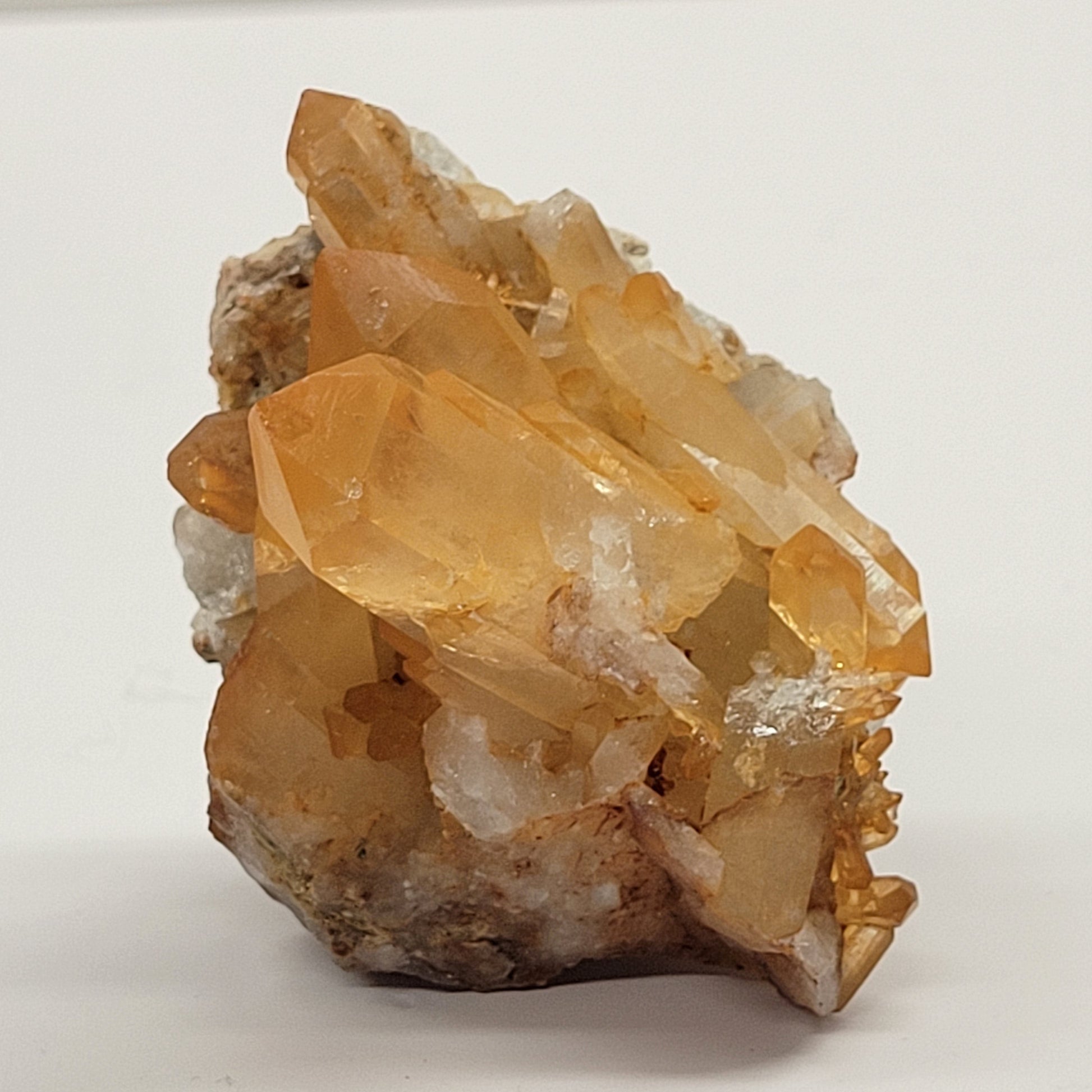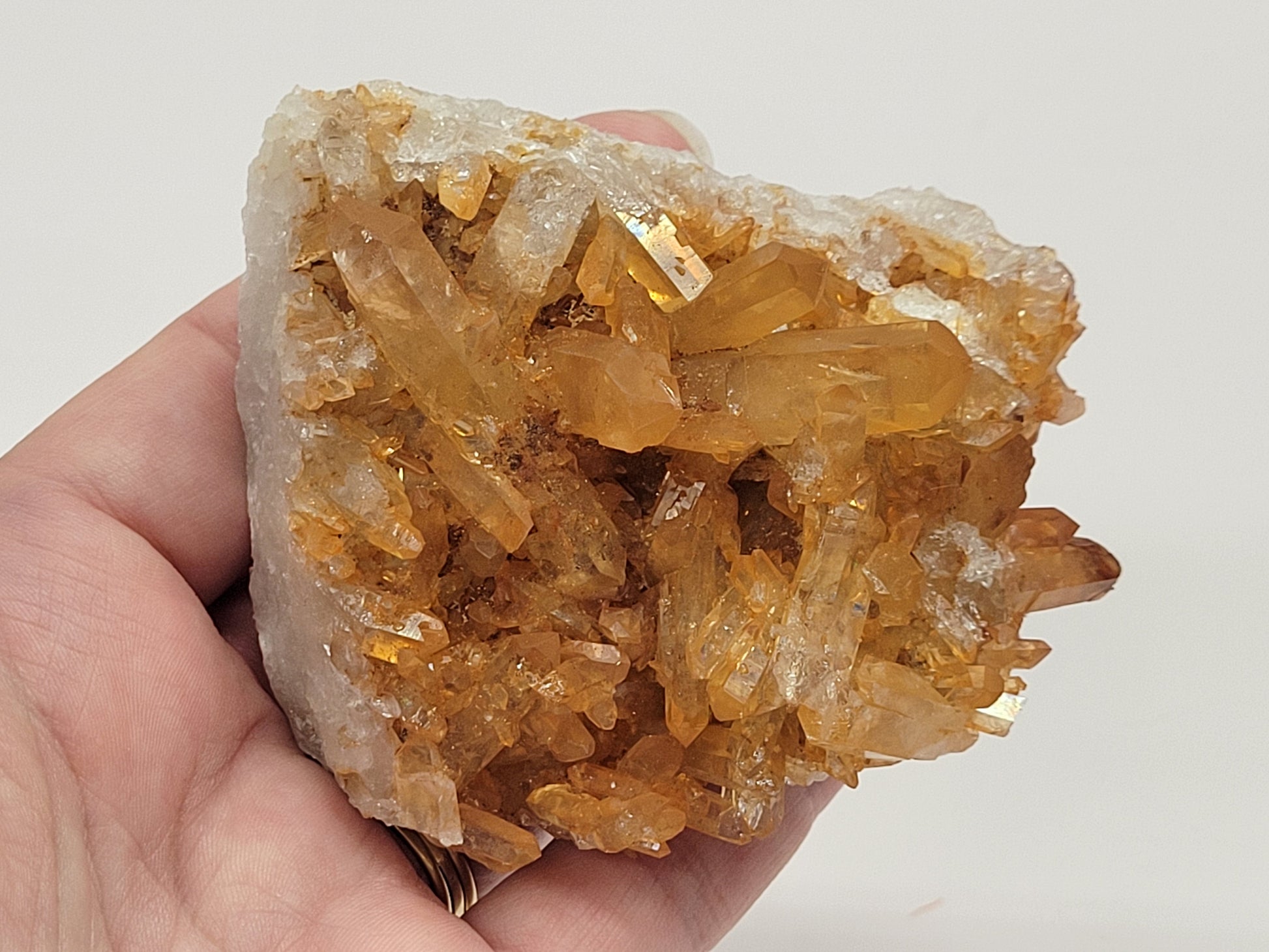 The vibrant orange color of Tangerine Quartz is a result of iron oxide minerals, such as hematite or lepidocrocite, that coat the surface of the quartz crystal. These minerals are typically found in close proximity to the quartz, and they become attached to the crystal through a process known as hydrothermal deposition. This process occurs when hot, mineral-rich water flows through fractures and cavities in the Earth’s crust, depositing minerals on the surfaces of existing crystals. As the water cools and evaporates, the minerals become concentrated, forming a thin layer on the quartz’s surface.