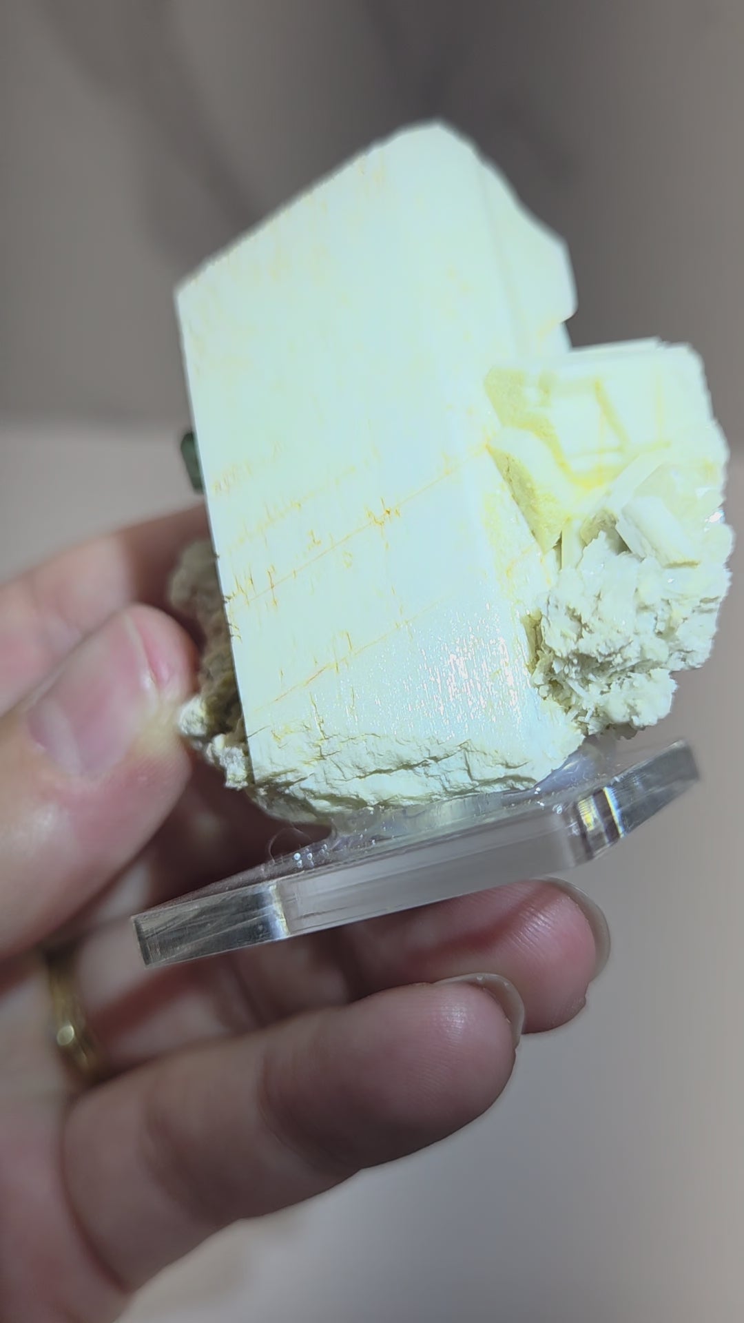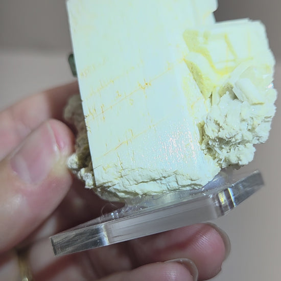 Terminated Feldspar with a few cubes of Fluorite. Beautiful chatoyancy.