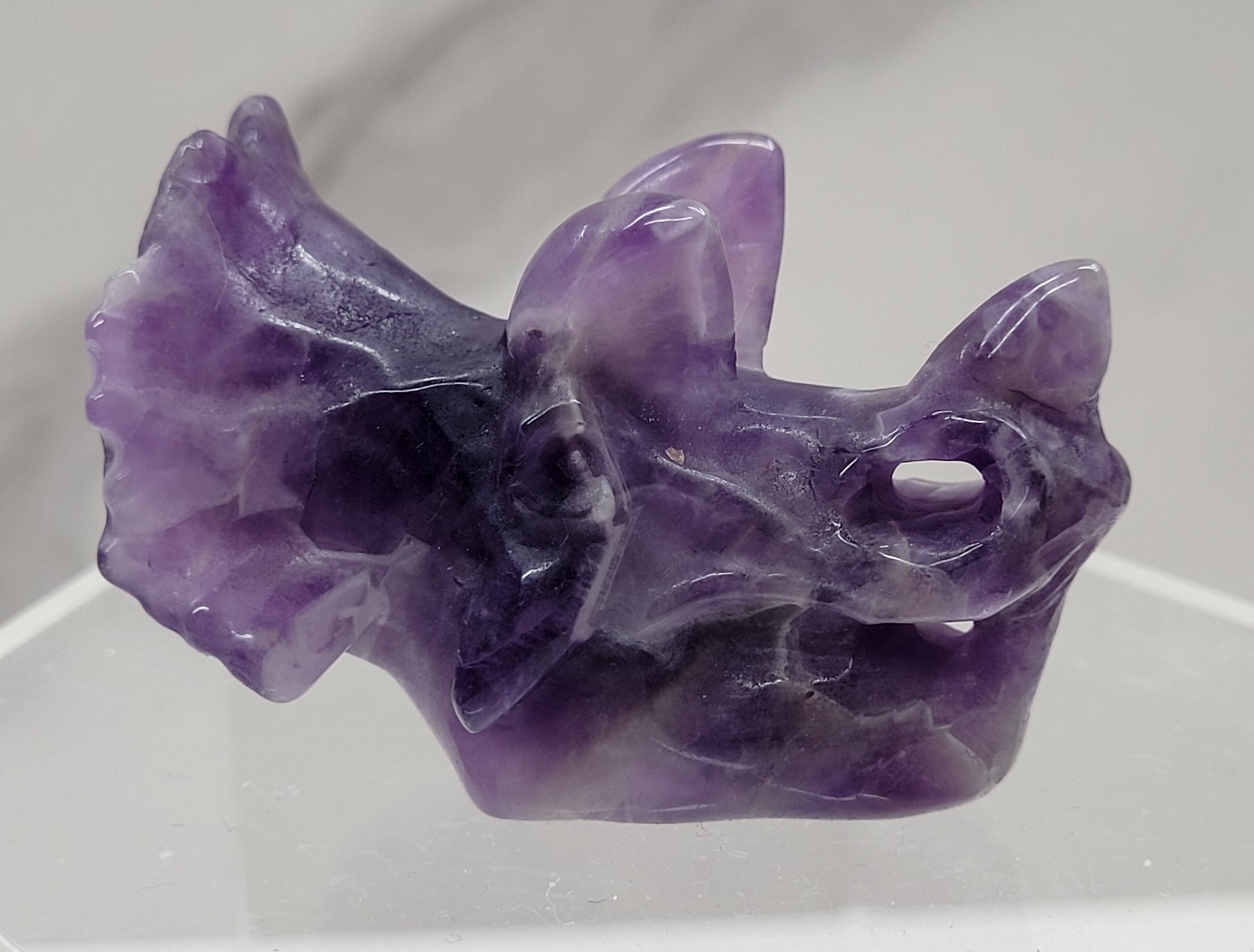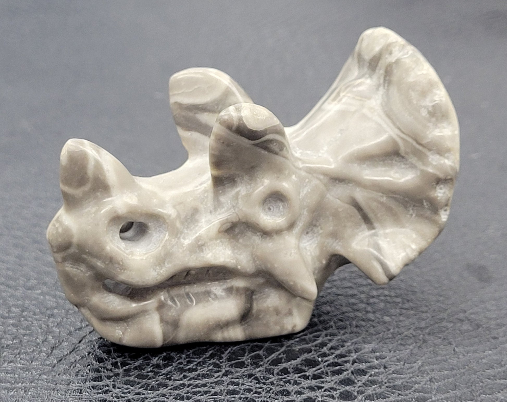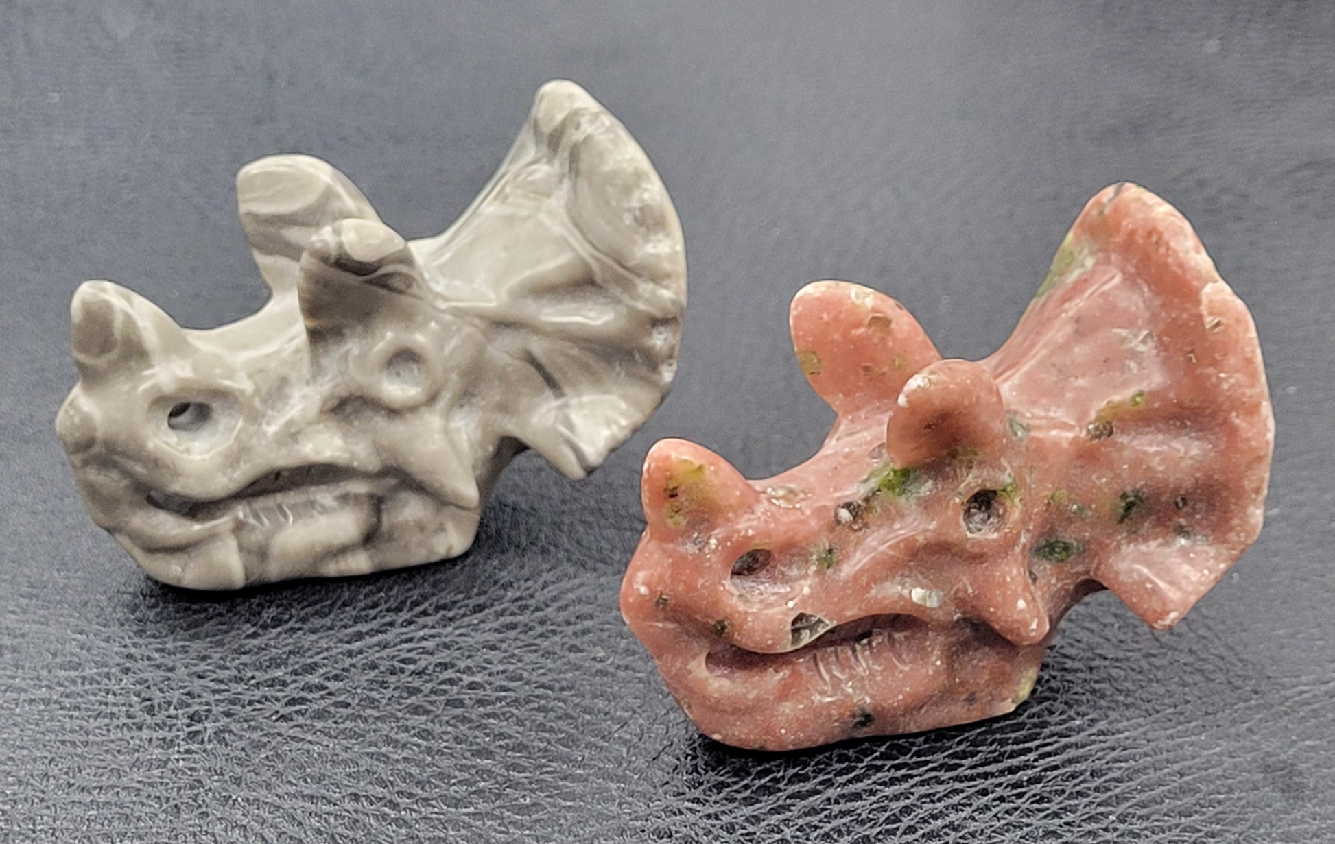 Triceratops skull carvings in a variety of materials. Each skull measures approx. 2.25" x 2"