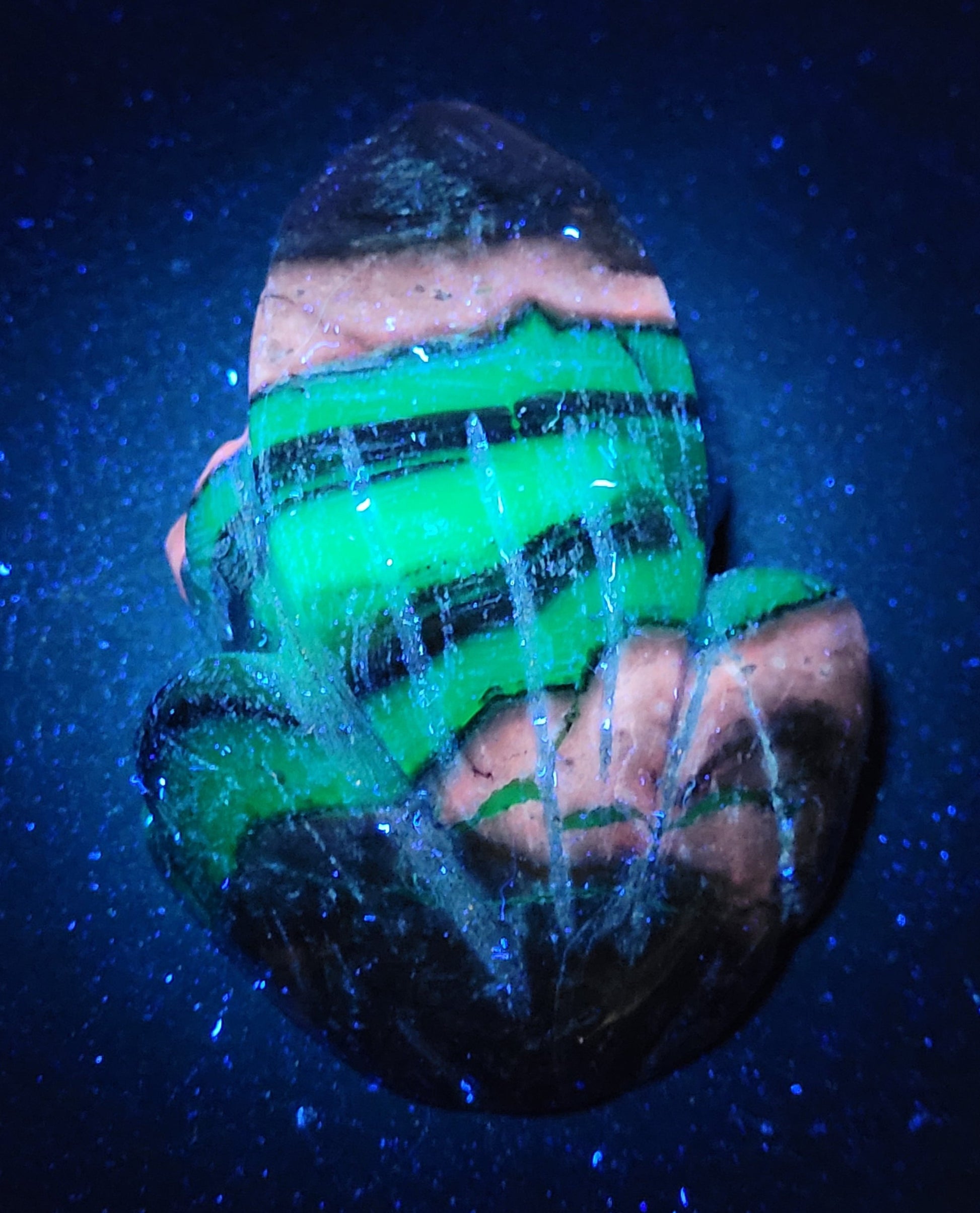 Agates are most commonly found as nodules within the cavities of volcanic rocks. These cavities are formed from the gases trapped within the liquid volcanic material forming vesicles. UV reactive.