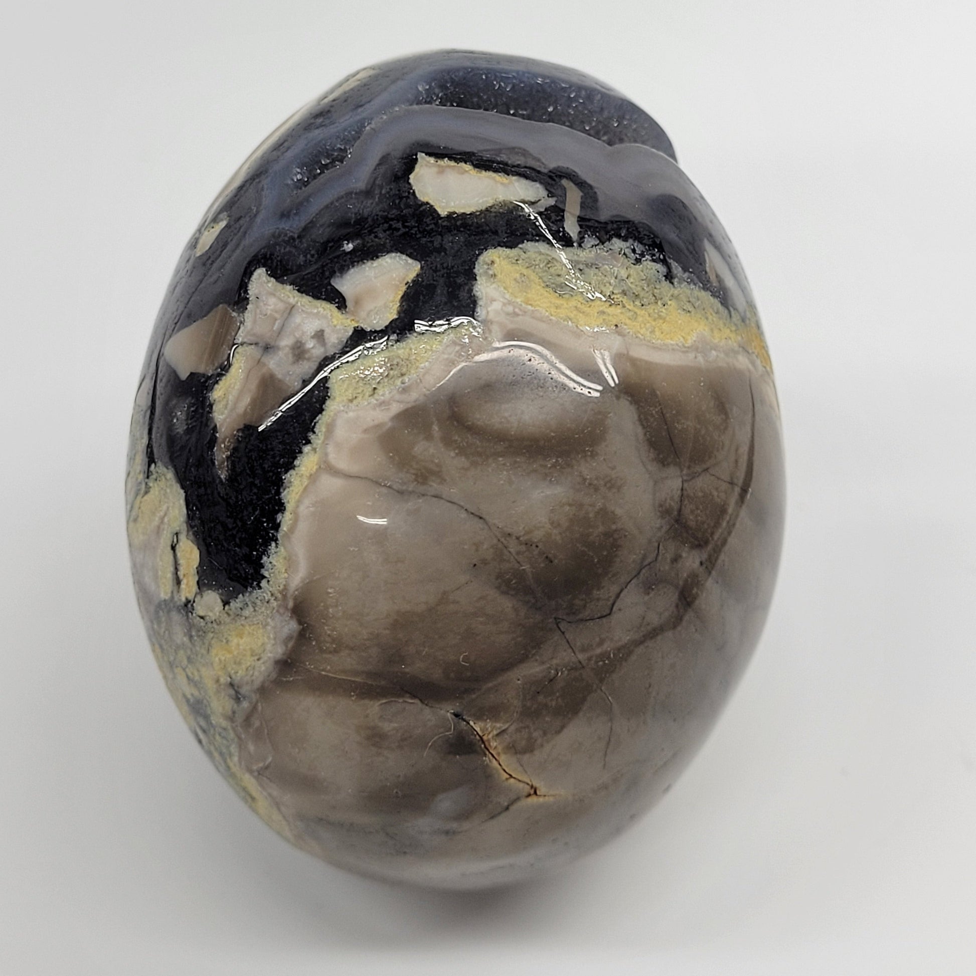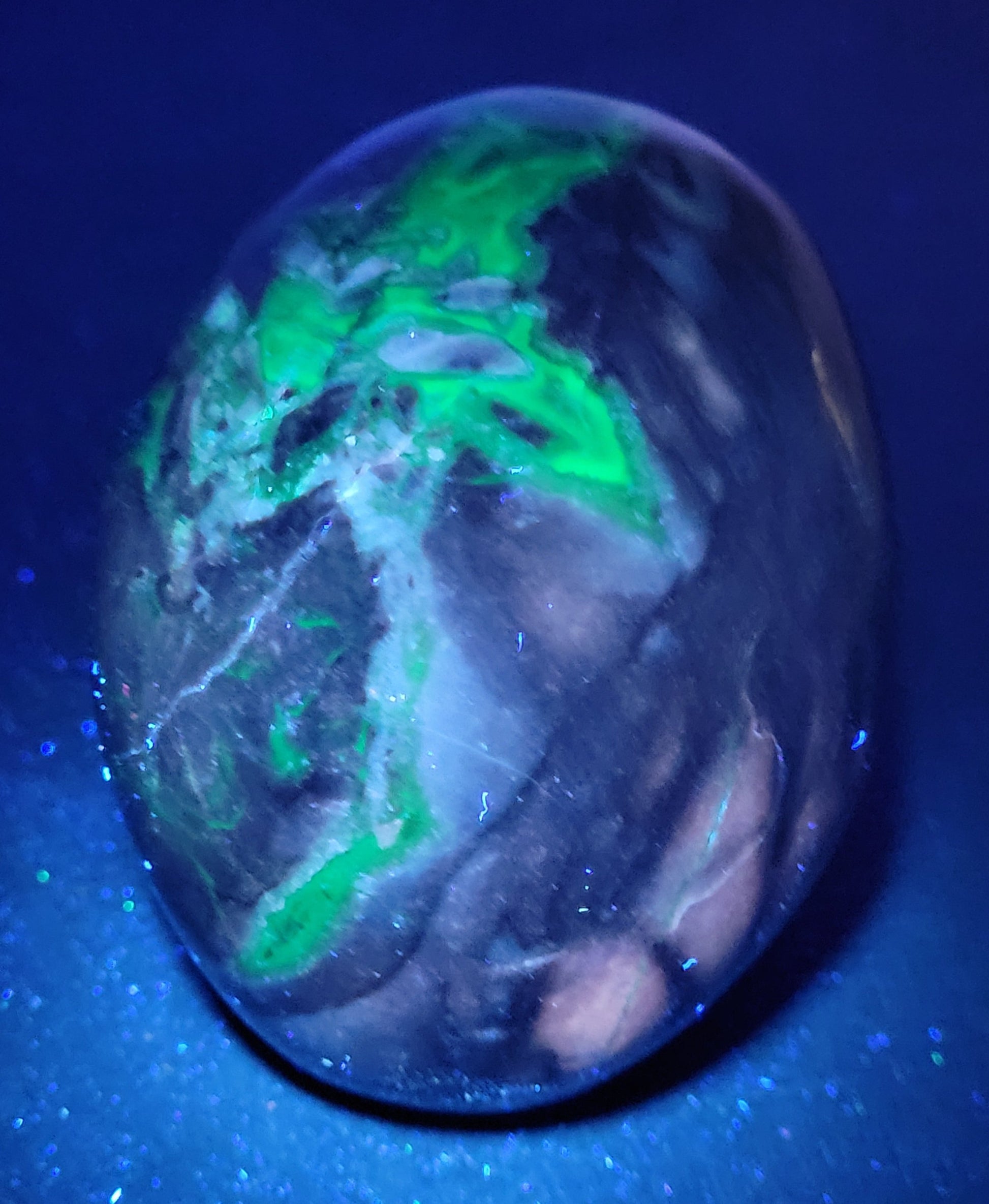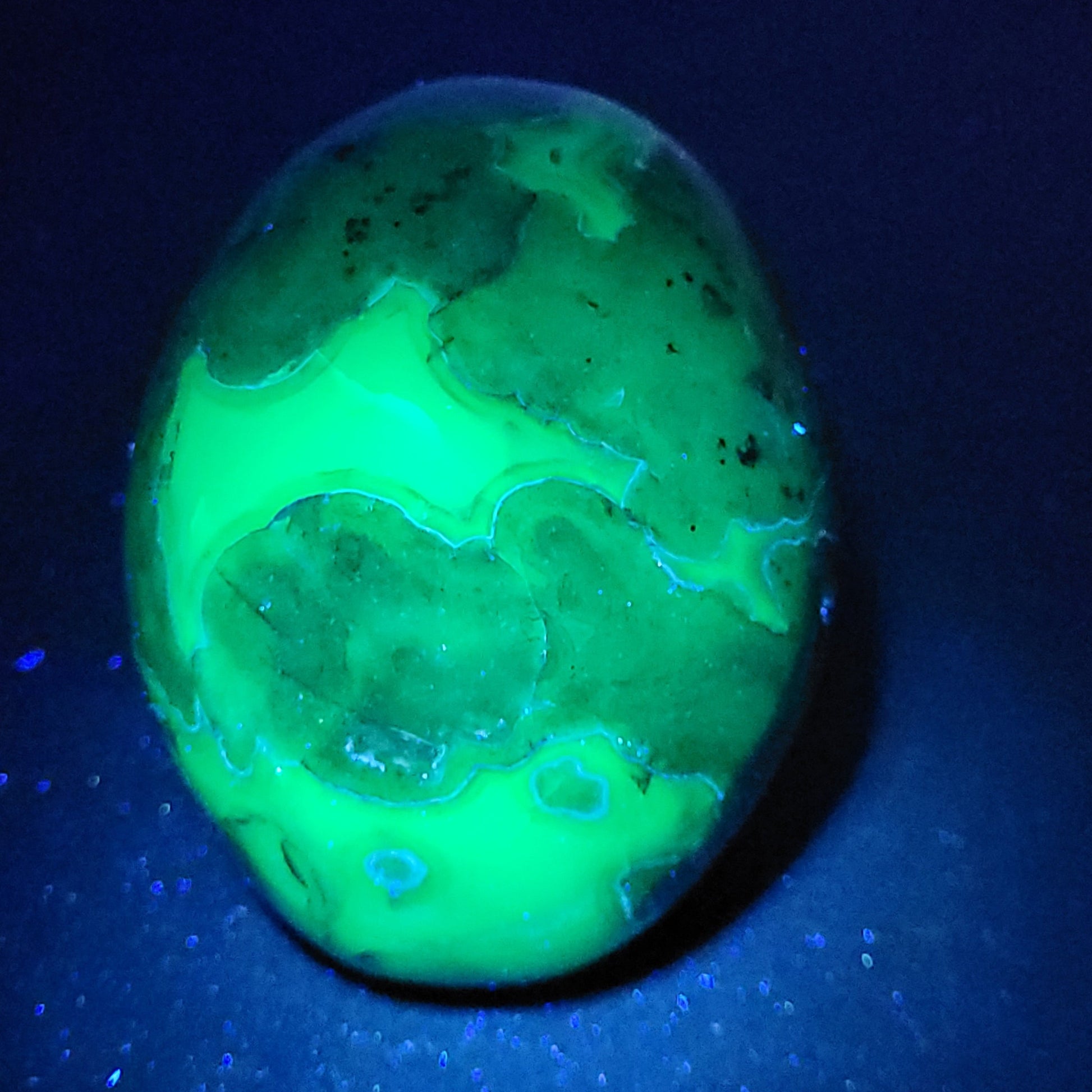 Agates are most commonly found as nodules within the cavities of volcanic rocks. These cavities are formed from the gases trapped within the liquid volcanic material forming vesicles. UV reactive.