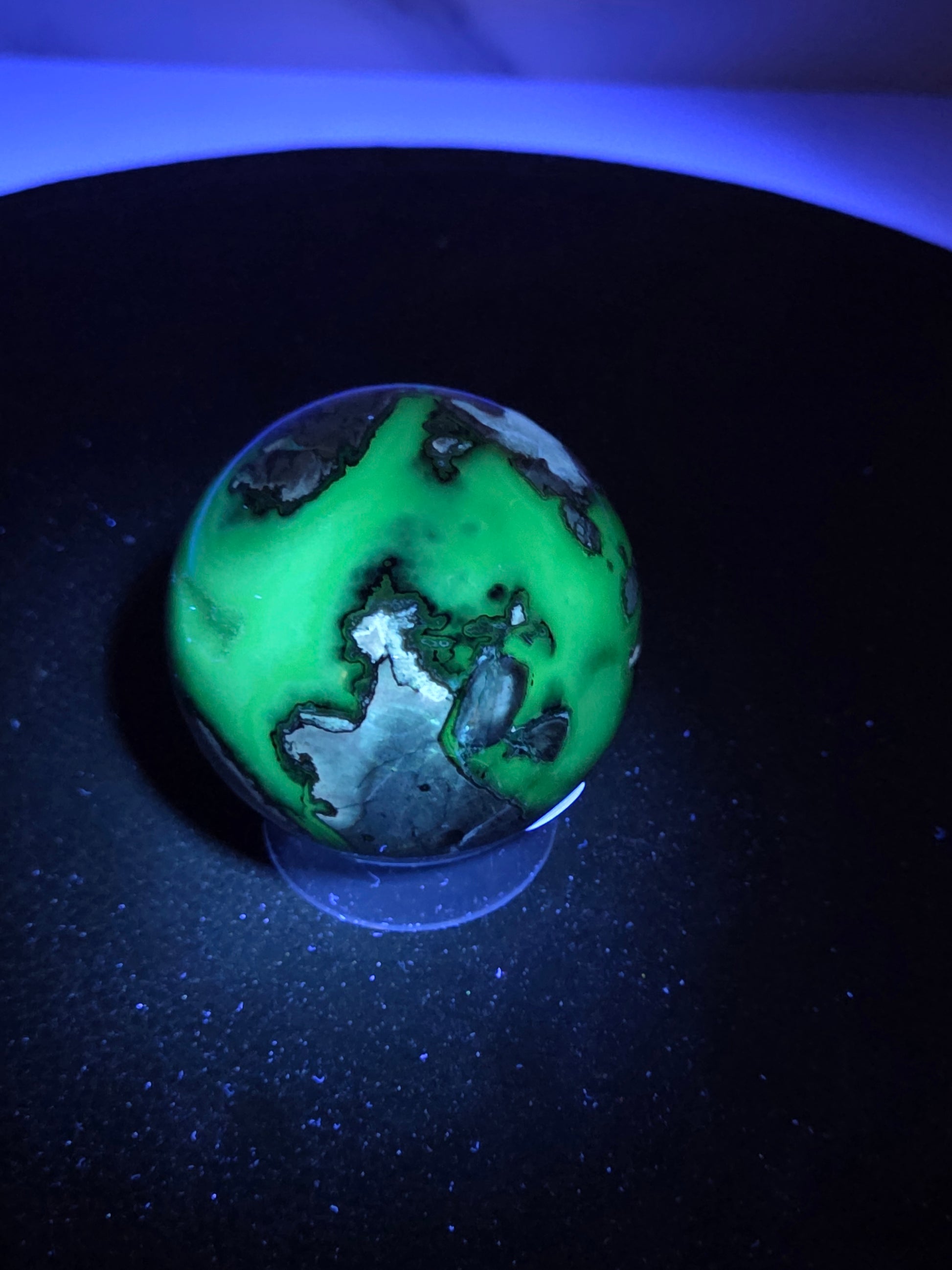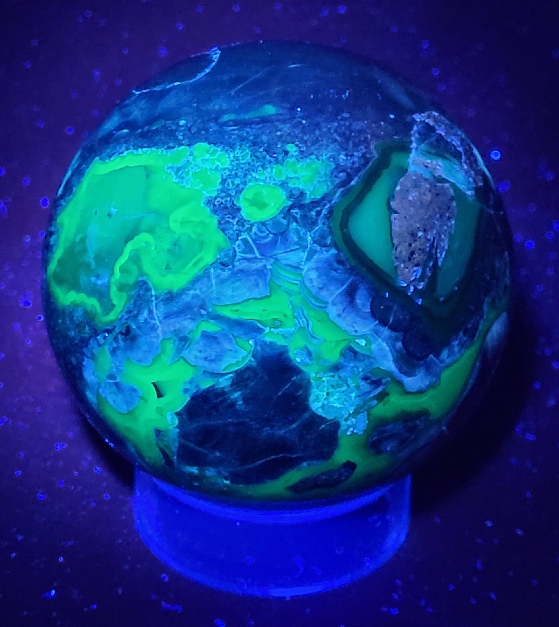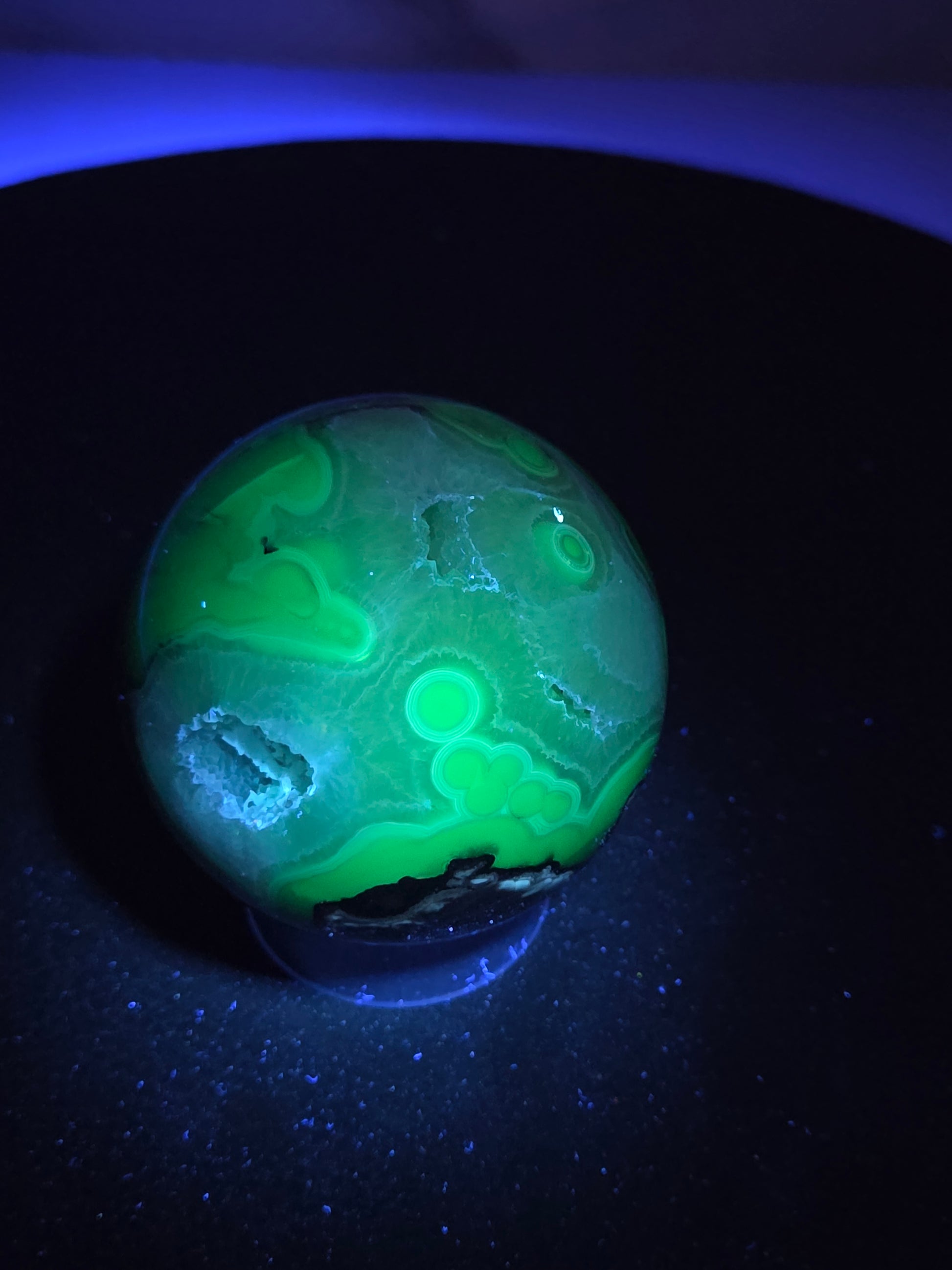 Agates are most commonly found as nodules within the cavities of volcanic rocks. These cavities are formed from the gases trapped within the liquid volcanic material forming vesicles. UV reactive.
