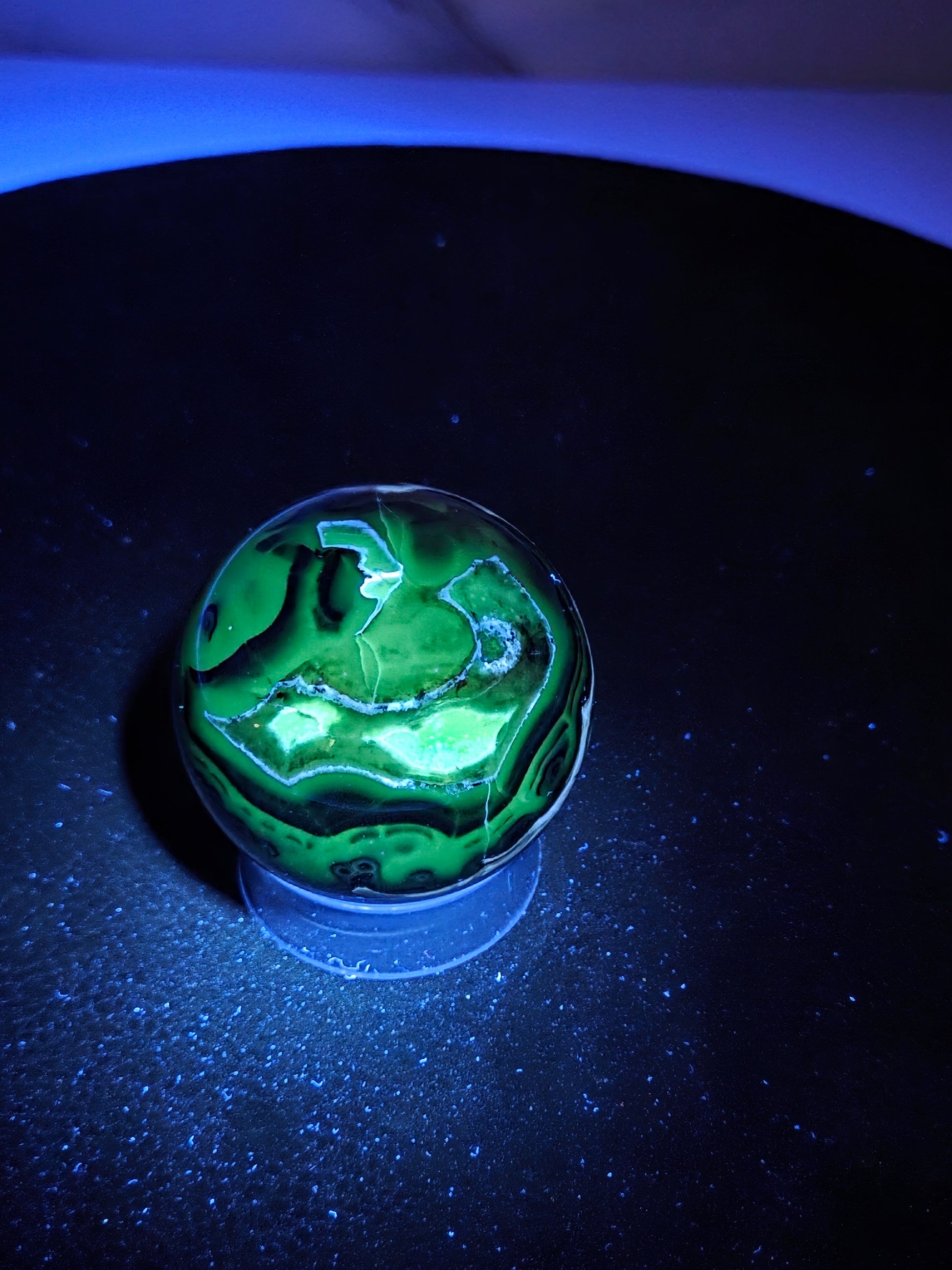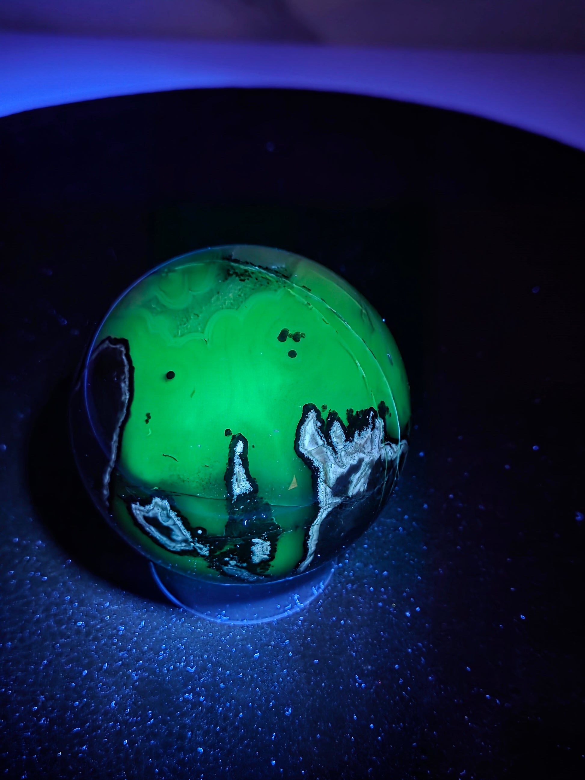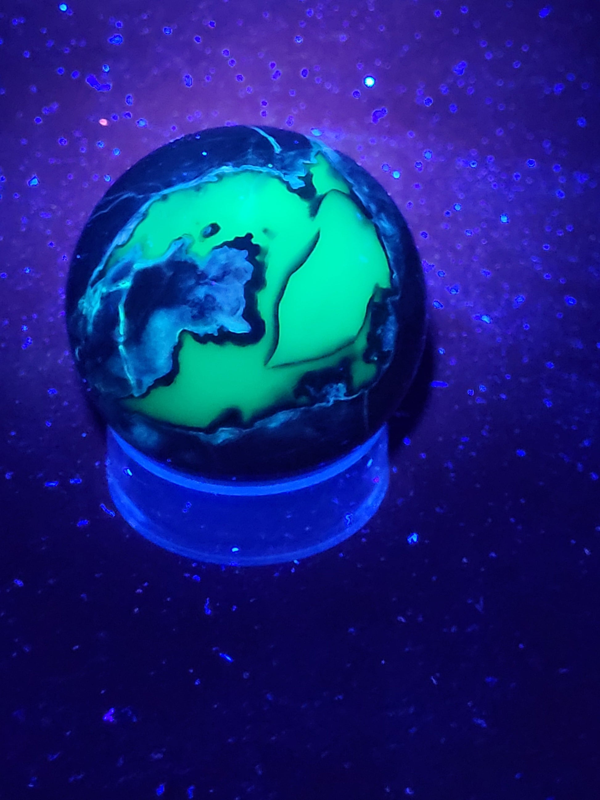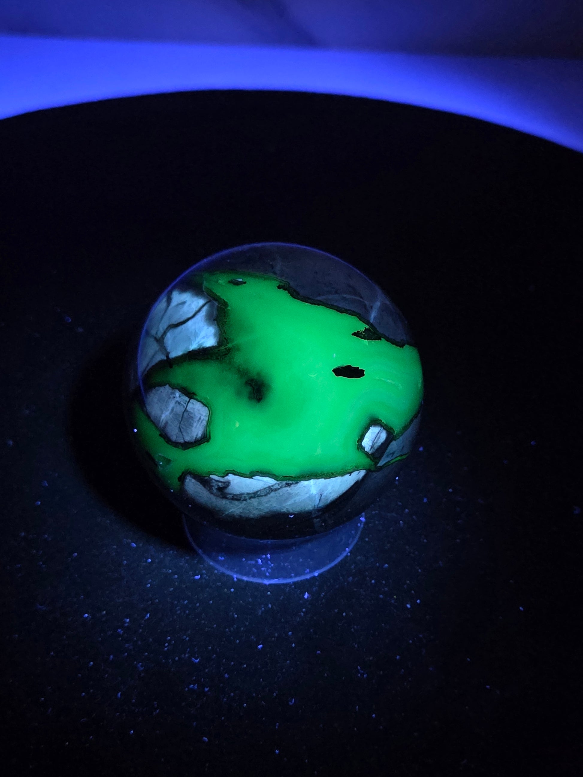 Agates are most commonly found as nodules within the cavities of volcanic rocks. These cavities are formed from the gases trapped within the liquid volcanic material forming vesicles. UV reactive.