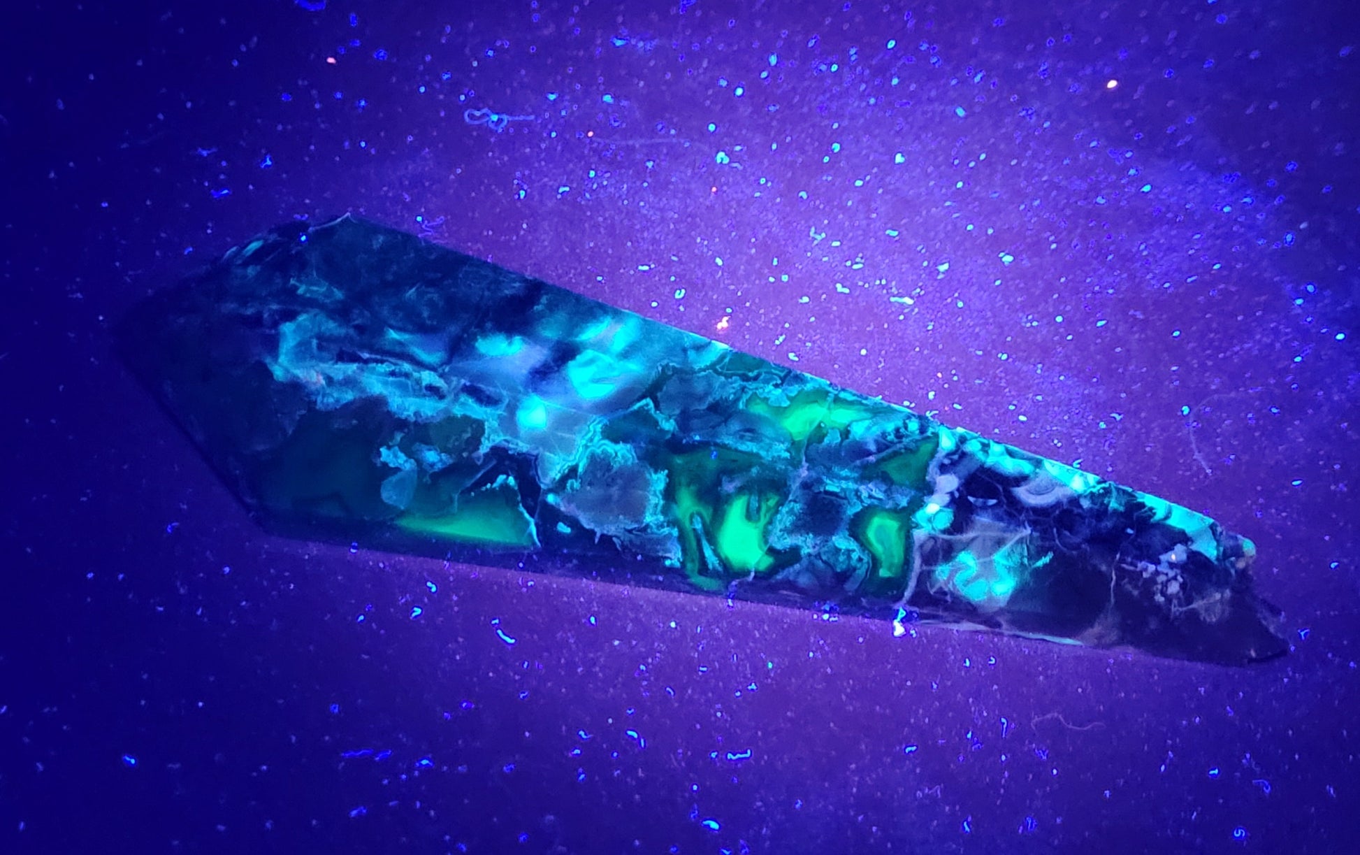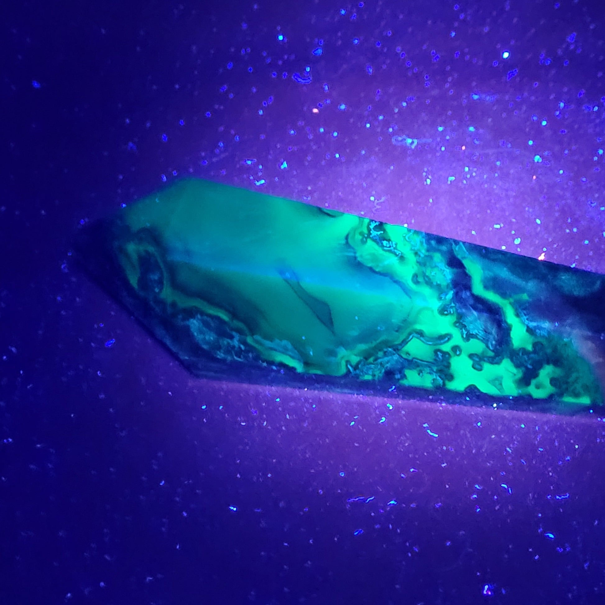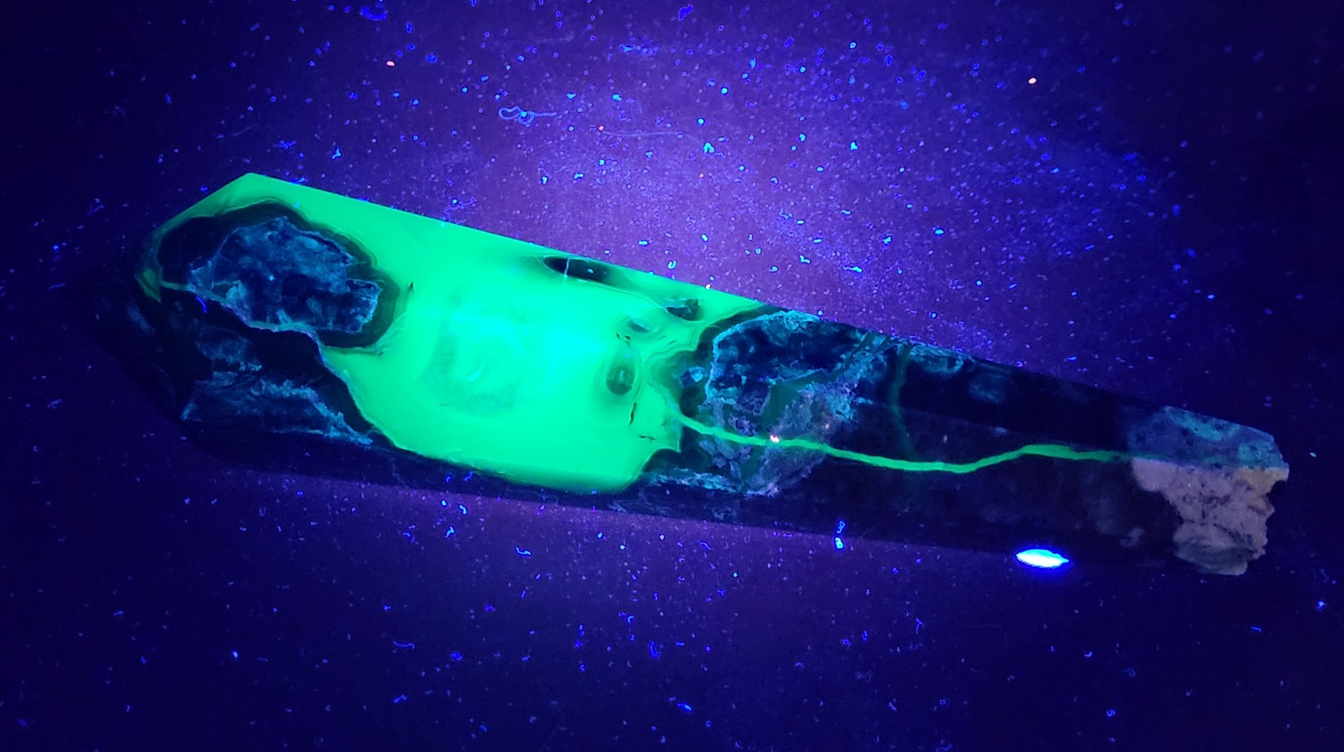 Agates are most commonly found as nodules within the cavities of volcanic rocks. These cavities are formed from the gases trapped within the liquid volcanic material forming vesicles. UV reactive.