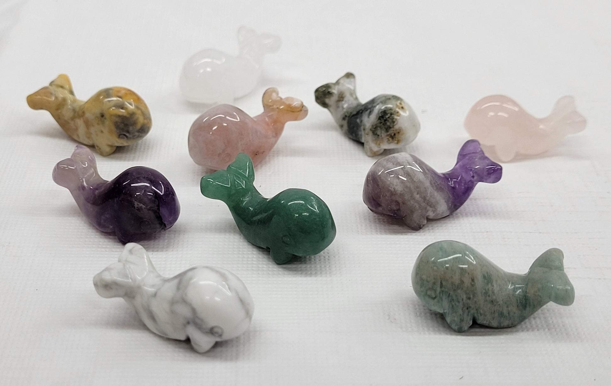 Mini/small whale carvings in a variety of materials. Each whale measures 1.25". Random pick