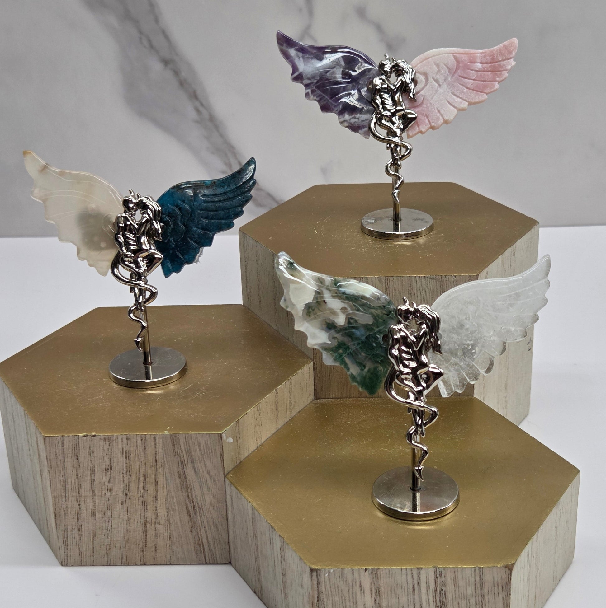 Obsidian & White Jade w/ rose gold stand: wings1.5" x .75", wingspan 2", height 3"