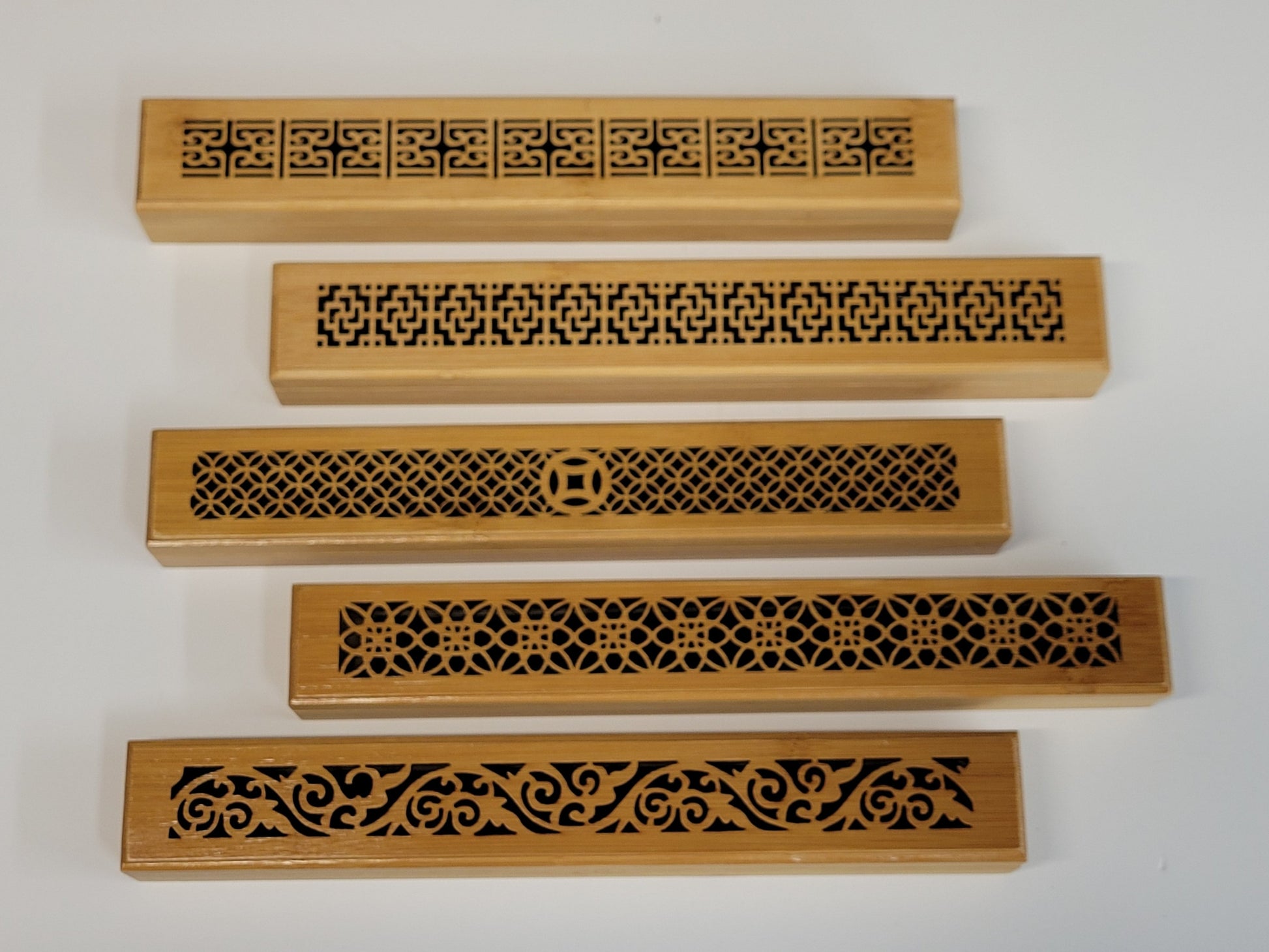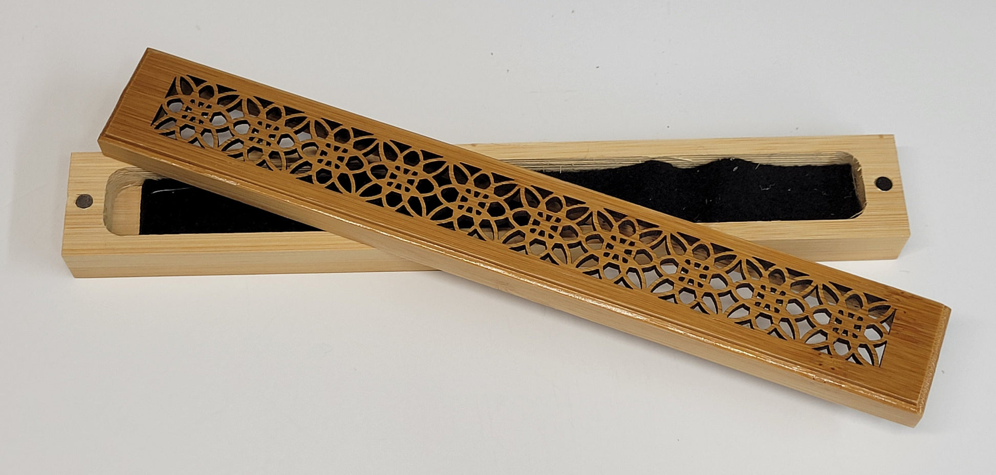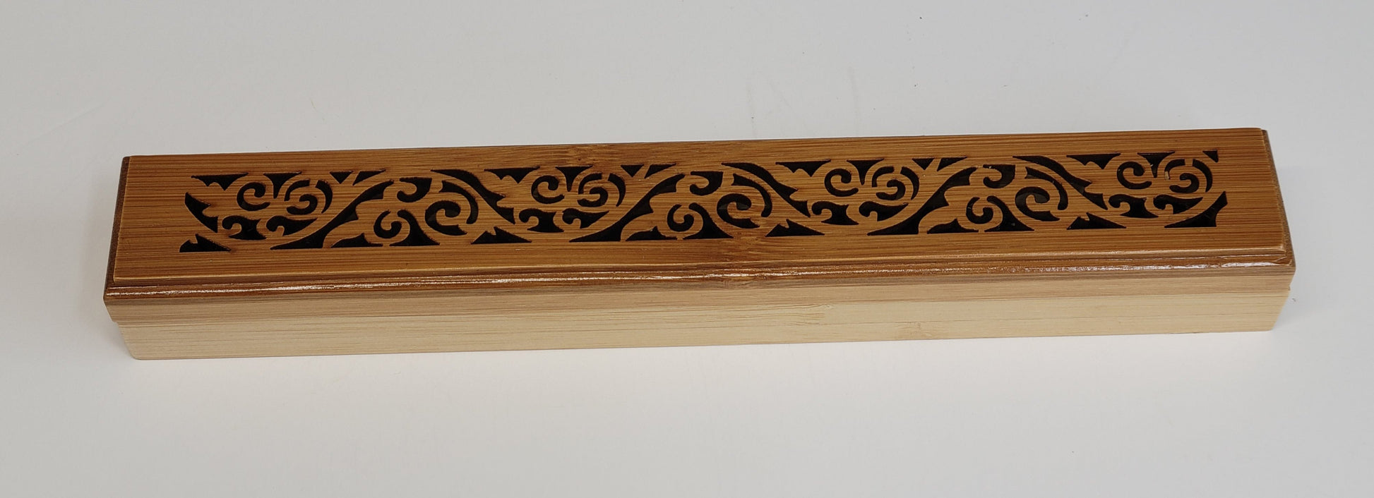 Beautiful wooden incense coffins that hold incense sticks or cones. Choose from a few different designs. Each coffin measures 9" long