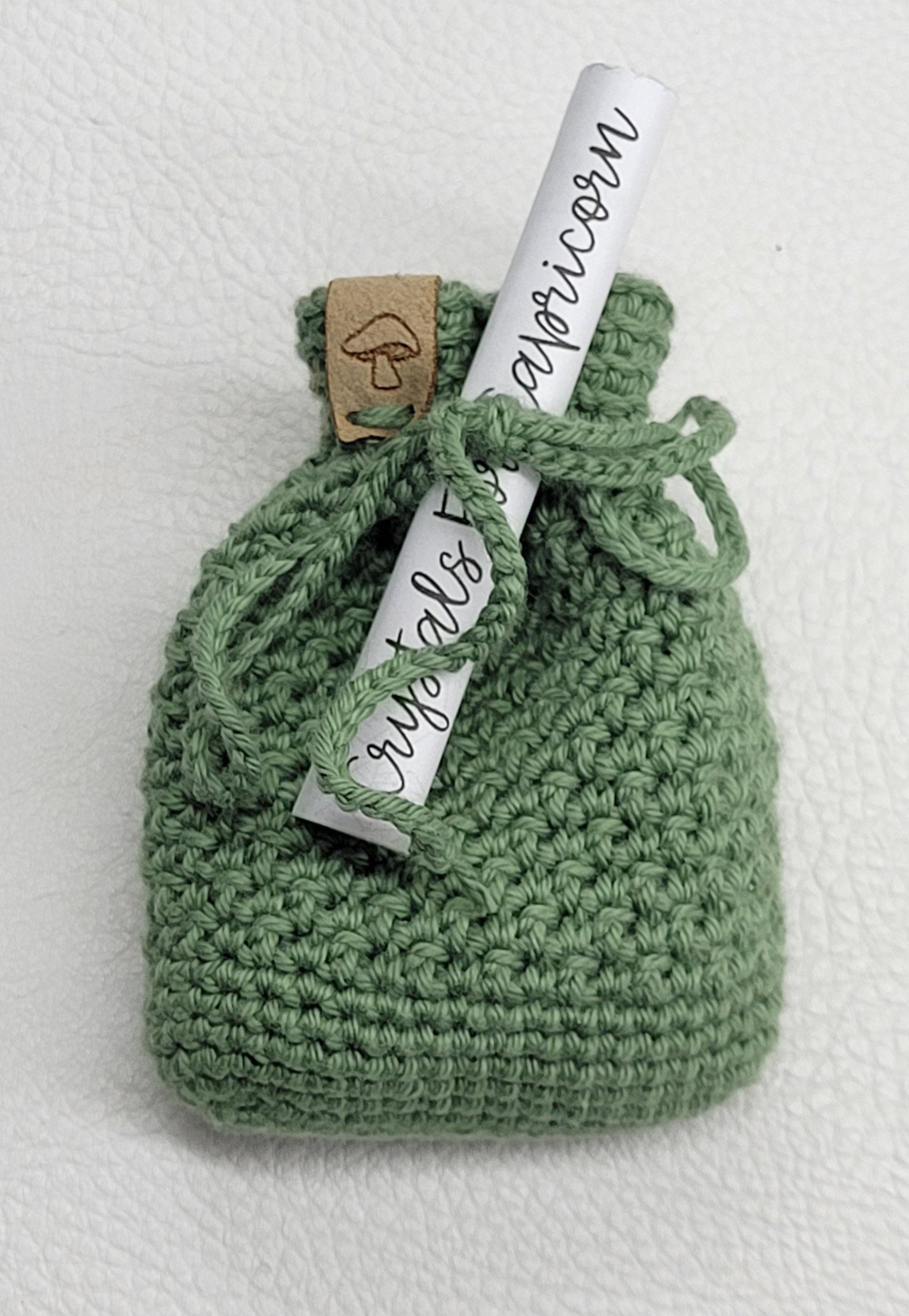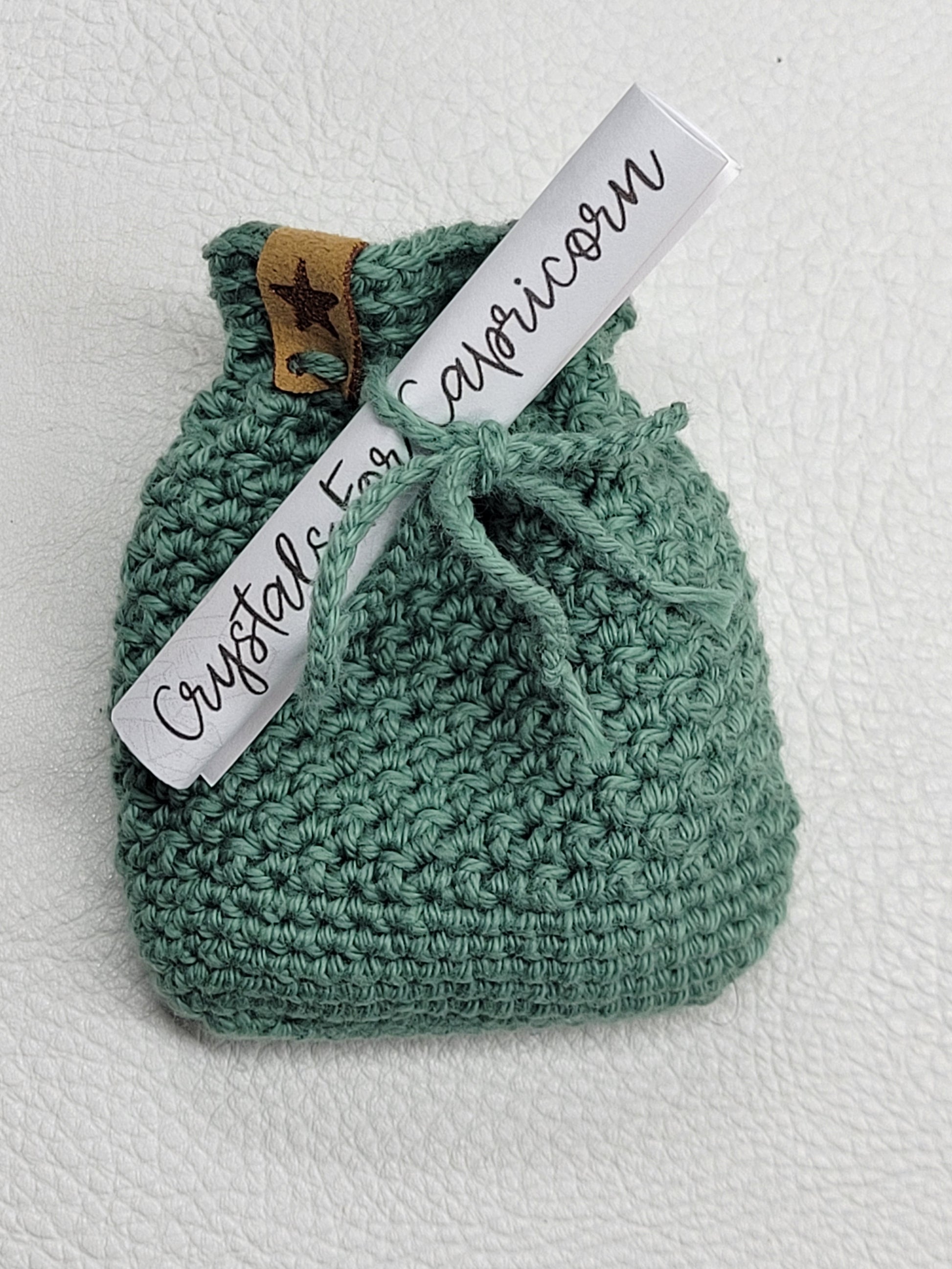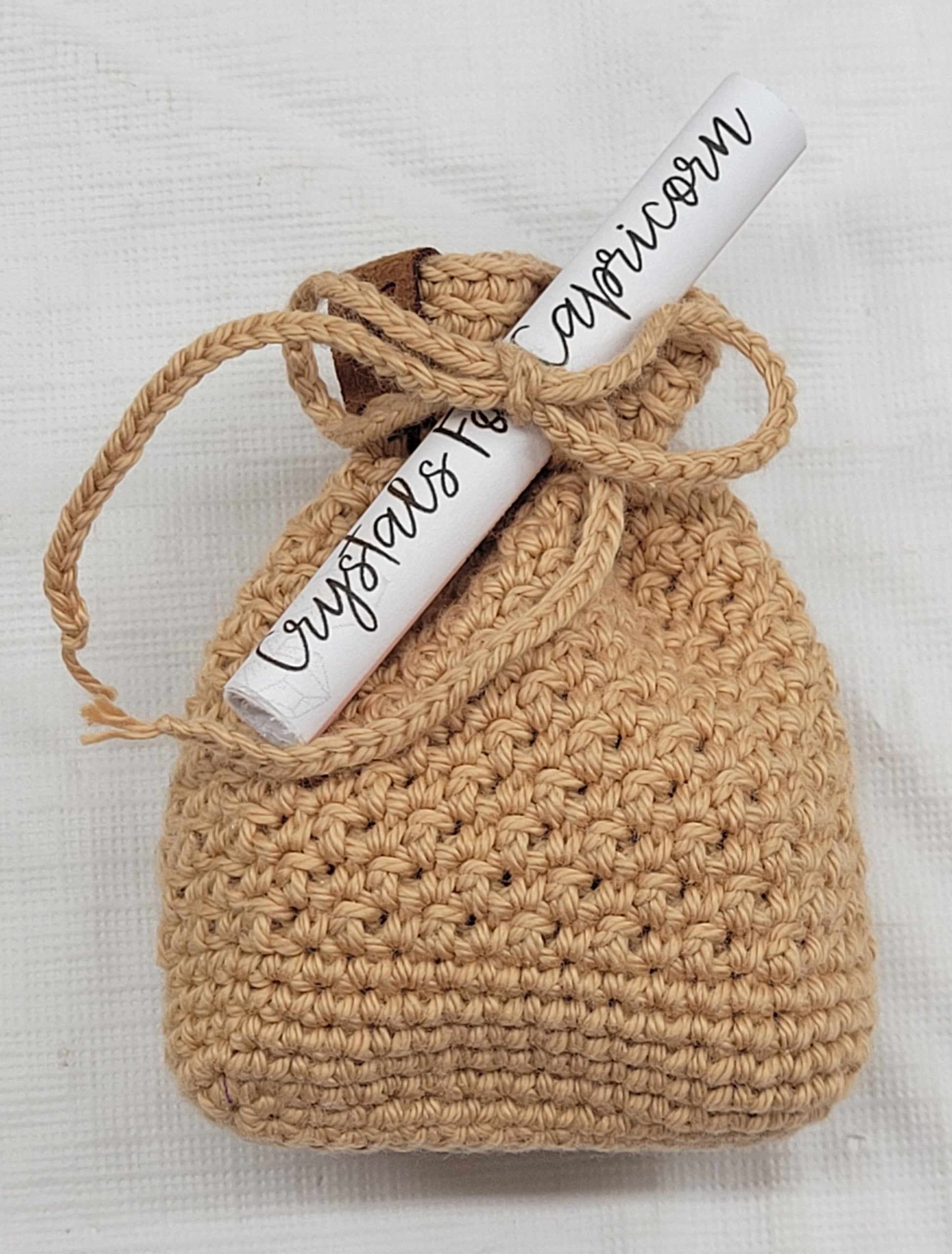 Zodiac tumble bags come with 4 tumbles, an adorable hand crocheted bag and a scroll explaining the metaphysical properties of the tumbles.
