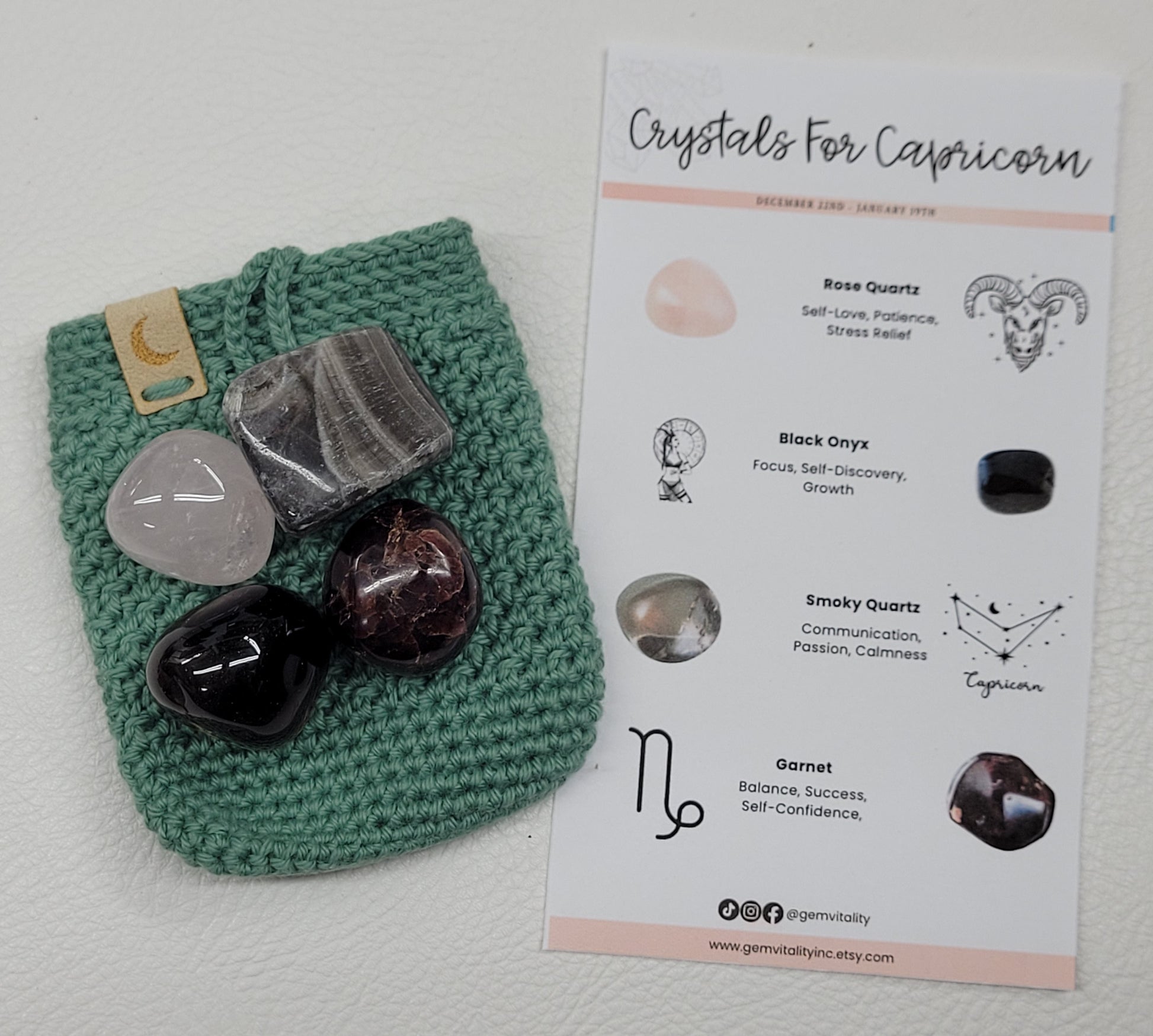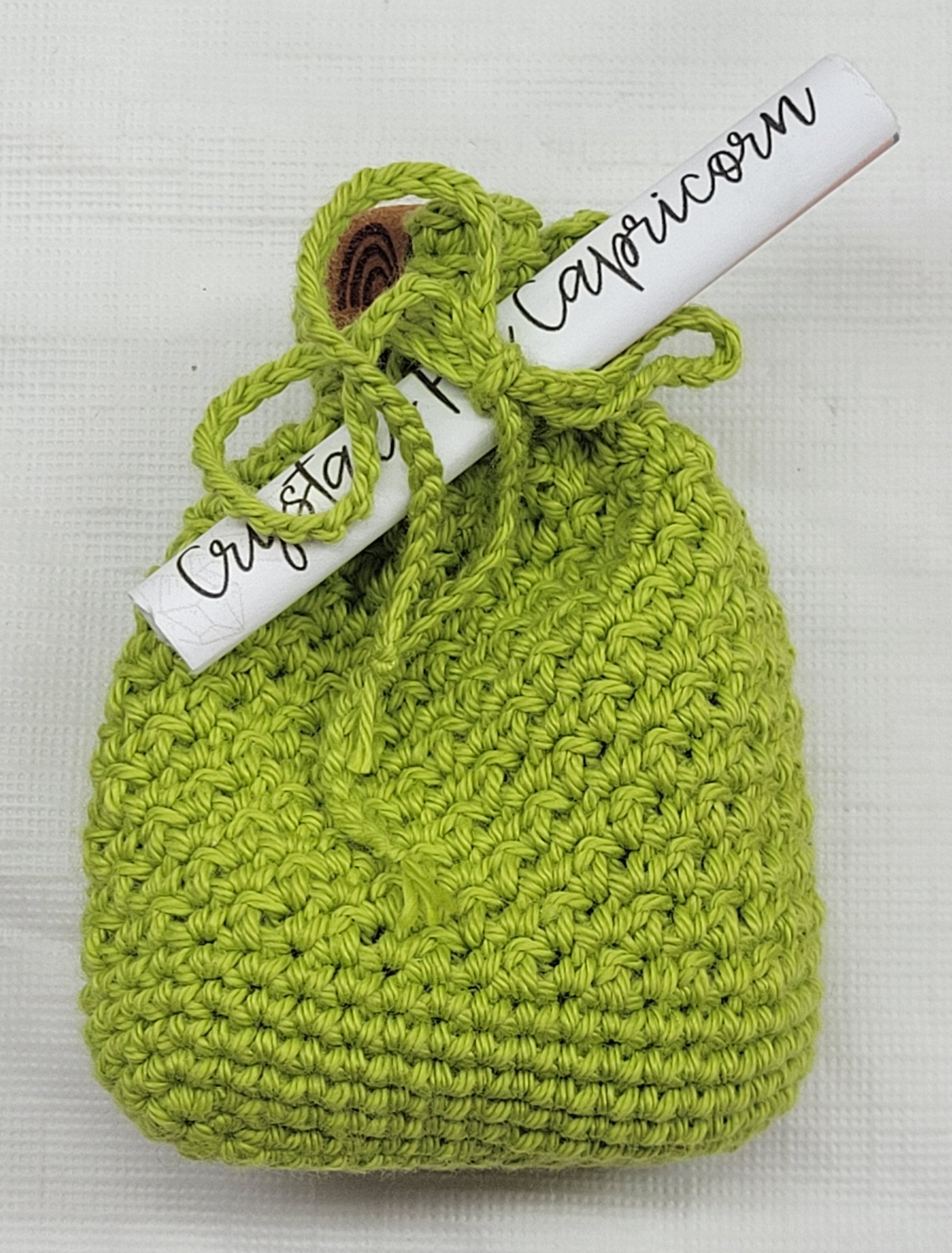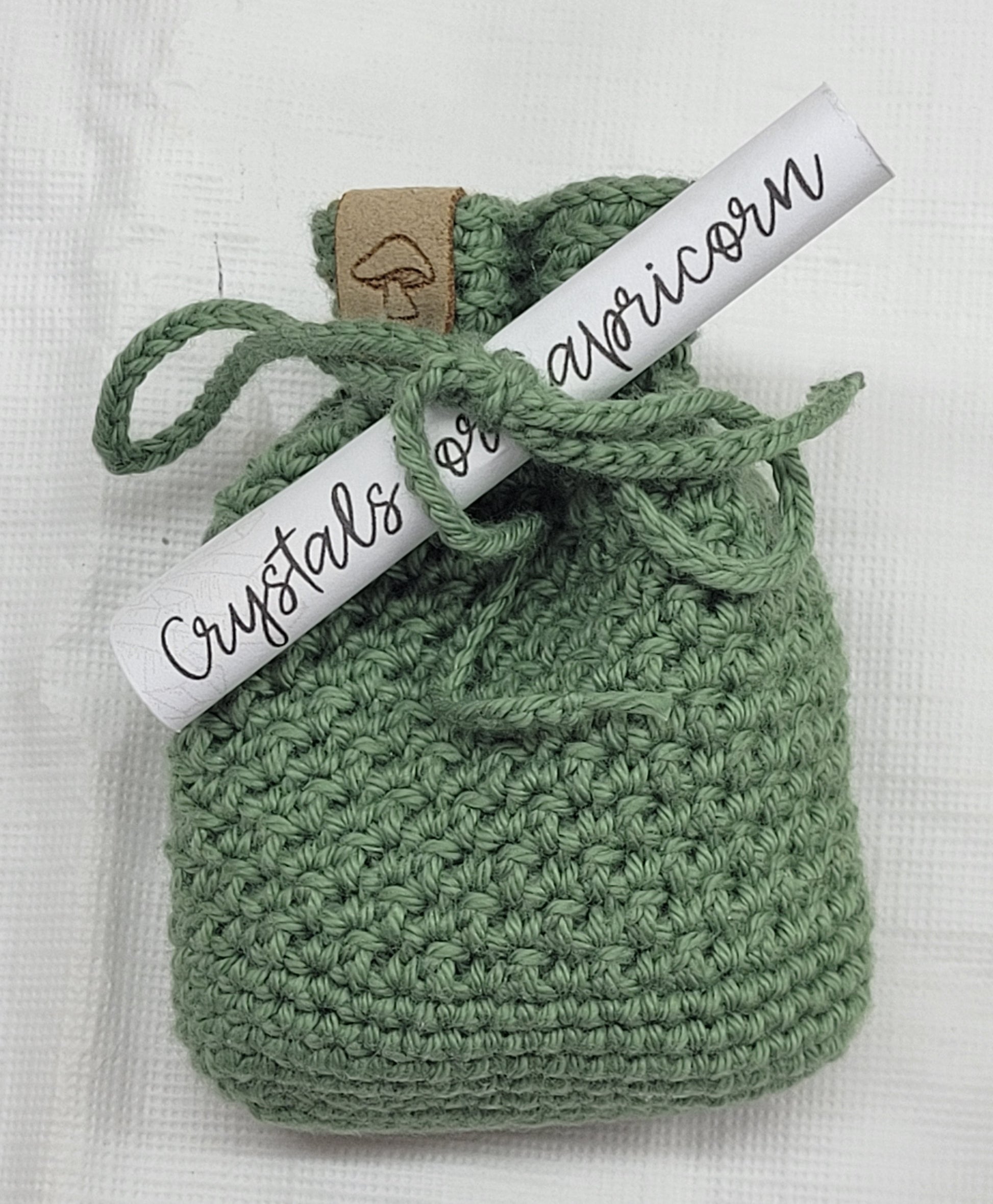 Zodiac tumble bags come with 4 tumbles, an adorable hand crocheted bag and a scroll explaining the metaphysical properties of the tumbles.